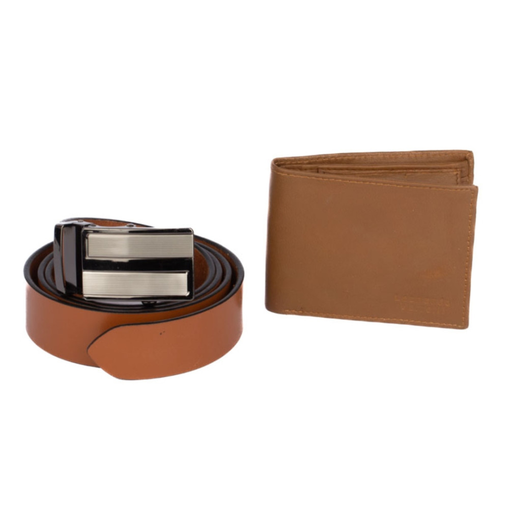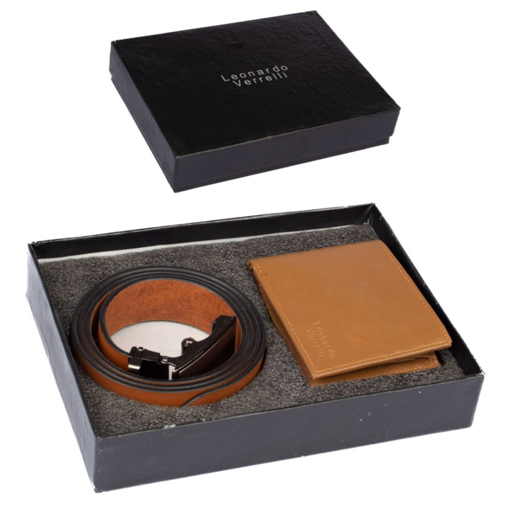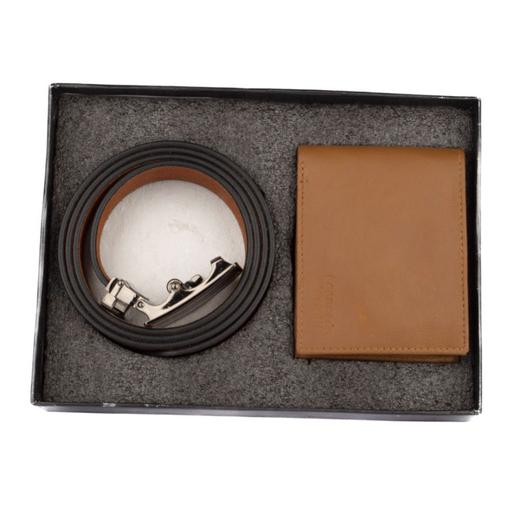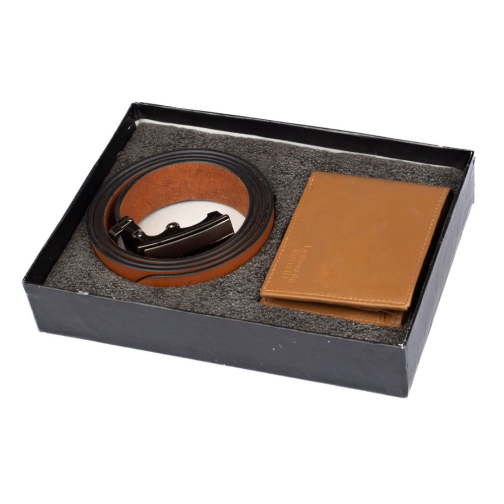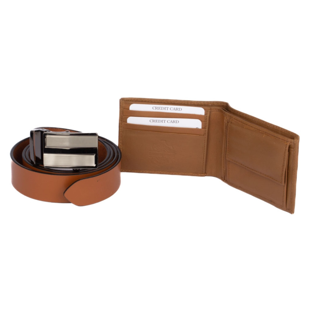 Luxusní pánská kožená peněženka z velmi jemné kůže na dotek. V peněžence najdete vše podstatné, má kapsy na karty, bankovky i mincovník. Udělejte radost tímto netradičním dárkem s tradičním obsahem. Světle hnědý kožený pásek i peněženka jsou vyrobeny z pravé kůže. Pásek nemá klasické dírky a lze jej nastavit na jakoukoli délku.