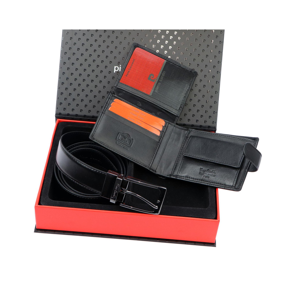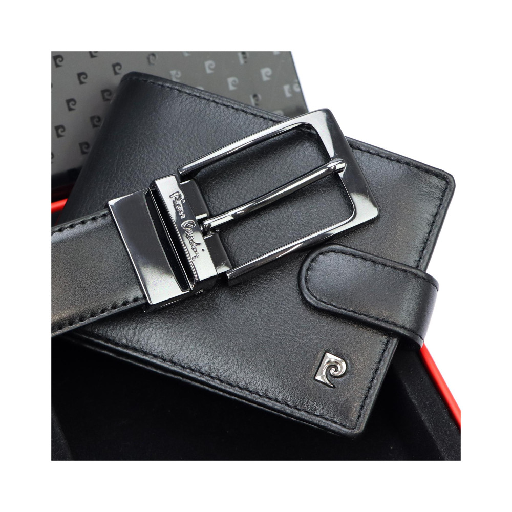 Pánská kožená peněženka se uzavírá klopou s pevným drukem. Pod klopou najdete dostatek kapes na platební karty, velké kapsy na bankovky a menší kapsu na zip. Velký mincovník má rámové uzavírání a je přístupný bez nutnosti otevřít peněženku. Peněženka je i pásek jsou vyrobeny z pravé kůže černé barvy.