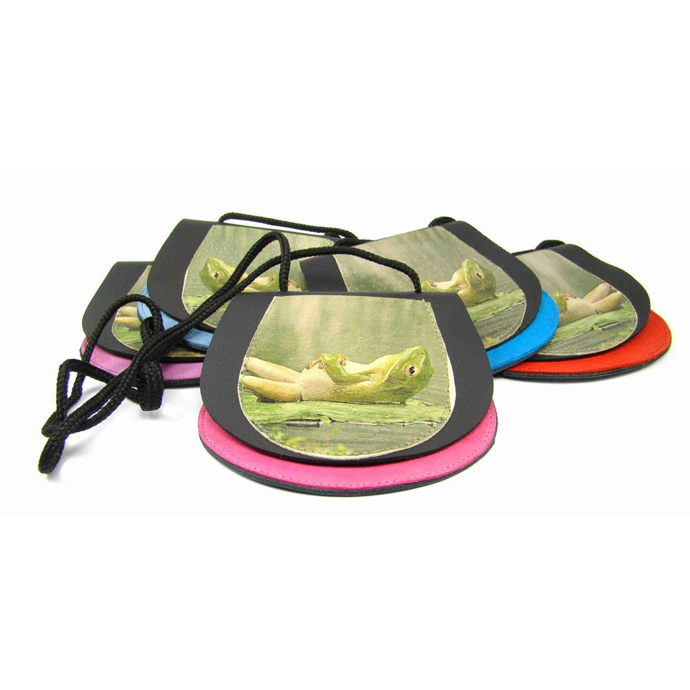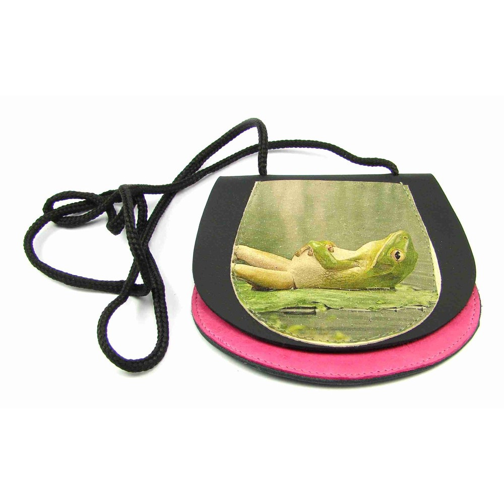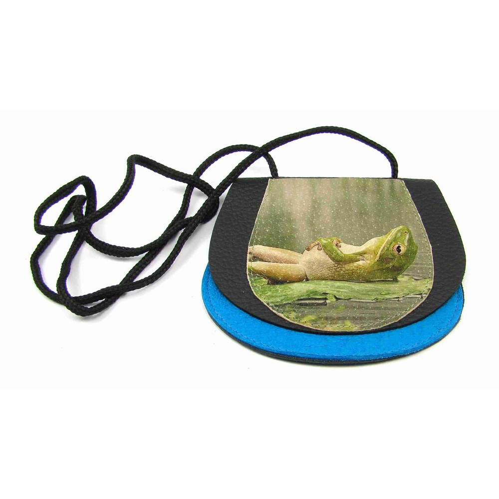 Dětská peněženka s potiskem žáby ručně vyrobená z pravé kůže. Peněženka je kapsička, která se uzavírá klopou na suchý zip. Pod obrázkem je schovaná druhá malá kapsička přístupná bez otevření klopy. K peněžence je šňůrka k zavěšení na krk. Tyto malé dětské peněženky jsou vyrobené z pravé kůže různých barev. Barvy zasílám náhodně.