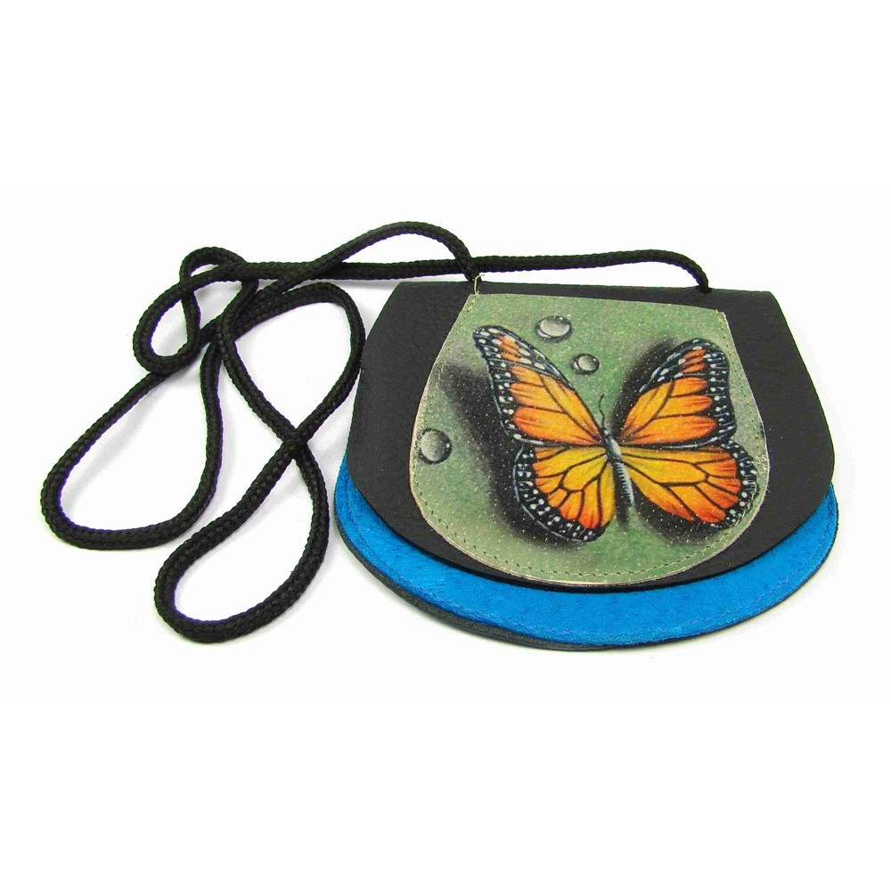 Dětská peněženka s potiskem motýla ručně vyrobená z pravé kůže. Peněženka je kapsička, která se uzavírá klopou na suchý zip. Pod obrázkem je schovaná druhá malá kapsička přístupná bez otevření klopy. K peněžence je šňůrka k zavěšení na krk. Peněženka je vyrobená z pravé kůže různých barev. Barvy zasílám náhodně. Malé dětské peněženky z pravé kůže jsou zárukou dlouhé životnosti.