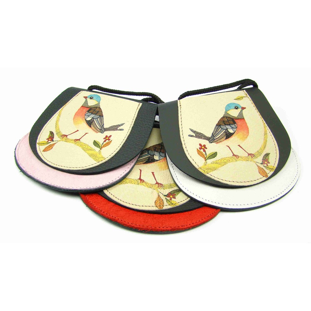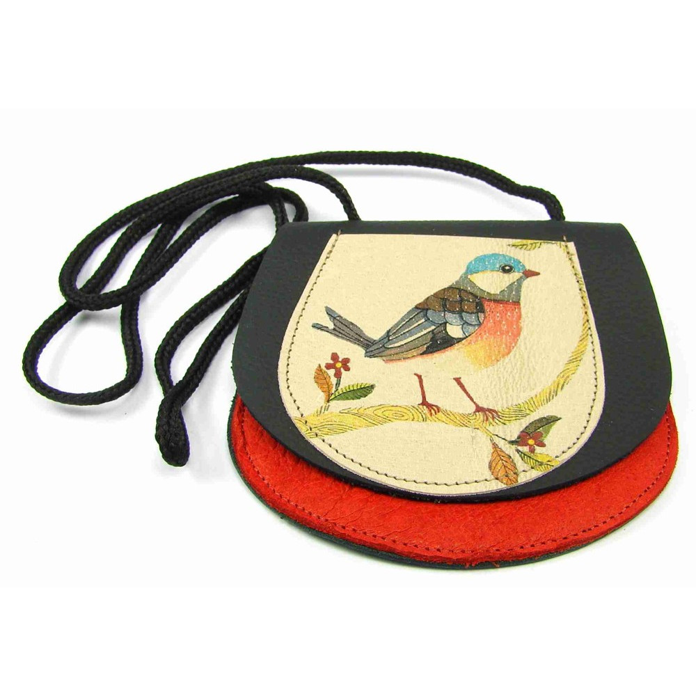 Dětská peněženka s potiskem malovaného ptáčka ručně vyrobená z pravé kůže. Peněženka je kapsička, která se uzavírá klopou na suchý zip. Pod obrázkem je schovaná druhá malá kapsička přístupná bez otevření klopy. K peněžence je šňůrka k zavěšení na krk. Peněženka je vyrobená z pravé kůže černé a různých barev. Barvy zasílám náhodně. Malované peněženky jsou stále oblíbenější. Tato je sice polepená, ale malovaným obrázkem.
