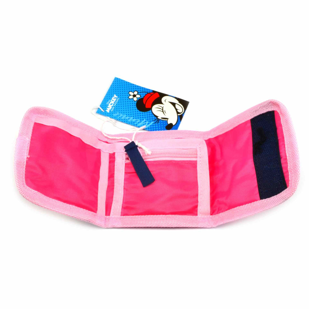 Dětská peněženka s Minnie Mouse se zapínáním na suchý zip. Po otevření má peněženka Minnie Mouse mincovník uzavíratelný na zip a kapsu na kartu nebo průkazku. Samozřejmostí je velká kapsa na bankovky. Materiál peněženky je 100% polyester.