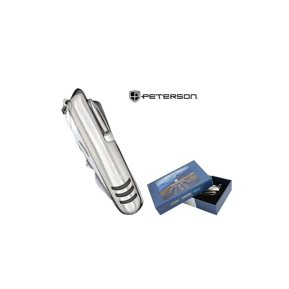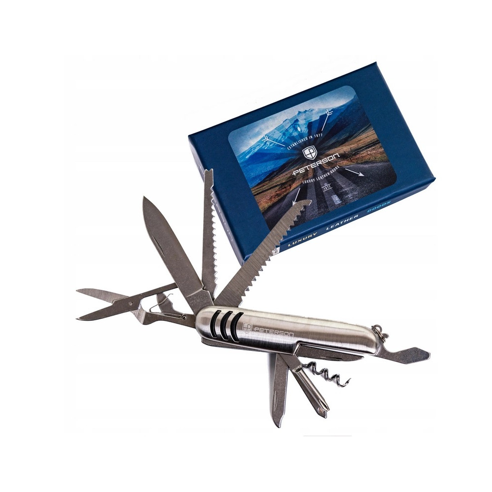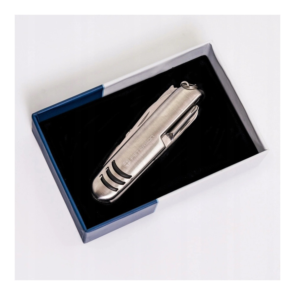 Značkový multifunkční kapesní nůž Peterson kombinuje vysoce kvalitní materiály a výjimečnou funkčnost. Jeho konstrukce z nerezové oceli zaujme odolností i elegancí, což z něj činí spolehlivý nástroj v každé situaci.