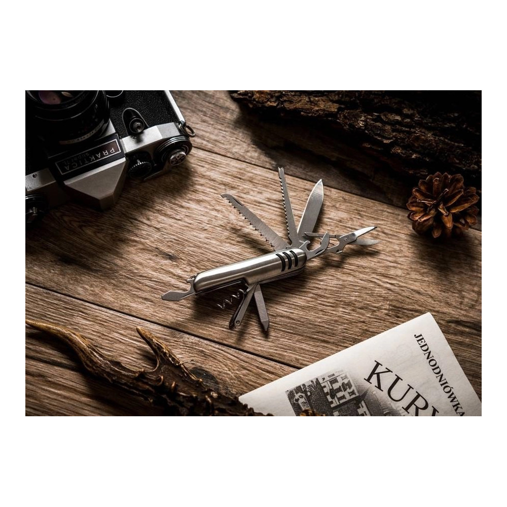 Uvnitř kompaktního, ergonomického těla se skrývá působivá sada funkcí, včetně čepelí, pil, nůžek, vývrtky, šroubováku a otvíráků na lahve a plechovky. Každá součást je navržena s pozoruhodnou přesností, aby byla zajištěna maximální pohodlí a všestrannost pro uživatele.
