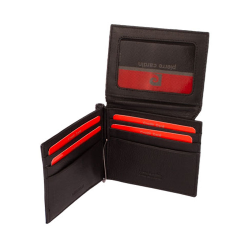 Dolarovka z pravé kůže s vyklápěcí sponou pro přichycení bankovek. Dolarovka má několik kapes pro uložení platebních a jiných karet a ve vyklápěcí klopě uvnitř má průhlednou kapsu. Na zadní straně jsou netradičně další kapsy na karty. Dolarovka má černou barvu s modrým pruhem a je značky Pierre Cardin. Dolarovka je dodávána v dárkové krabičce s logem výrobce.
