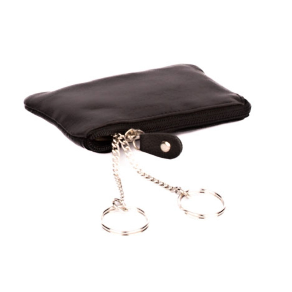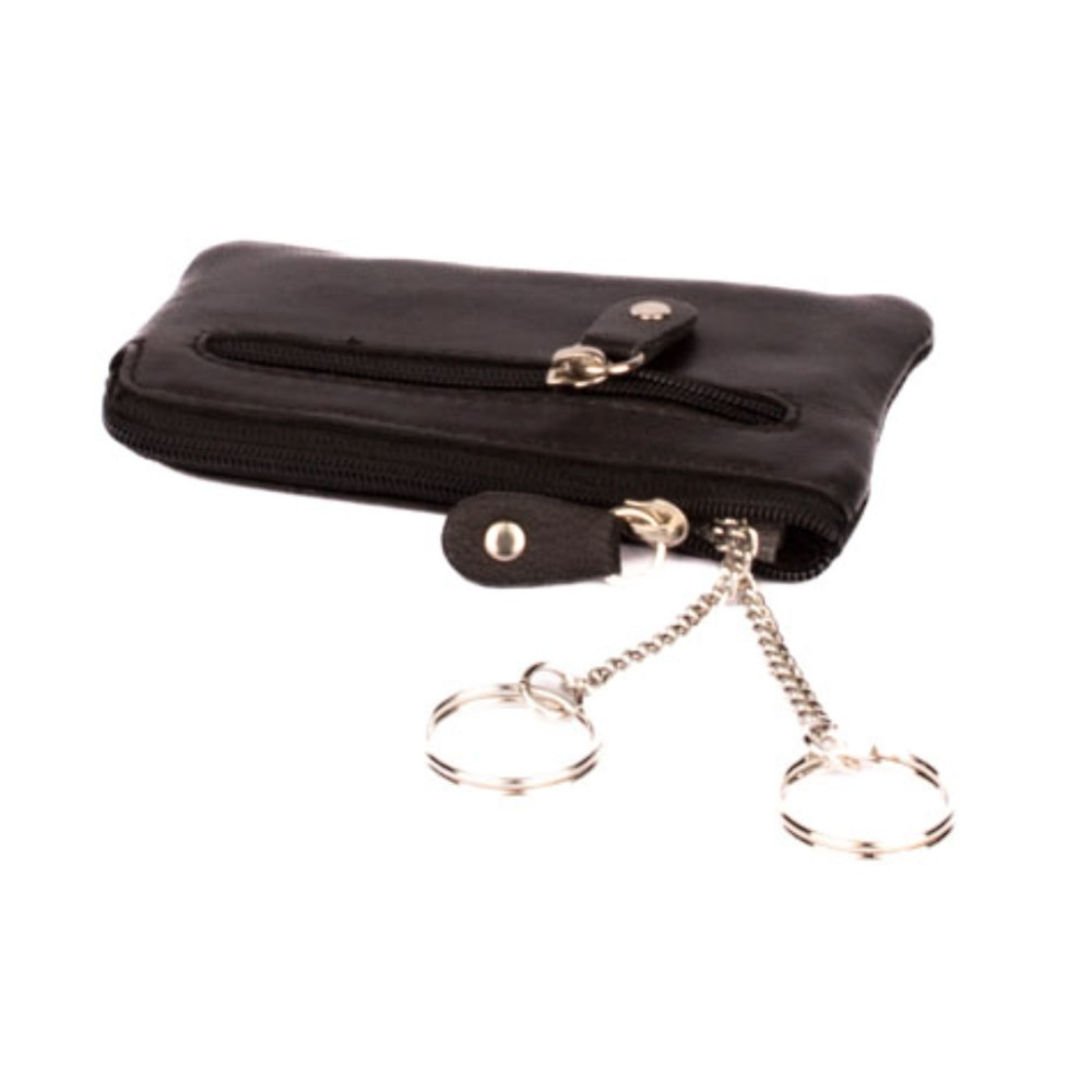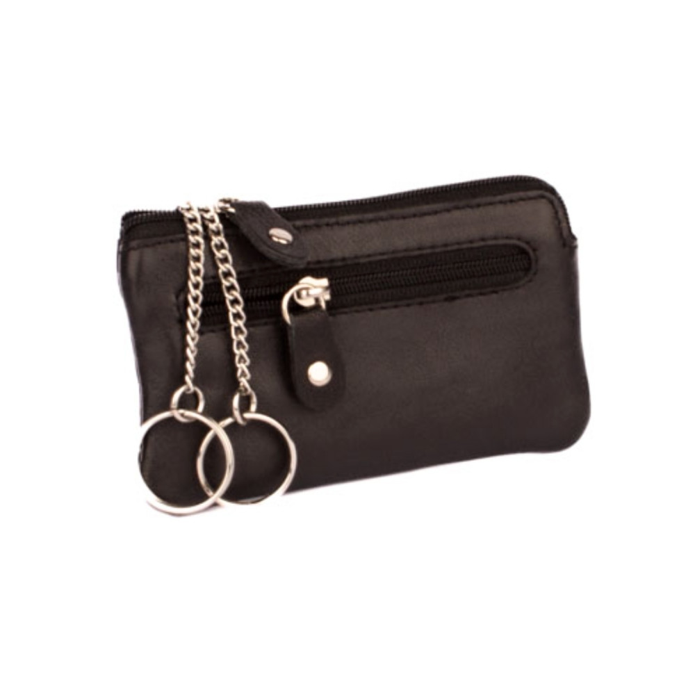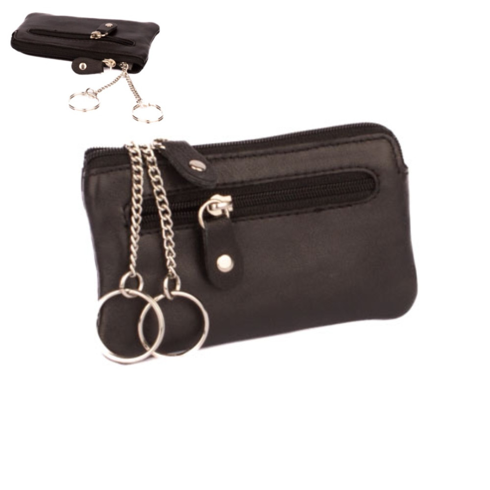 Černá kožená klíčenka z velmi jemné kůže se dvěma kapsičkami. Obě kapsy se uzavírají pevným zipem s velkým jezdcem. Větší kapsa se otvírá z horní strany klíčenky. Uvnitř jsou dva pevné řetízky s kroužky pro uchycení klíčů. Do menší kapsičky na přední straně pouzdra můžete dát třeba bankovky a pár mincí. Pouzdro je vyrobeno z pravé kůže černé barvy.