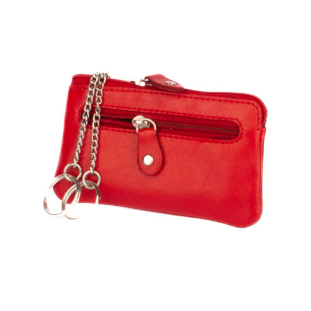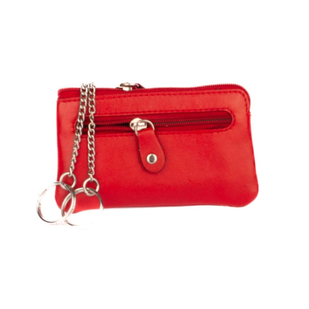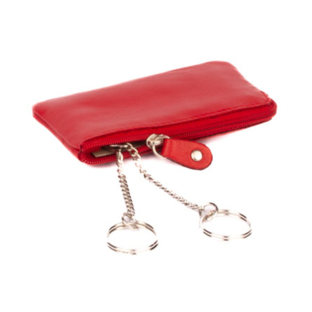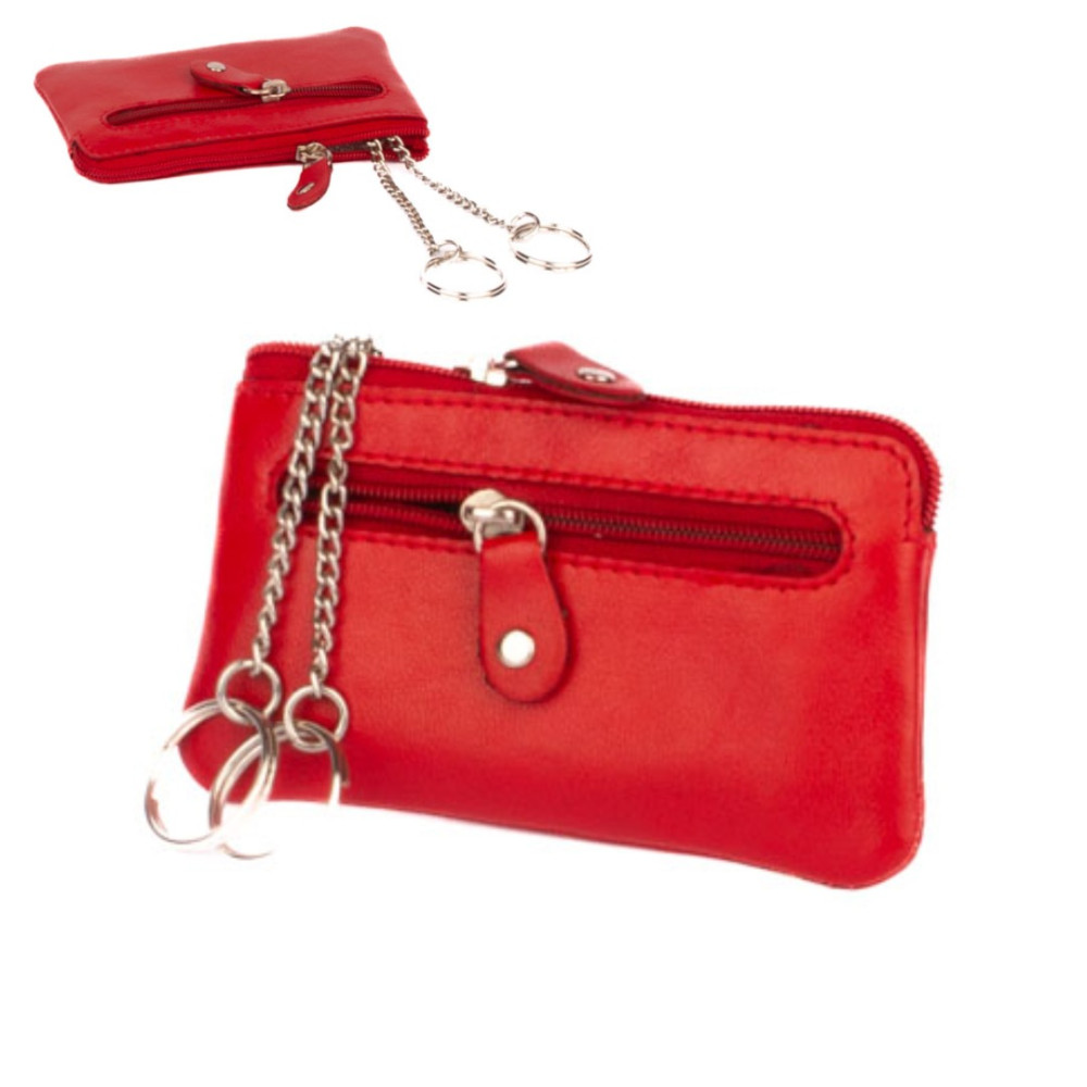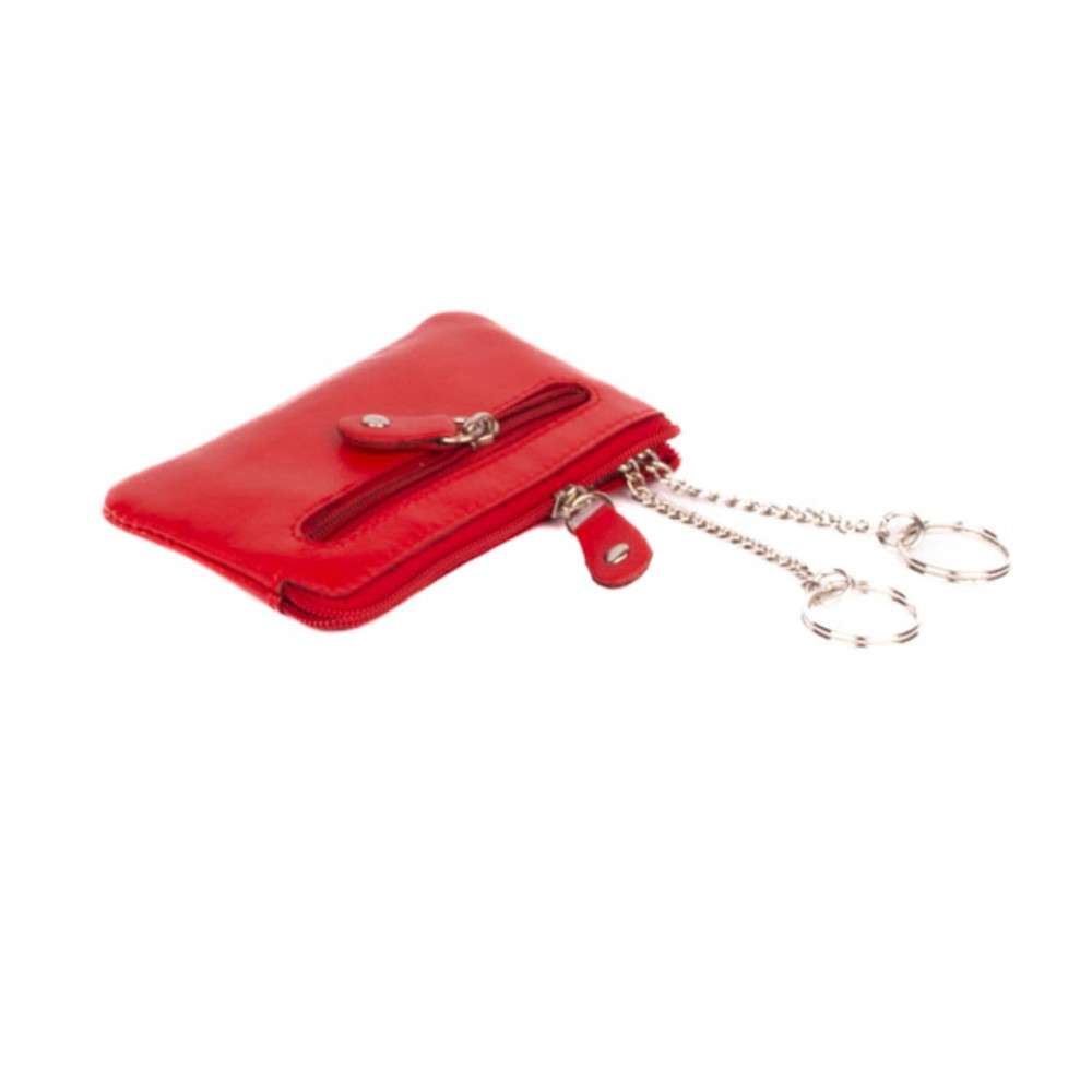 Klíčenka z velmi jemné kůže se dvěma kapsičkami. Obě kapsy se uzavírají pevným zipem s velkým jezdcem. Větší kapsa se otvírá z horní strany klíčenky. Uvnitř jsou dva pevné řetízky s kroužky pro uchycení klíčů. Do menší kapsičky na přední straně pouzdra můžete dát třeba bankovky a pár mincí. Pouzdro je vyrobeno z pravé kůže červené barvy.