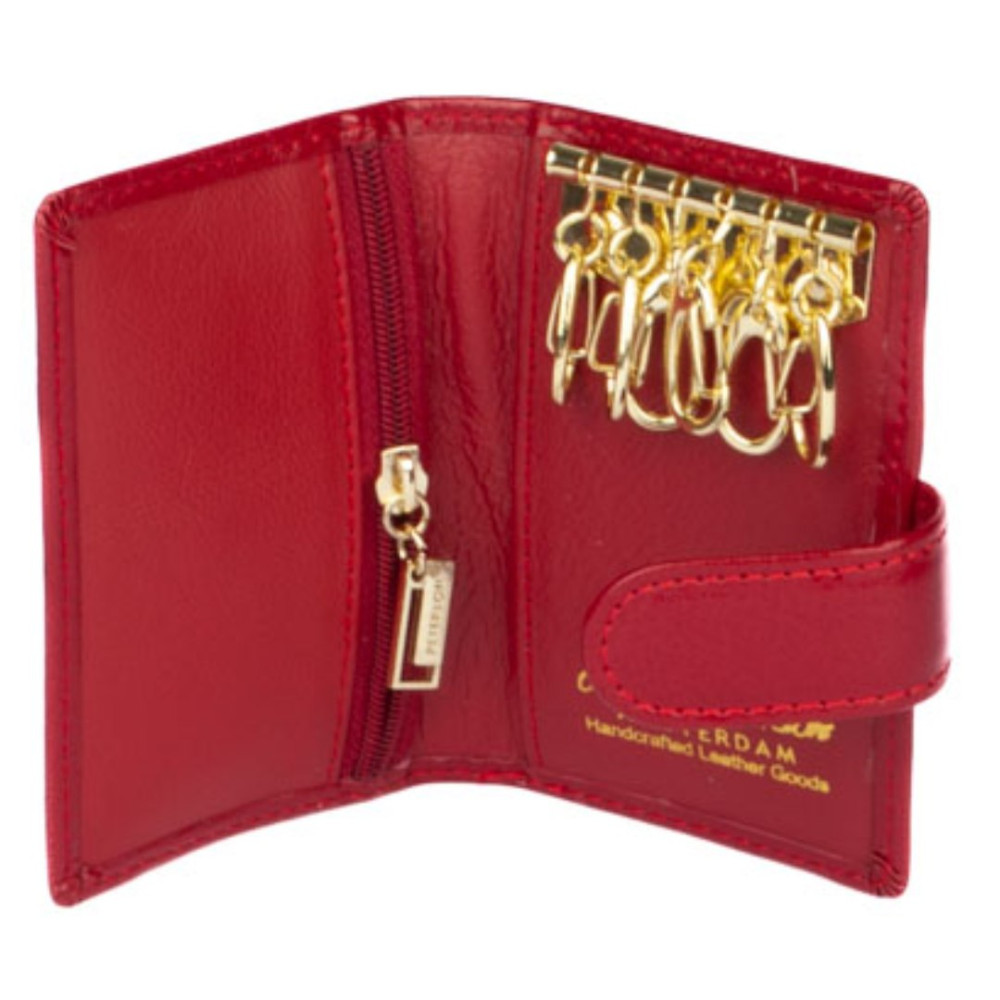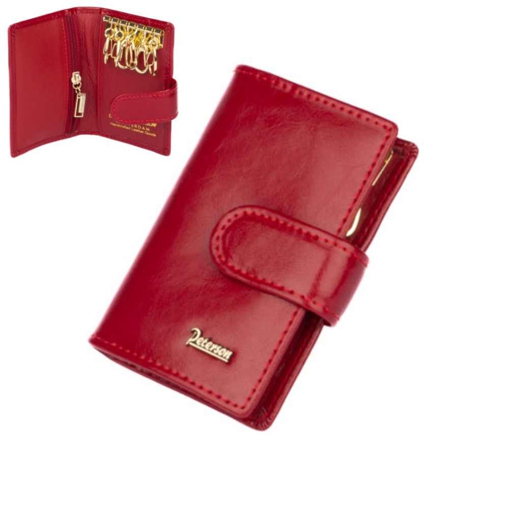 Klíčenka červená kožená se uzavírá přezkou s pevným drukem. Klíčenka má uvnitř několik karabin na klíče, tenkou kapsu na kartu a jednu kapsu na zip. Tato klíčenka červená kožená je vyrobena z pravé kůže červené barvy, je značky Peterson a je dodávána v dárkové krabičce.
