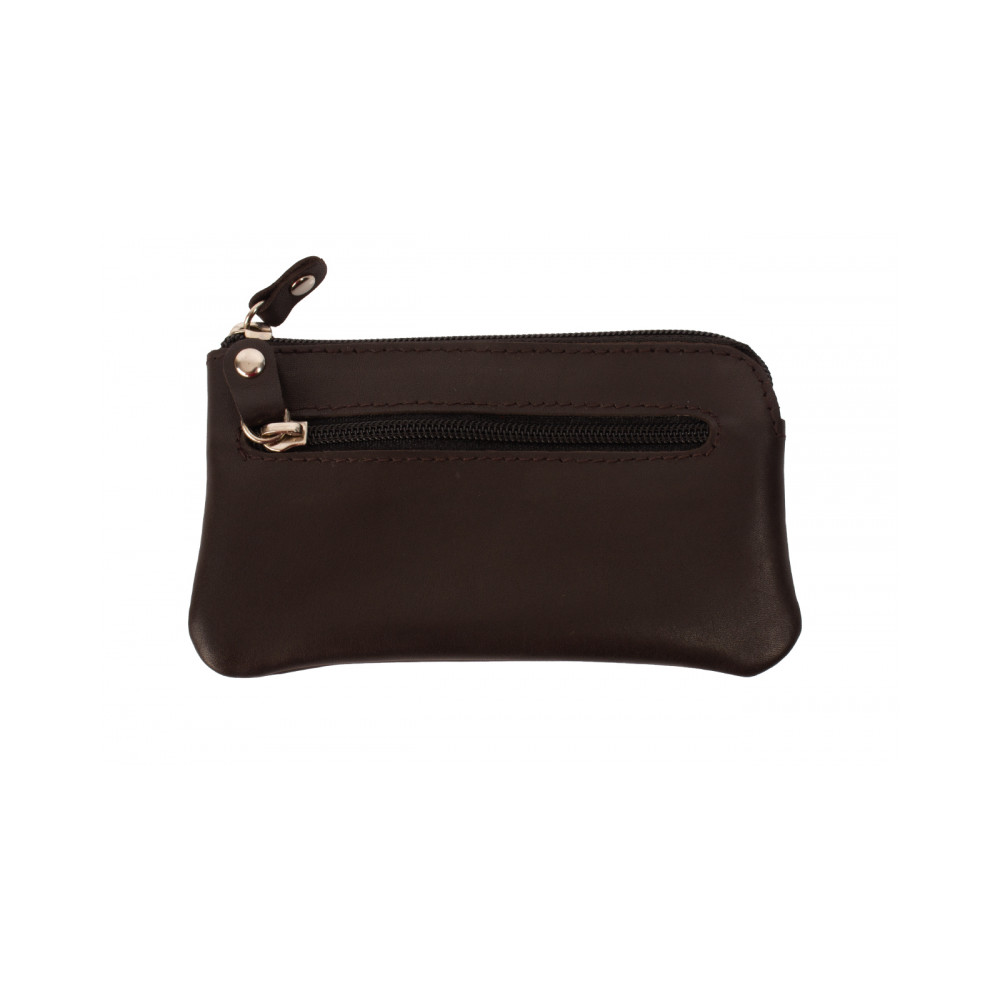 Hnědá kožená klíčenka z velmi jemné kůže se dvěma kapsičkami. Obě kapsy se uzavírají pevným zipem s velkým jezdcem. Větší kapsa se otvírá z horní strany klíčenky. Uvnitř jsou dva pevné řetízky s kroužky pro uchycení klíčů. Do menší kapsičky na přední straně pouzdra můžete dát třeba bankovky a pár mincí. Pouzdro je vyrobeno z pravé kůže hnědé barvy.