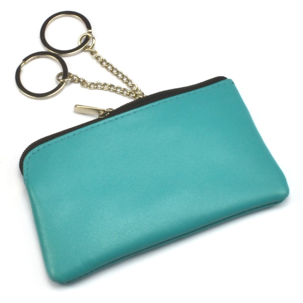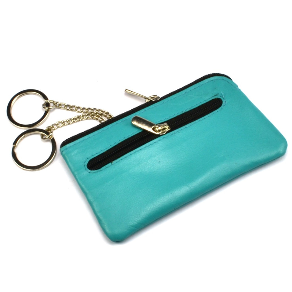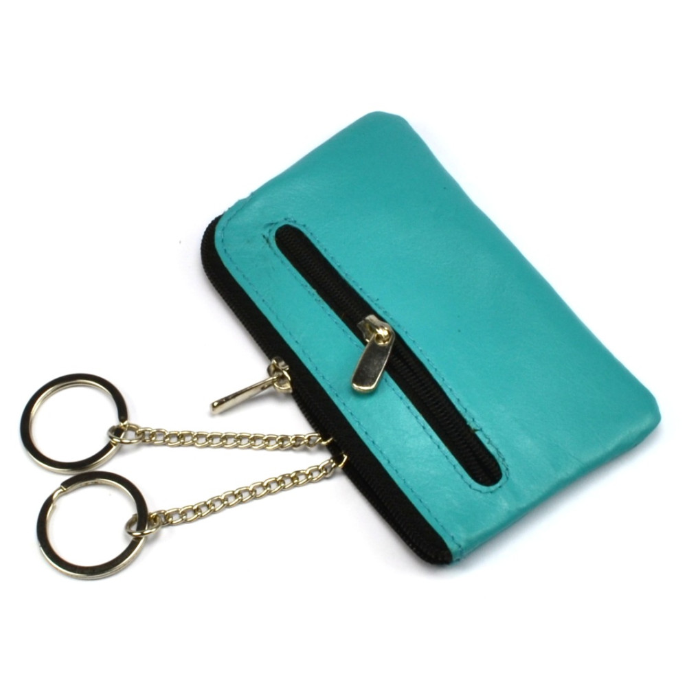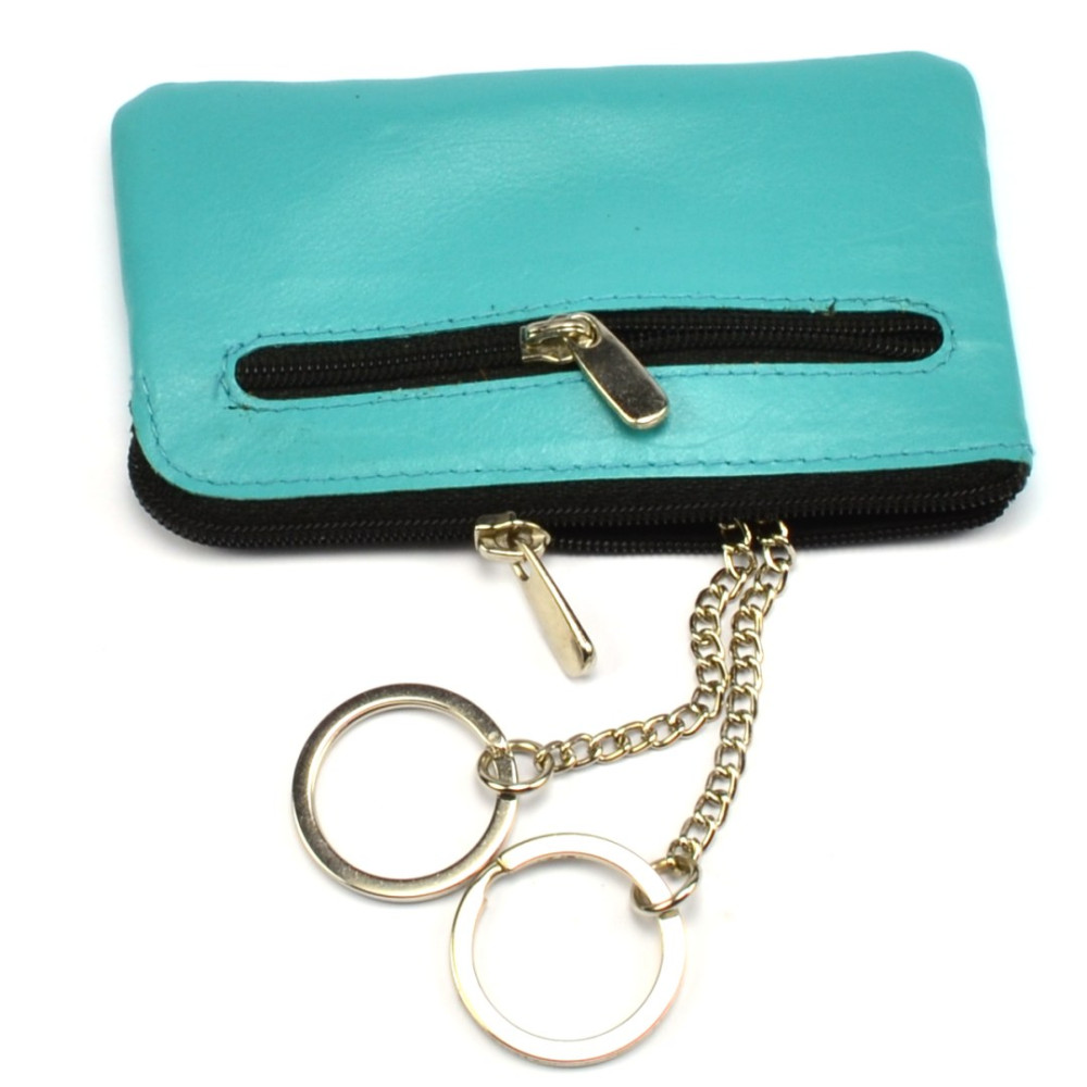 Velká kožená klíčenka z pravé velmi jemné kůže. Na horní straně velké klíčenky kožené pod zipem je velká kapsa s řetízky a kroužky pro uchycení klíčů. Z přední strany klíčenky je malá kapsička uzavíratelná zipem. Klíčenka je vyrobená z pravé kůže tyrkysové barvy.