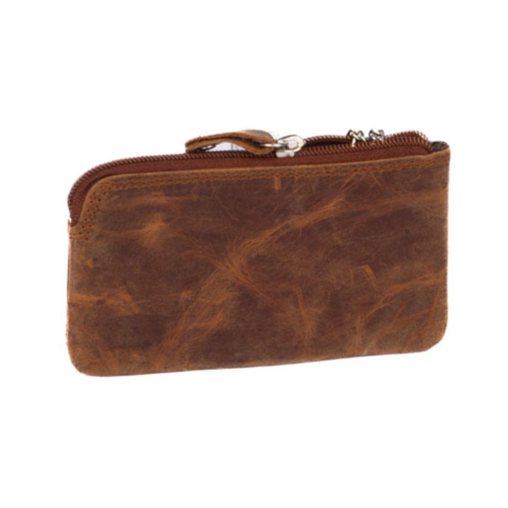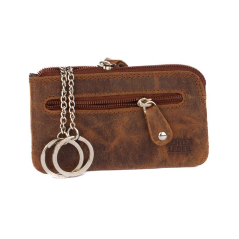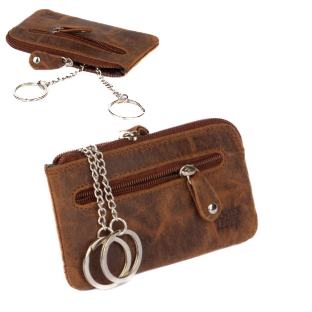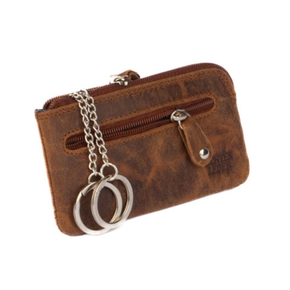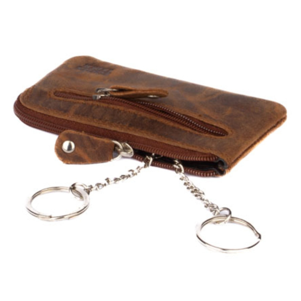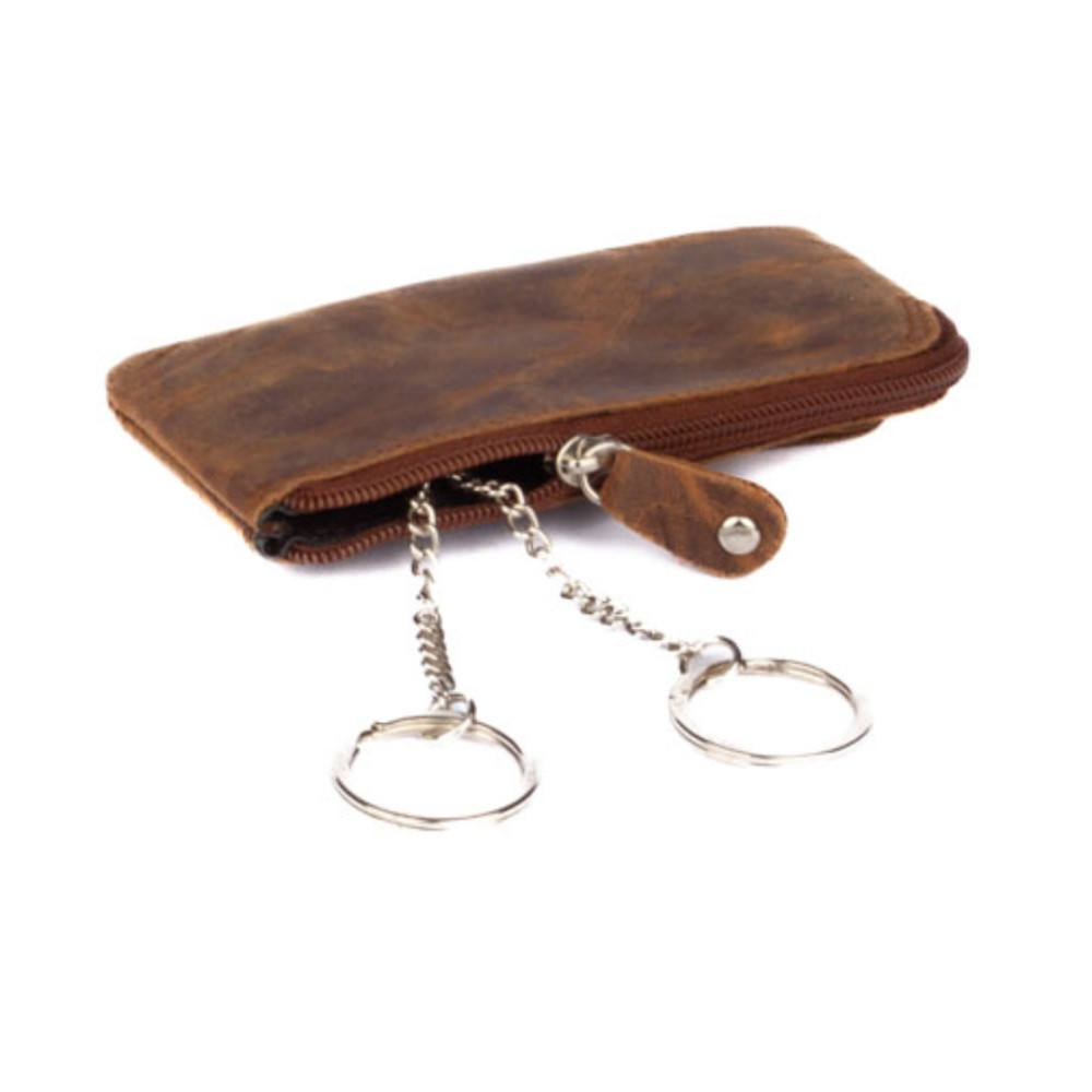 Kožená hnědá klíčenka se zapínáním na zip. Menší kapsička na přední straně může sloužit k uložení pár mincí nebo bankovek. Zip na horní straně otevírá klíčenku, ve které jsou da řetízky. Každý má jeden kroužek pro uchycení klíčů. Kožená hnědá klíčenka je vyrobená z pravé kůže tmavě hnědé barvy.
