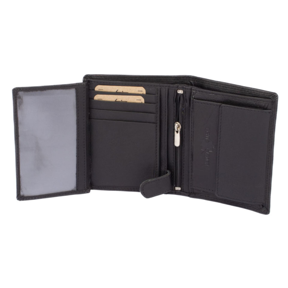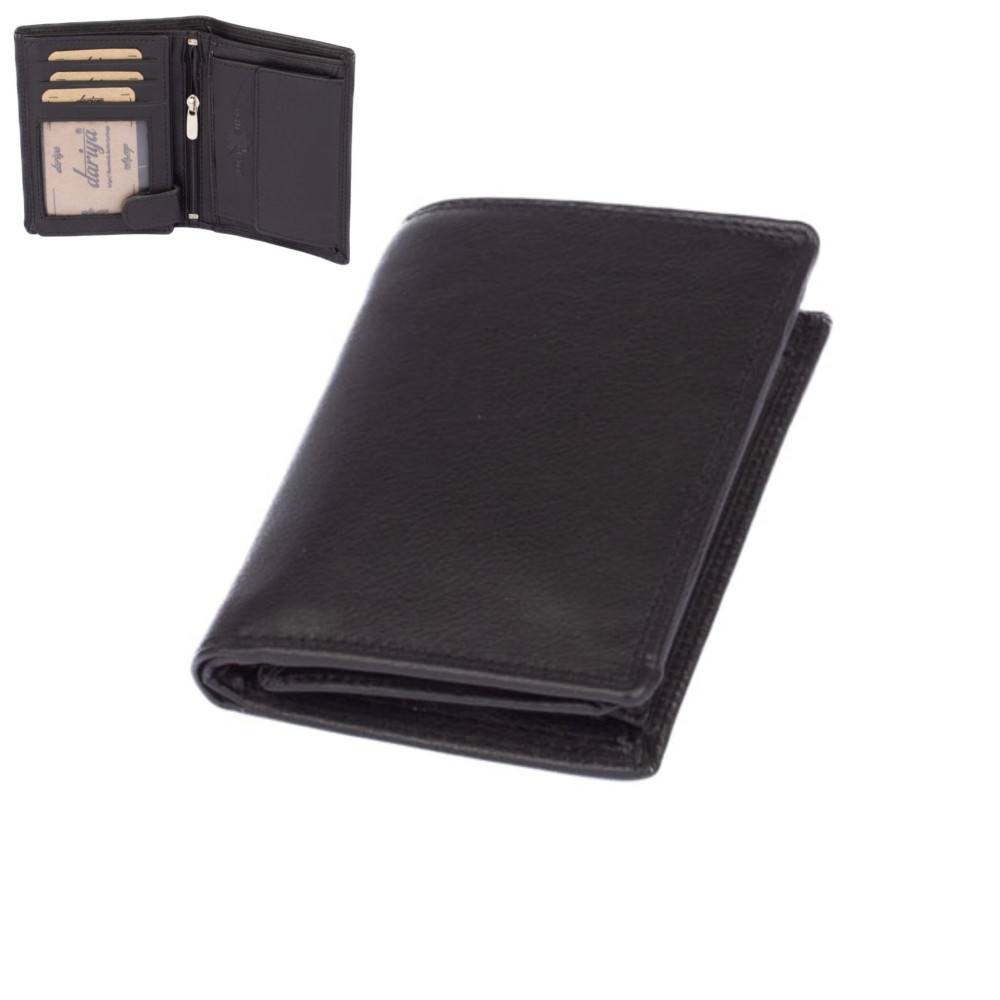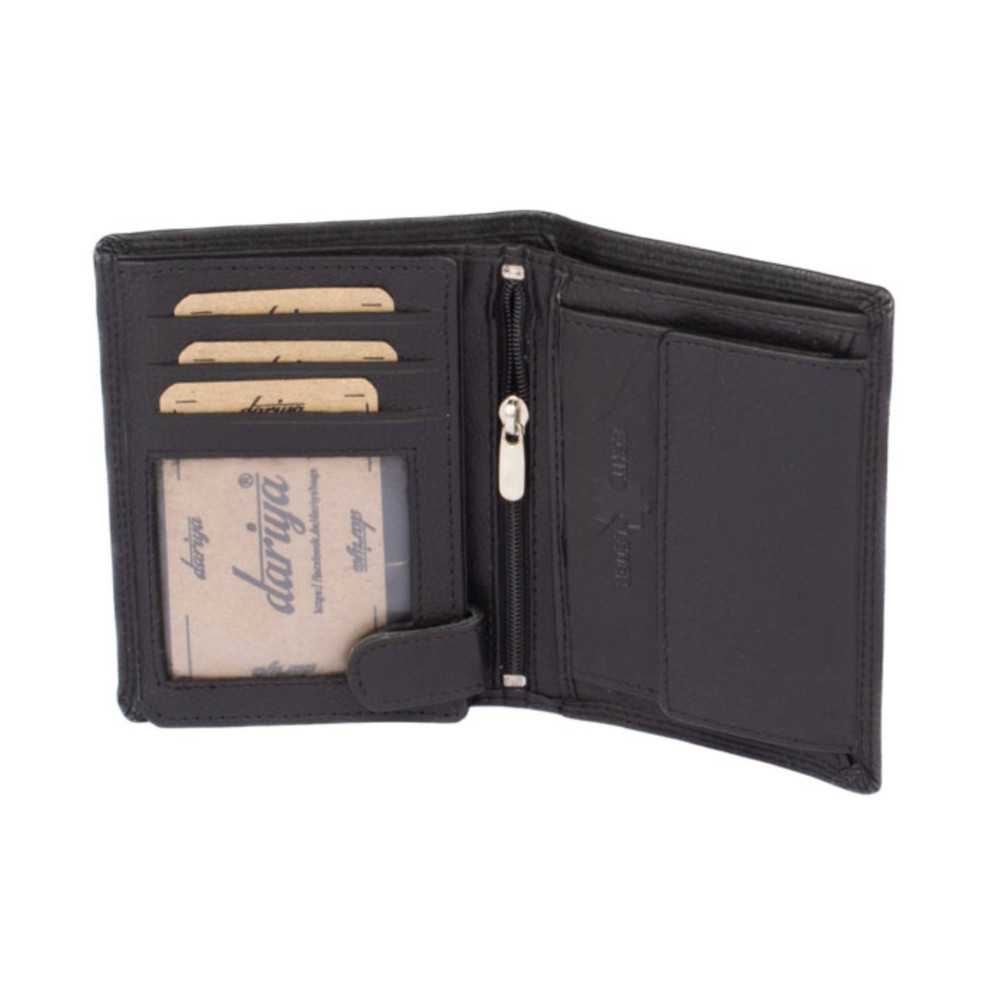 Klasická černá kožená peněženka pánská značky Dariya Bags vyrobená z jemné kůže. Černá kožená peněženka pánská po otevření nabízí kapsy na platební karty, jednu průhlednou. Samozřejmostí jsou kapsy na bankovky. Peněženka má klasický mincovník uzavíratelný klopou s pevným drukem. Peněženka je vyrobená z pravé jemné kůže a je černé barvy. Peněženka je dodávána bez dárkové krabičky.