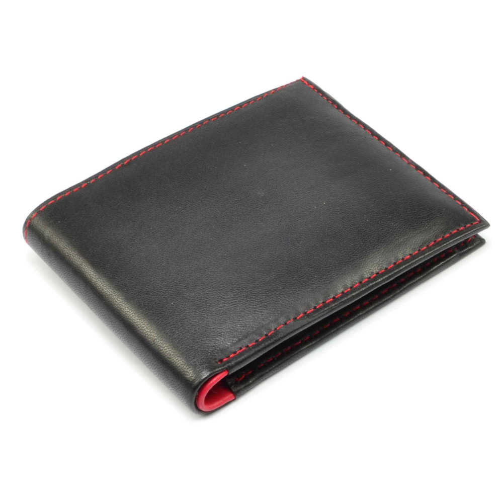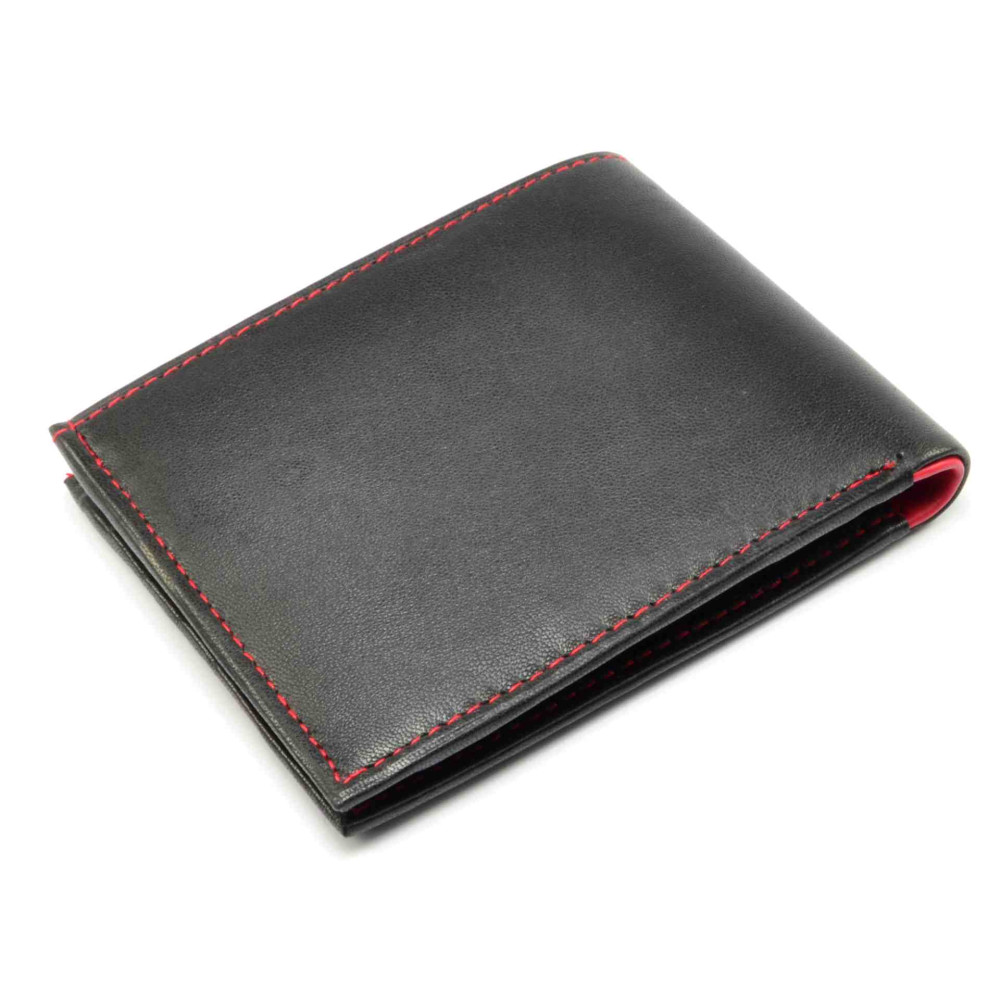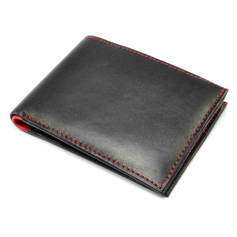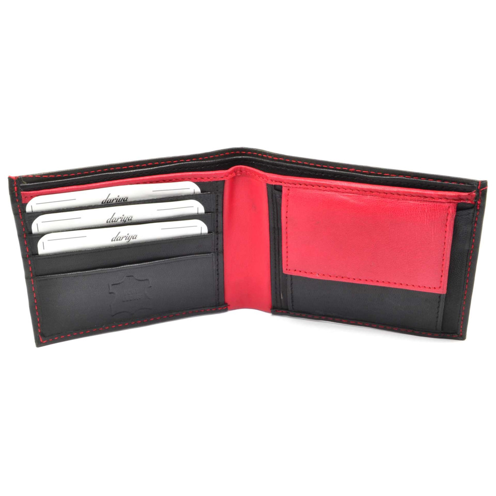 Peněženka pánská černé barvy s prošívání červenou nití. Uvnitř je peněženka pánská v kombinaci červené a černé barvy a je vyrobena z měkoučké nappa kůže. Po otevření peněženky jsou přístupné kapsy na karty i bankovky. Samozřejmostí peněženky pánské je minconvík uzavíratelný klopou s pevným drukem. Peněženka je značky Dariya bags.