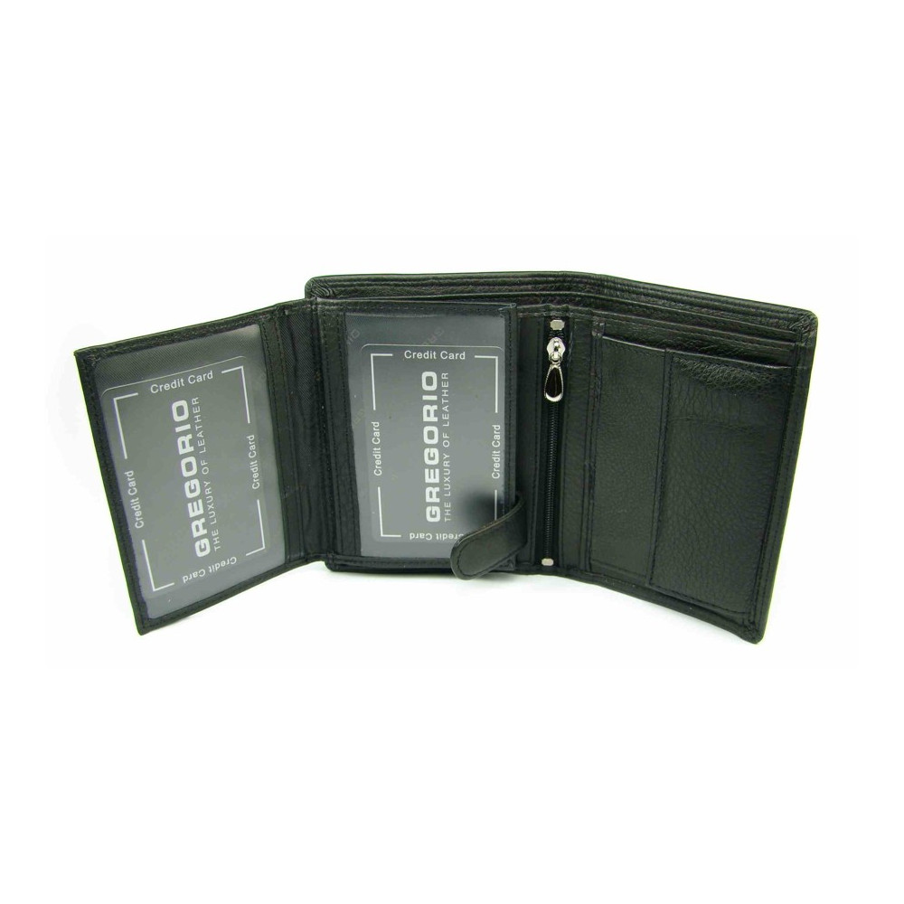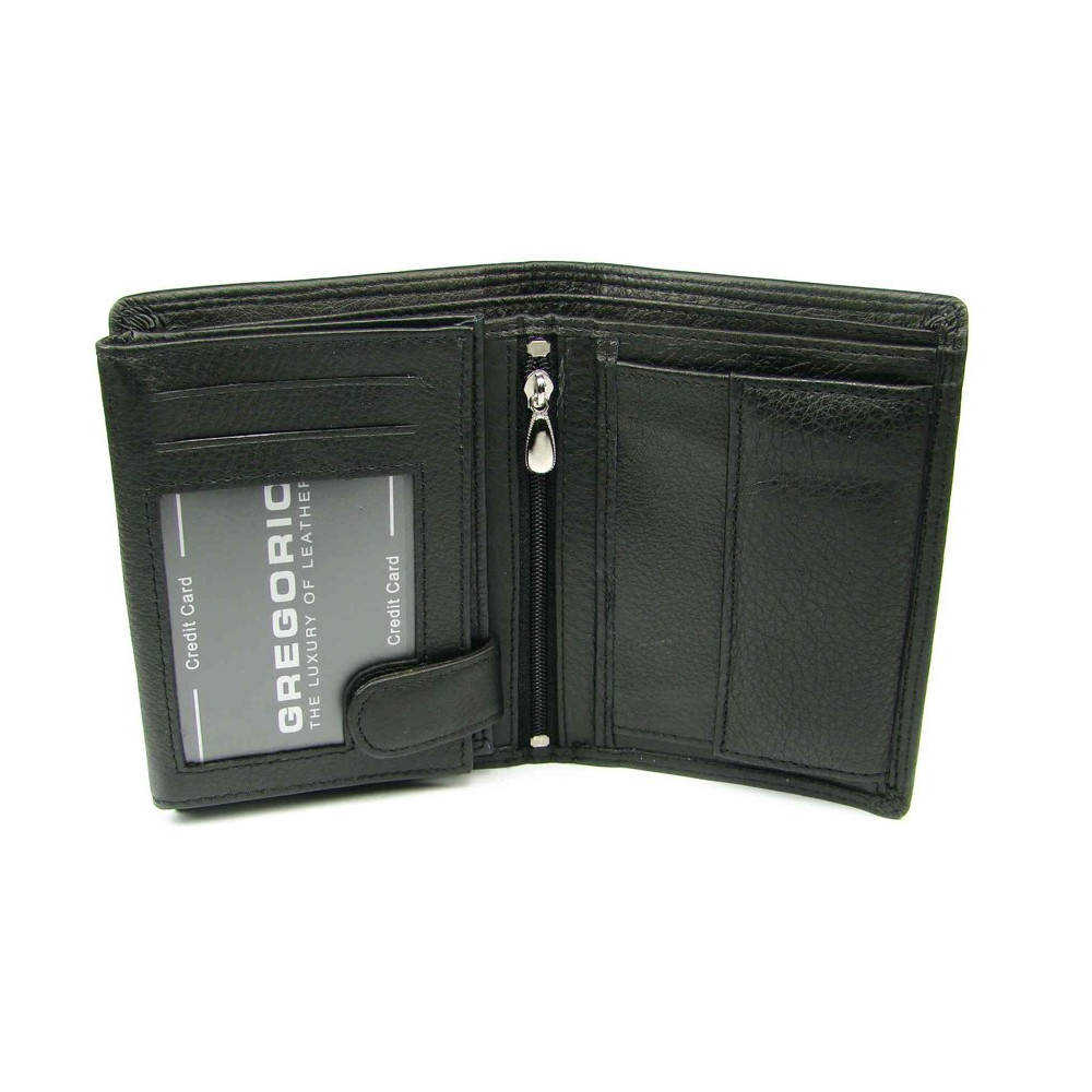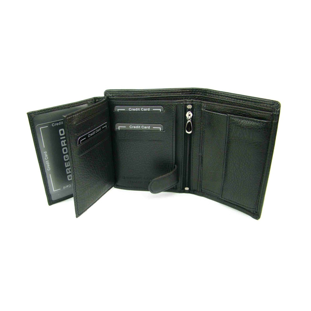 Tato černá peněženka pánská vyrobená z pravé kůže je klasickým vzorem praktické peněženky. V peněžence pánské jsou velké kapsy na bankovky, dostatek kapes na platební a jiné karty. Do dvou velkých průhledných kapes si můžete dát třeba doklady nebo fotky svých blízkých. Mincovník je klasický, s klopou a pevným drukem. V této parádní černé peněžence jsou také skryté kapsy, jedna na zip. Peněženka je vyrobená z pravé černé kůže a je značky Gregorio.