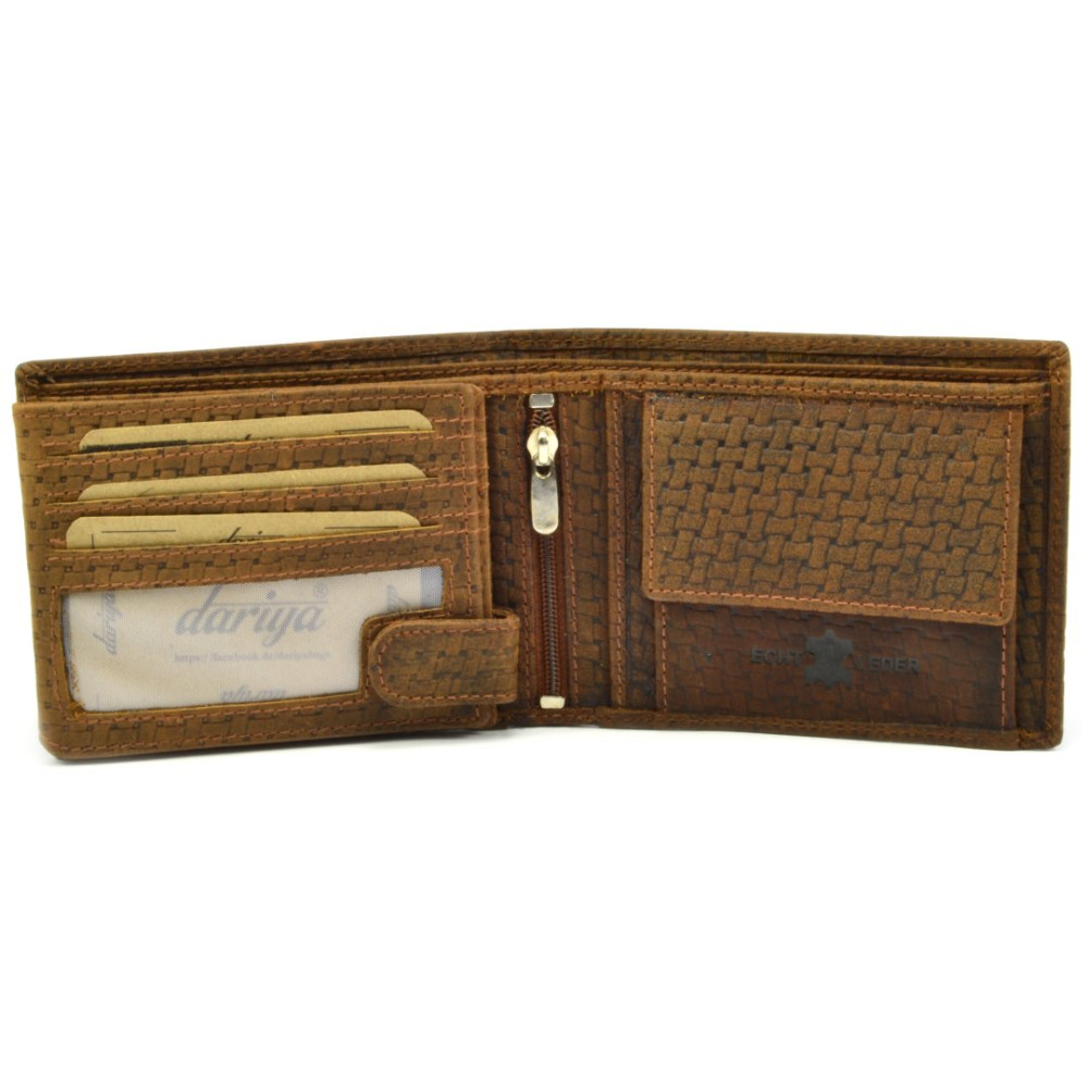 Klasický design, kvalitní materiál a praktické uspořádání uvnitř, to je hnědá pánská peněženka. Peněženka je vyrobena z pravé kůže hnědé barvy s vyraženým vzorem. Peněženka má uvnitř klasické uspořádání. Má kapsy na bankovky i doklady, některé jsou průhledné. Samozřejmostí je mincovník s klopou a pevným drukem. Dvě velké kapsy na bankovky a tenké kapsy na tajnosti jsou součástí každé pořádné peněženky. Hnědá pánská peněženka je značky Dariya Bags.
