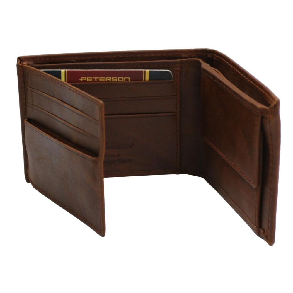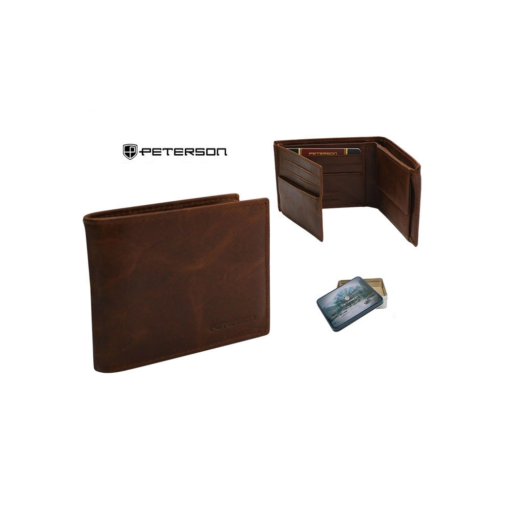 Hnědá peněženka kožená pánská do které se vejdou i doklady. Krásná barevná kombinace přírodní hnědé barvy dělá tuto koženou peněženku jedinečnou. V kožené peněžence najdete vše obvyklé – kapsy na bankovky, karty a doklady, mincovník. Peněženka je vyrobena z pravé kůže a je z kolekce značky Peterson. Peněženka je dodávána v dárkové plechové krabičce.