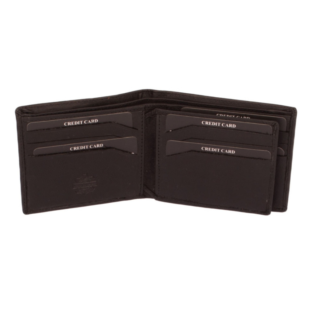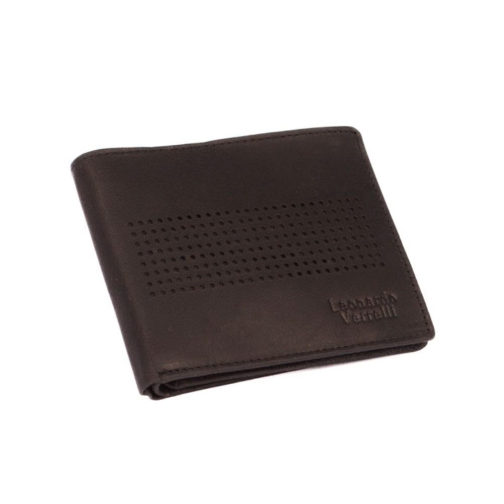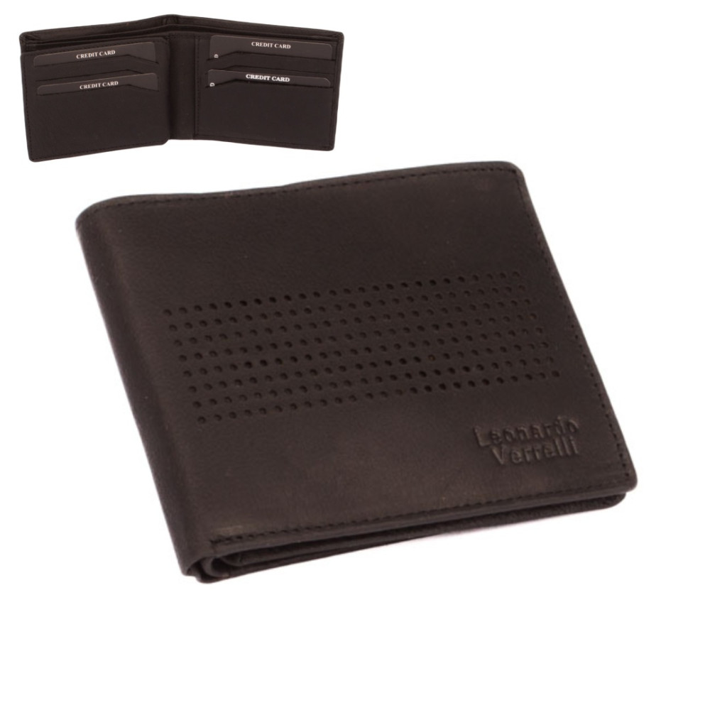 Kožená černá pánská peněženka z pravé kůže. Peněženka má dostatek kapes na vaše karty i bankovky. Po jejím otevření jsou přístupné kapsy na karty. Mincovník není v této peněžence. V horní části peněženky jsou dvě velké kapsy na doklady. Do obou se české bankovky vejdou bez přeložení. Ve vnitřní klopě jsou zbývající kapsy na karty, některé jsou průhledné. Tajné věci ukryjete ve dvou vnitřních tenkých kapsách. Kožená černá pánská peněženka je vyrobena z pravé kůže černé barvy a je značky Leonardo Verrelli. Peněženka je dodávána v dárkové krabičce. Peněženka je také vybavena RFID ochranou proti nechtěnému čtení karet.