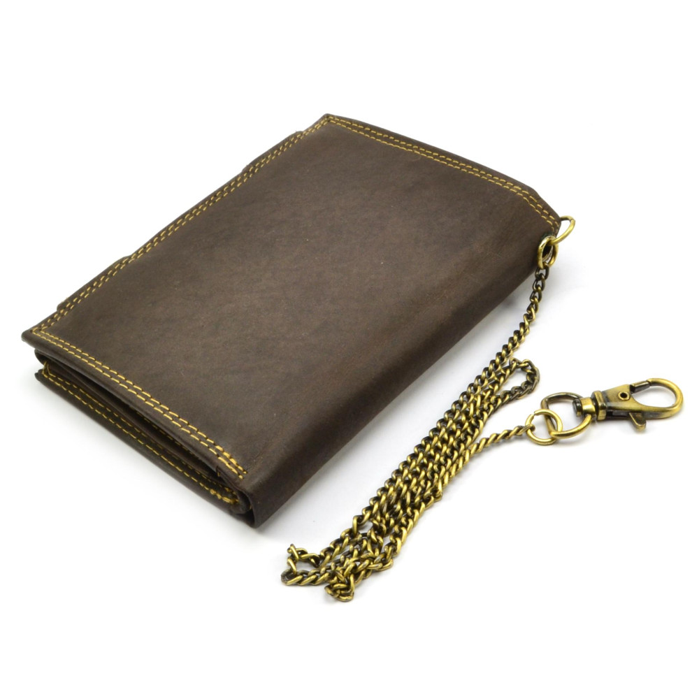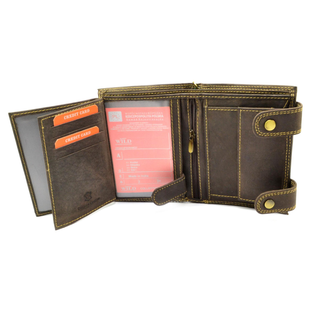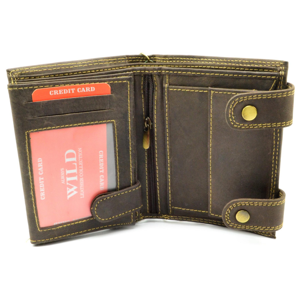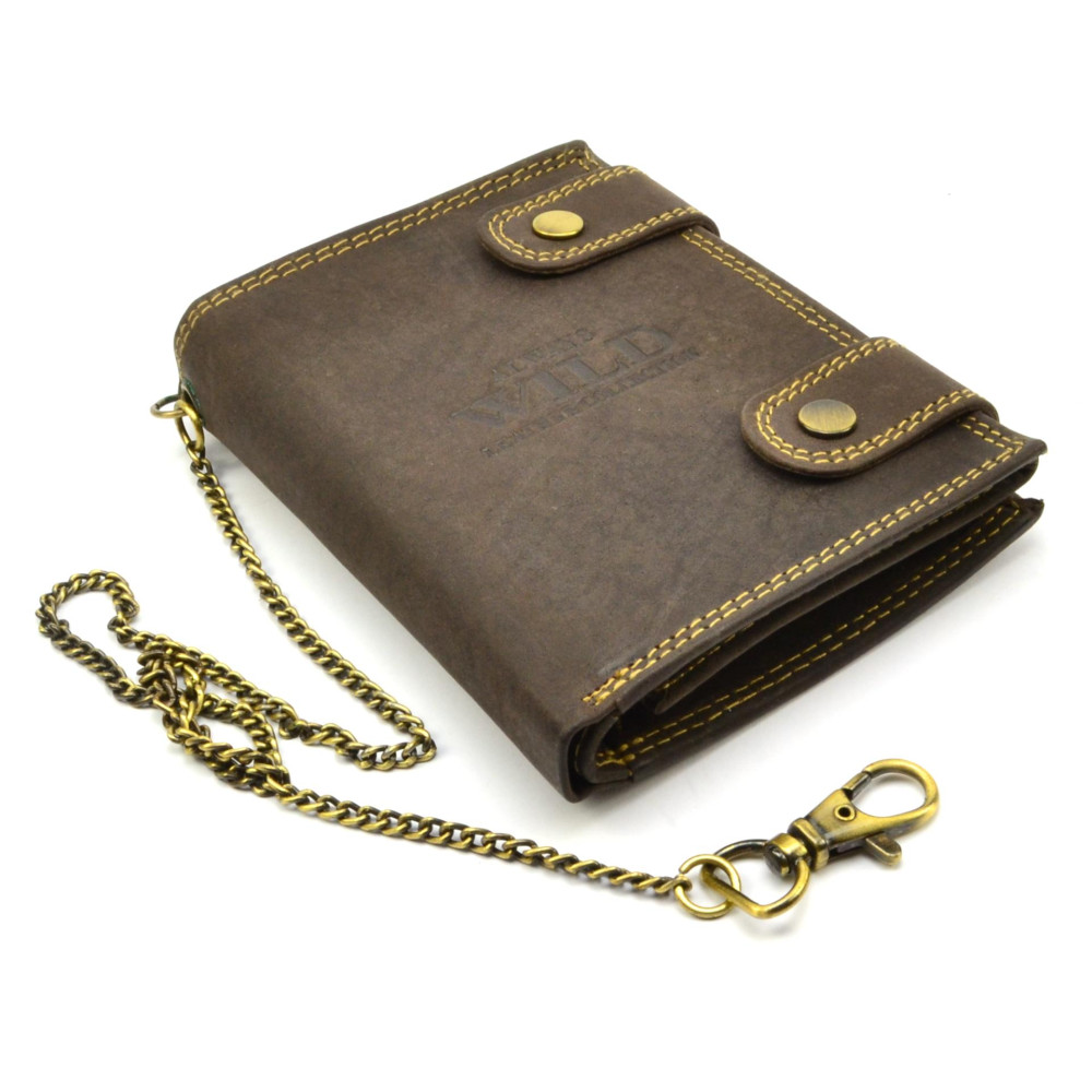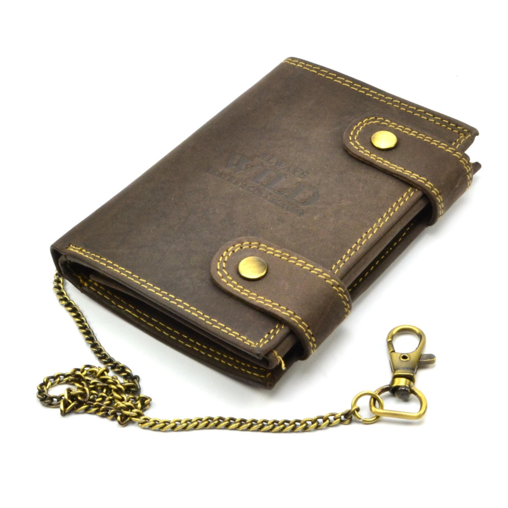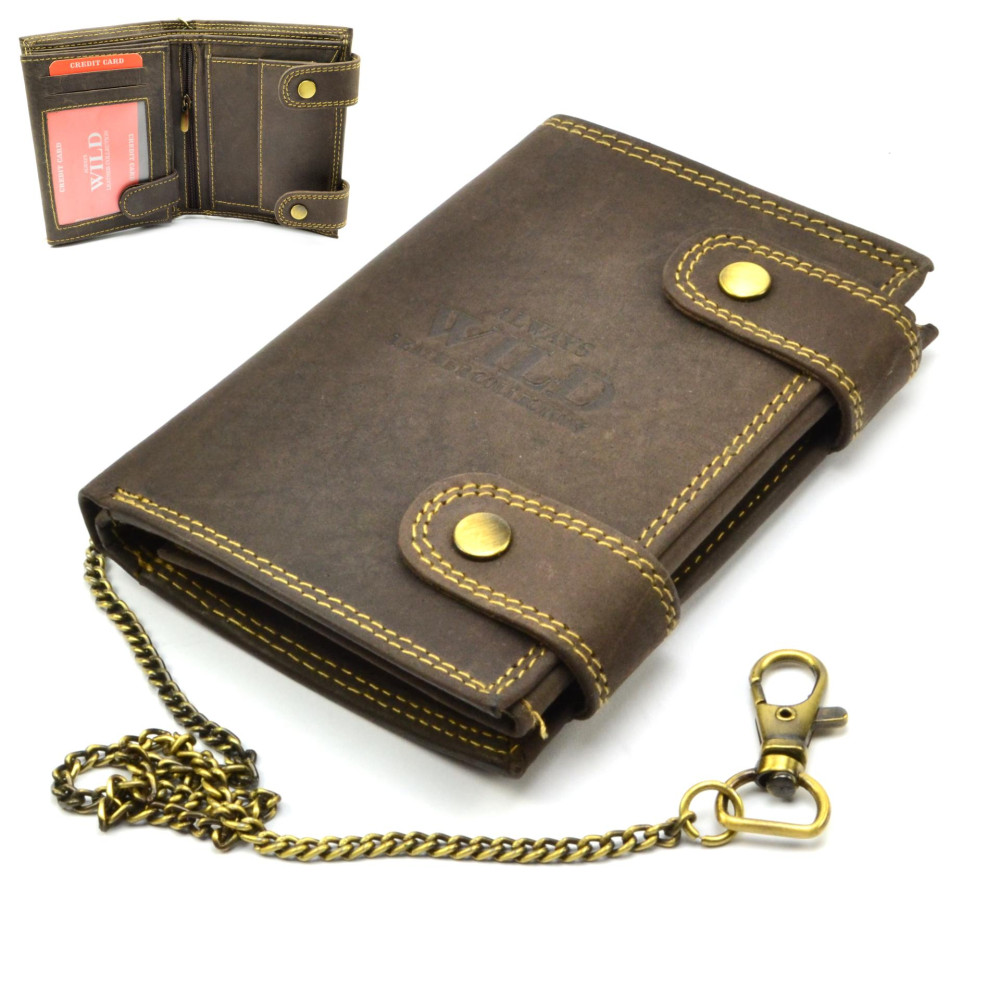 Pánská peněženka kožená s motivem zmačkané kůže se uzavírá přezkami s pevnými druky. Po otevření peněženky jsou přístupné kapsy na karty, mincovník a kapsy na bankovky. Otevřením další přezky s drukem je přístupná další část peněženky, ve které jsou průhledné kapsy na doklady a kapsy na karty. Peněženka je vyrobená z pravé kůže hnědé barvy a je značky Always Wild. Pro pohodlné nošení využijete určitě řetěz. Peněženka je dodávána v dárkové krabičce.