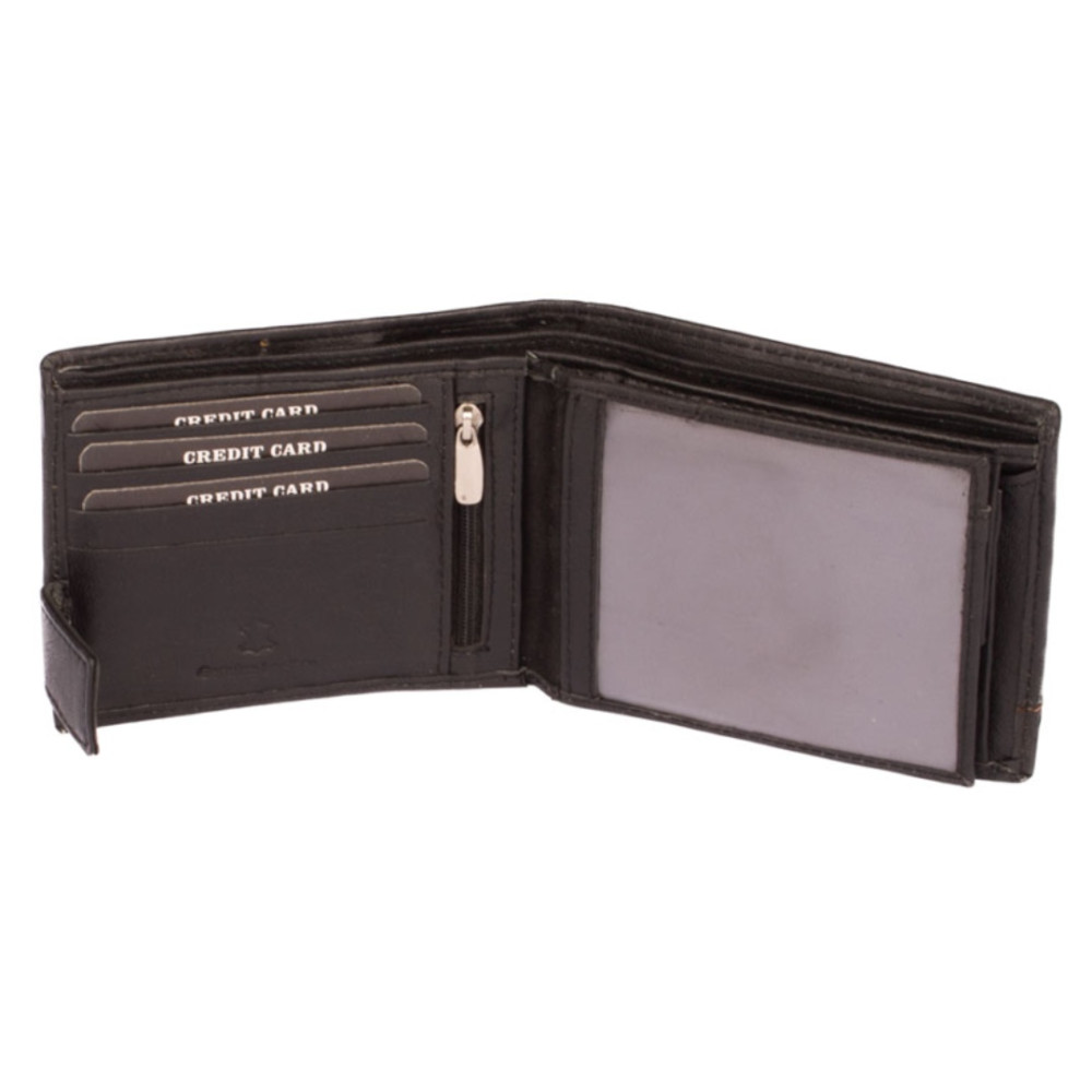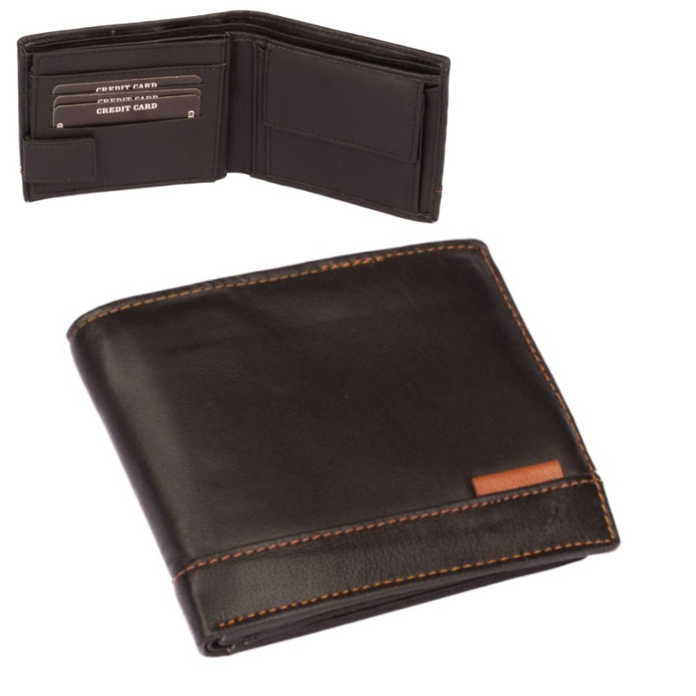 Kožená pánská černá peněženka s ozdobným prošíváním světlou nití. Po otevření peněženky čeká uvnitř klasické uspořádání. V pravé části je mincovník uzavíratelný klopou s pevným drukem. V levé části jsou kapsy na karty, jedna z nich je průhledná. Pod přezkou s pevným drukem je schovaná další malá kapsička na zip. Samozřejmostí jsou dvě velké kapsy na bankovky přes celou peněženku. Kožená pánská černá peněženka je vyrobená z pravé měkoučké kůže černé barvy a je značky Dariya Bags. Peněženka je dodávána bez dárkové krabičky.
