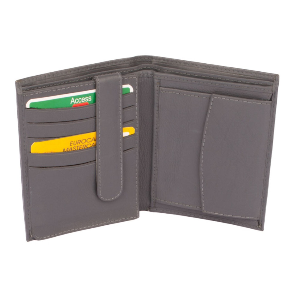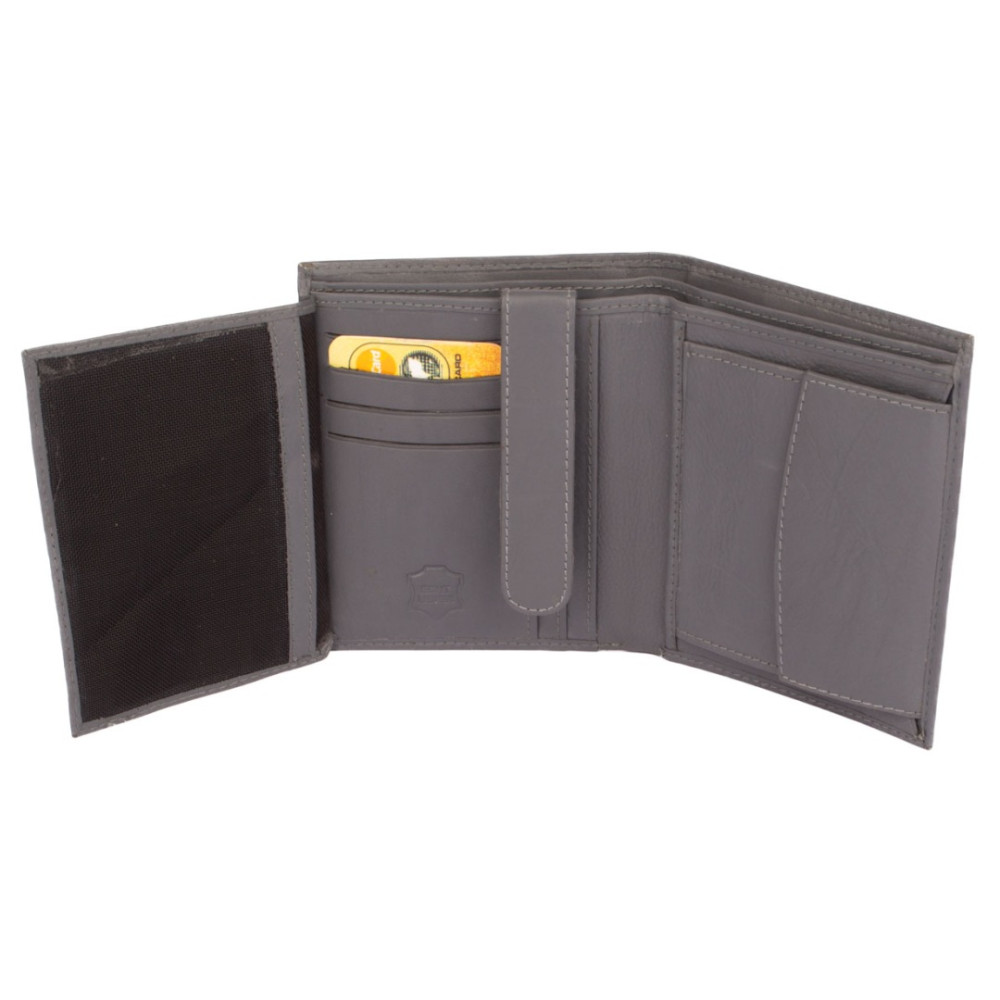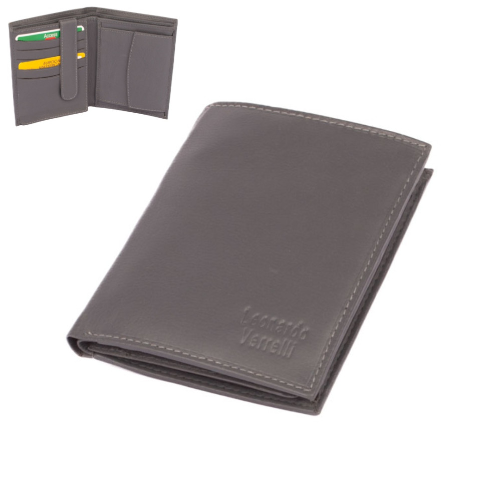 Kožená šedá peněženka pánská z pravé kůže. Peněženka má dostatek kapes na vaše karty, doklady i bankovky. Po jejím otevření jsou přístupné kapsy na karty, jedna je průhledná. Mincovník po pravé straně se uzavírá klopou s pevným drukem. V horní části peněženky jsou dvě velké kapsy na doklady. Do obou se české bankovky vejdou bez přeložení. Ve vnitřní klopě jsou zbývající kapsy na karty, některé jsou průhledné. Tajné věci ukryjete ve dvou vnitřních tenkých kapsách. Kožená šedá peněženka pánská je vyrobena z pravé kůže šedé barvy a je značky Leonardo Verrelli. Peněženka je také vybavena RFID ochranou proti nechtěnému čtení karet.
