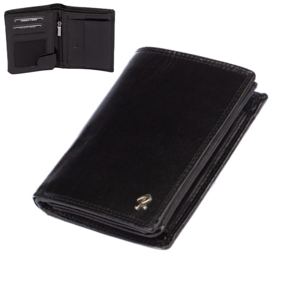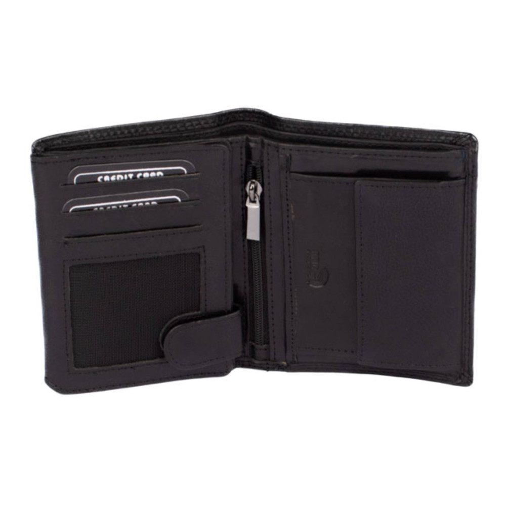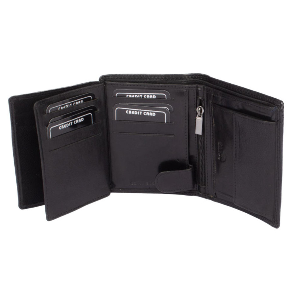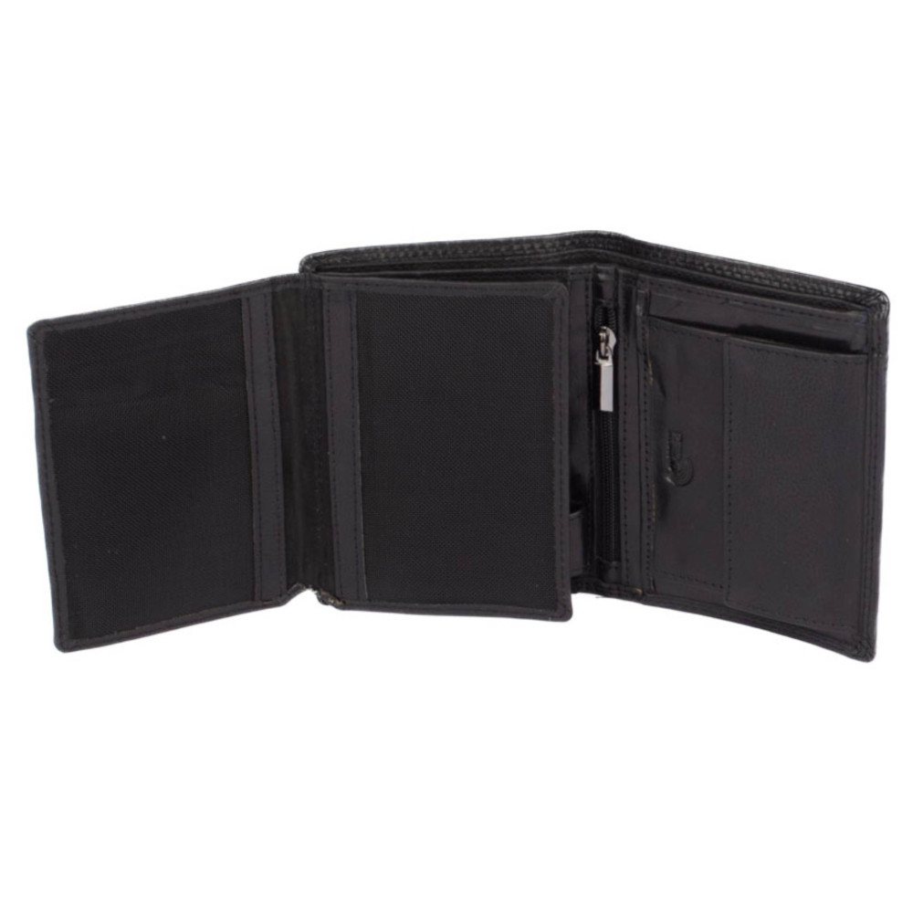 Luxusní pánská černá peněženka černé barvy z kvalitní pravé kůže. Netradiční barva, tradiční velikost a praktičnost. Do této černé peněženky uložíte doklady, platební a jiné karty a samozřejmě peníze. Peněženku dostanete v dárkové krabičce.