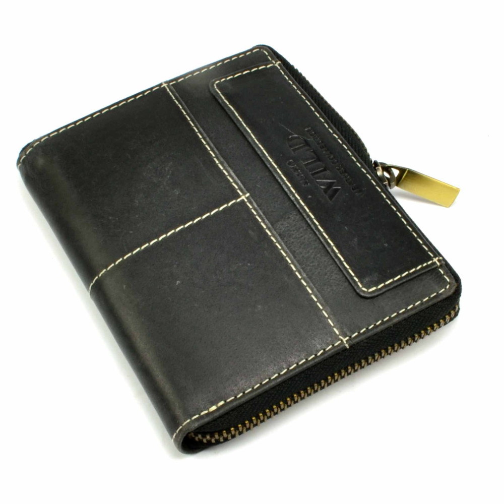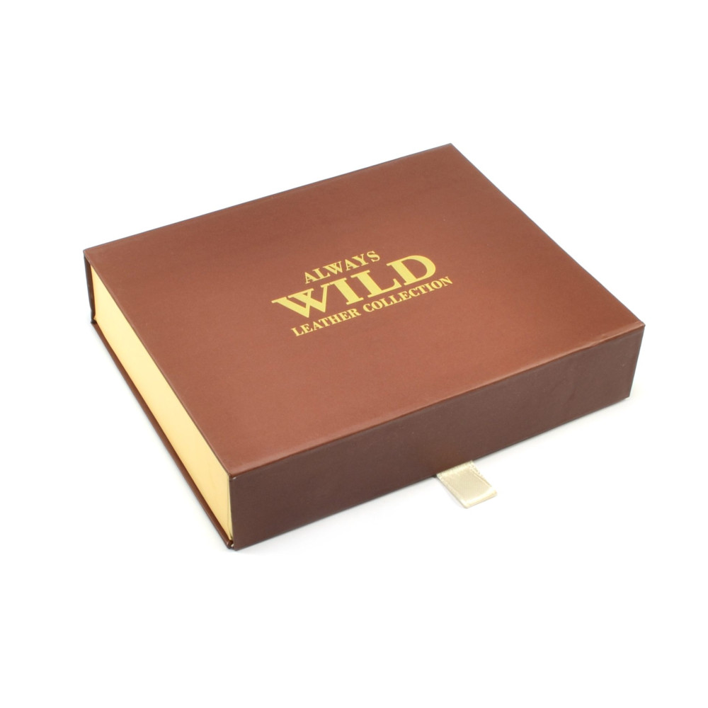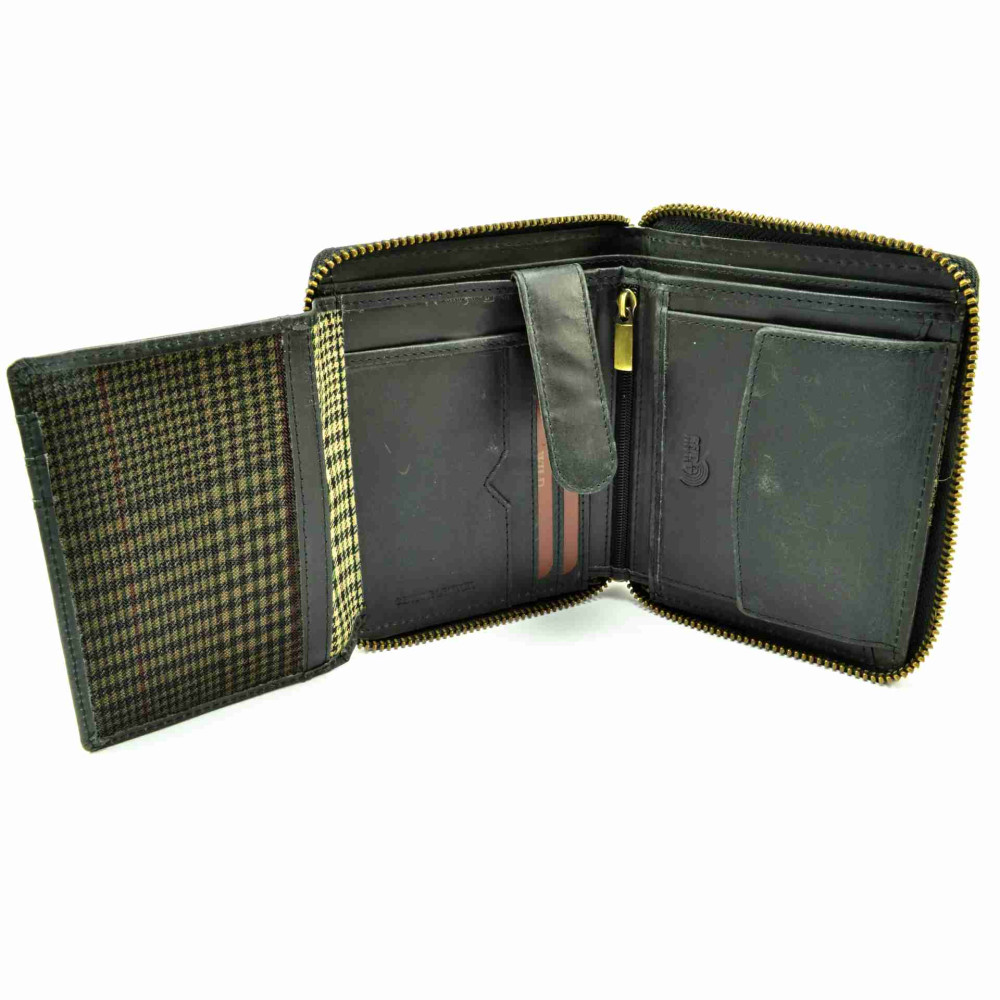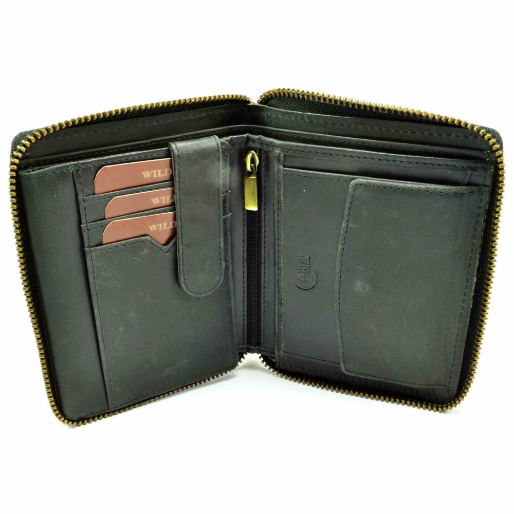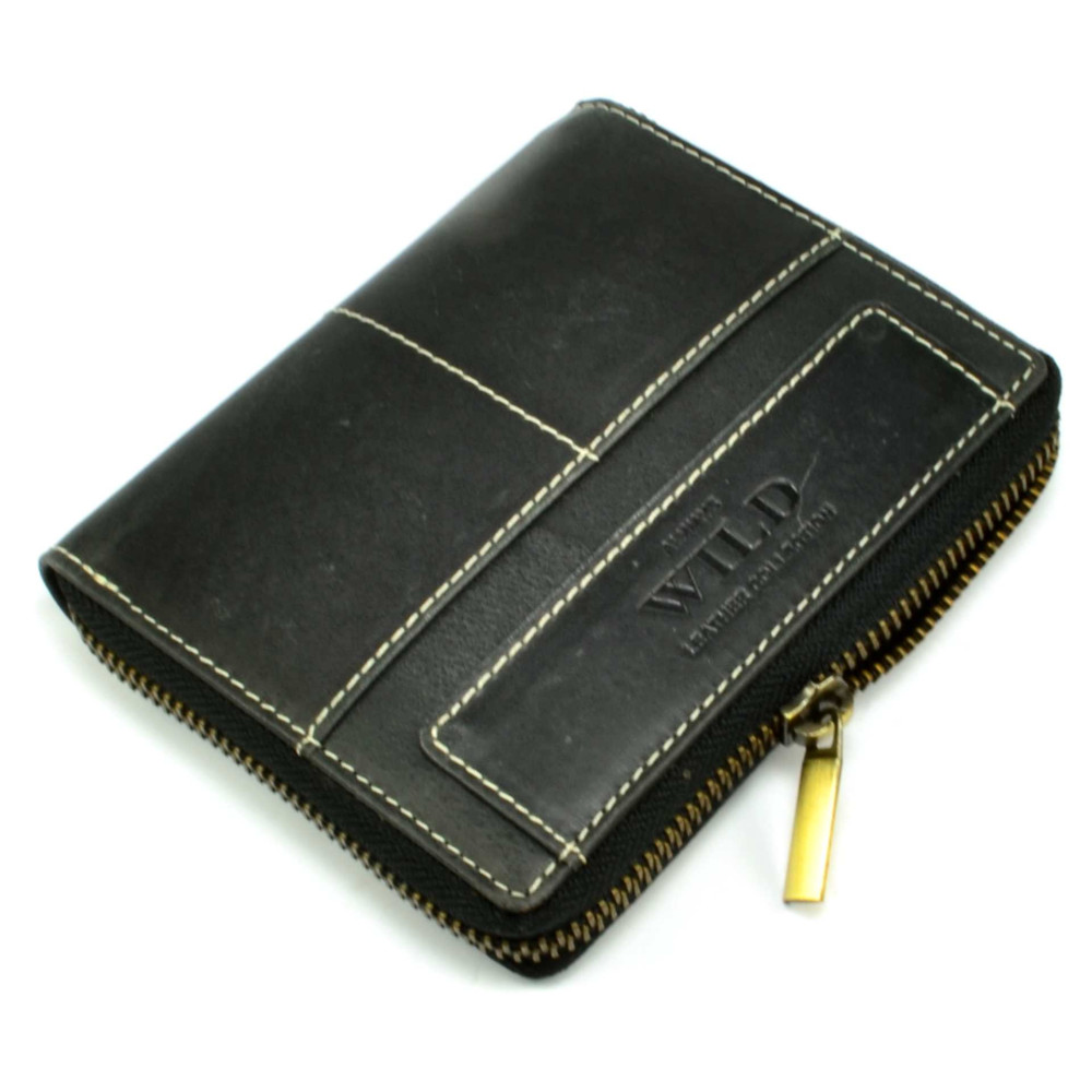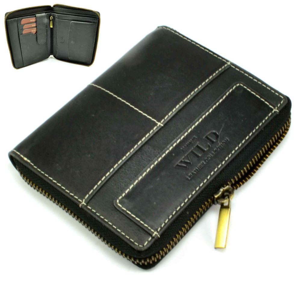 Nezvyklá módní pánská peněženka kožená s uzavíráním na zip. V peněžence najdete dostatek kapes na platební a jiné karty, průhledné velké kapsy na doklady a velké kapsy na bankovky. Mincovník pánské kožené peněženky je klasický, uzavíratelný klopou s pevným drukem. Pánská kožená peněženka je vyrobena z pravé kůže černé barvy a je z kolekce značky Always Wild. Peněženka je dodávána v dárkové karbičce.