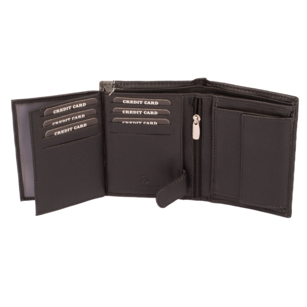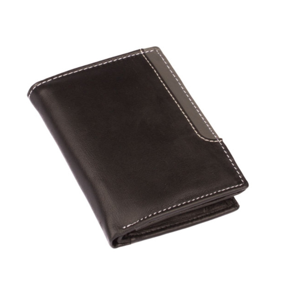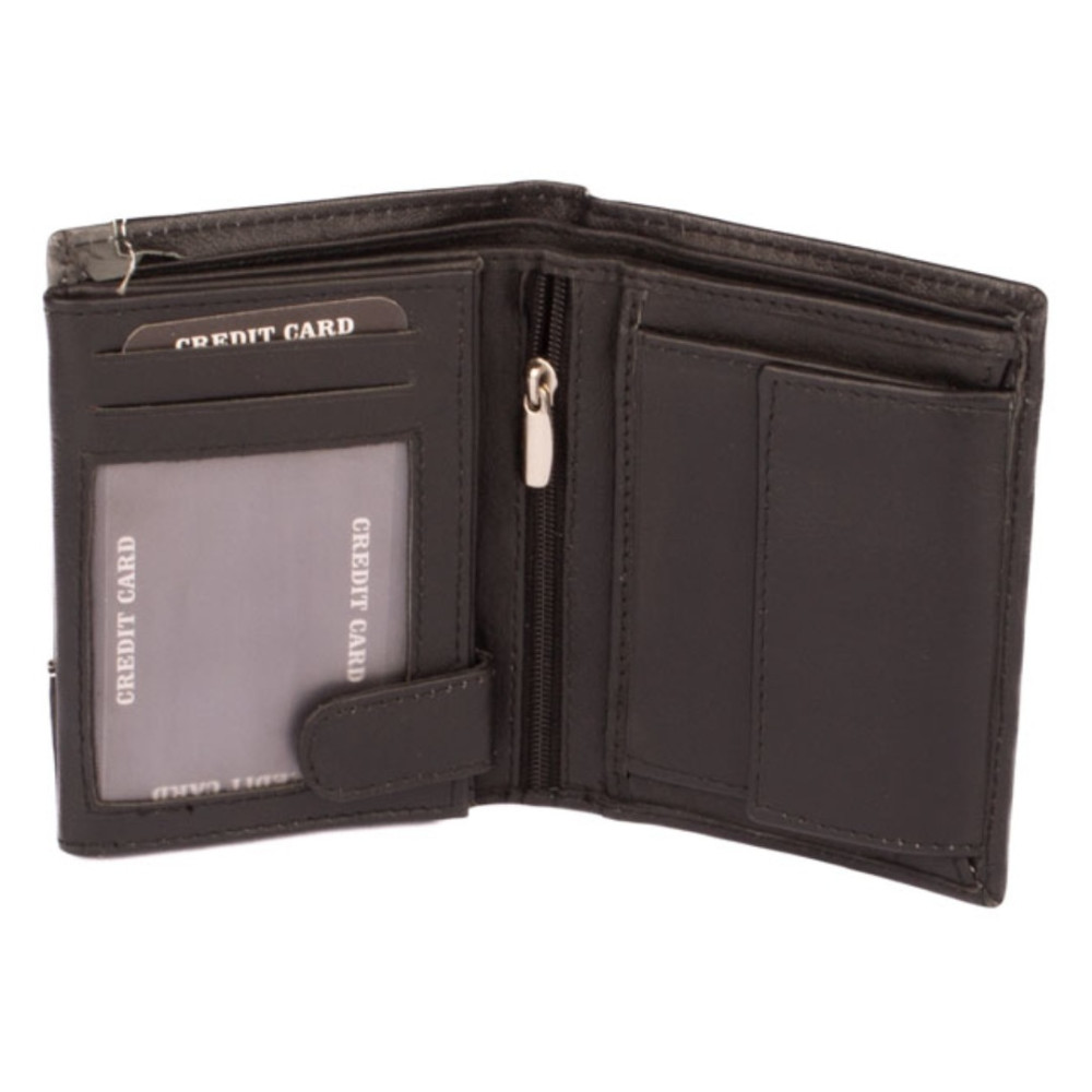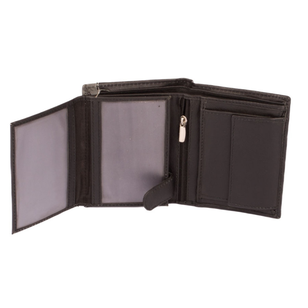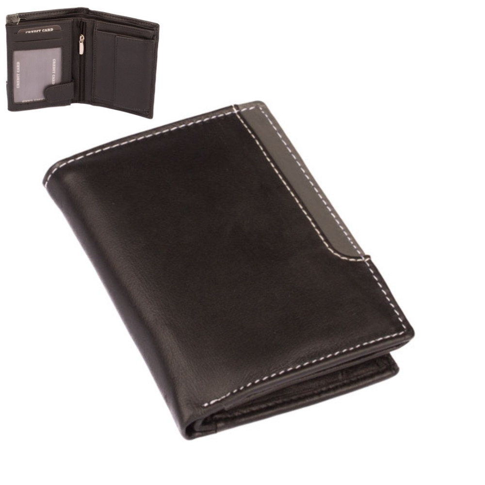 Pánská černá kožená peněženka z pravé kůže s šedým proužkem. Peněženka má uvnitř dostatek kapes na karty, několik průhledných kapes na doklady a dvě velké kapsy na bankovky. V peněžence je také kapsa na zip, do které si můžete schovat své tajnosti. Samozřejmostí peněženky je mincovník, uzavíratelný klopou s pevným drukem. Pánská černá kožená peněženka je vyrobena z pravé kůže černé barvy a je z kolekce značky Dariya Bags.