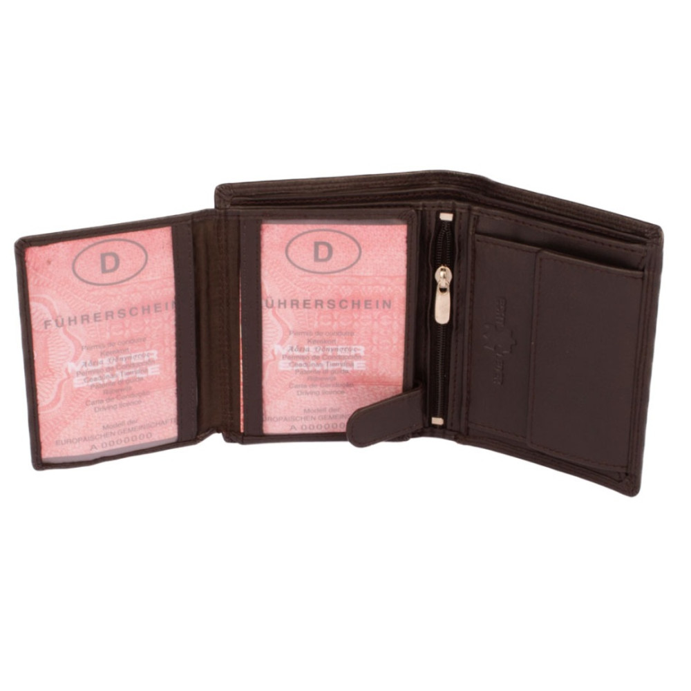 Pánská kožená peněženka hnědá do které se vejdou i nejen vaše peníze, karty ale i doklady. Po otevření peněženky máte ihned přístupné kapsy na karty, jednu z nich průhlednou. Po pravé straně je kapsa na vaše mince, aby necinkaly v kapse. Mincovník se uzavírá klopou s pevným drukem. Nad kapsami jsou dvě velké kapsy na bankovky. Vejdou se všechny české, bez přehnutí.