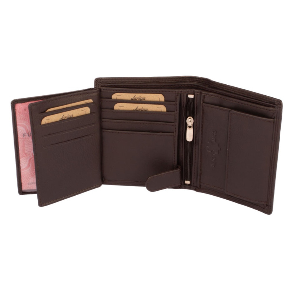 Pánská kožená peněženka hnědá je vyrobena z pravé kůže tmavě hnědé barvy, je z kolekce značky Dariya Bags ale nemá žádné logo. Peněženka je dodávána bez dárkové krabičky. Peněženka je vybavena ochranou proti čtení karet RFID technologií. Vaše karty jsou tedy v bezpečí.