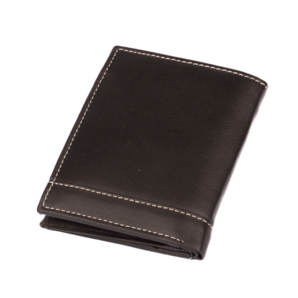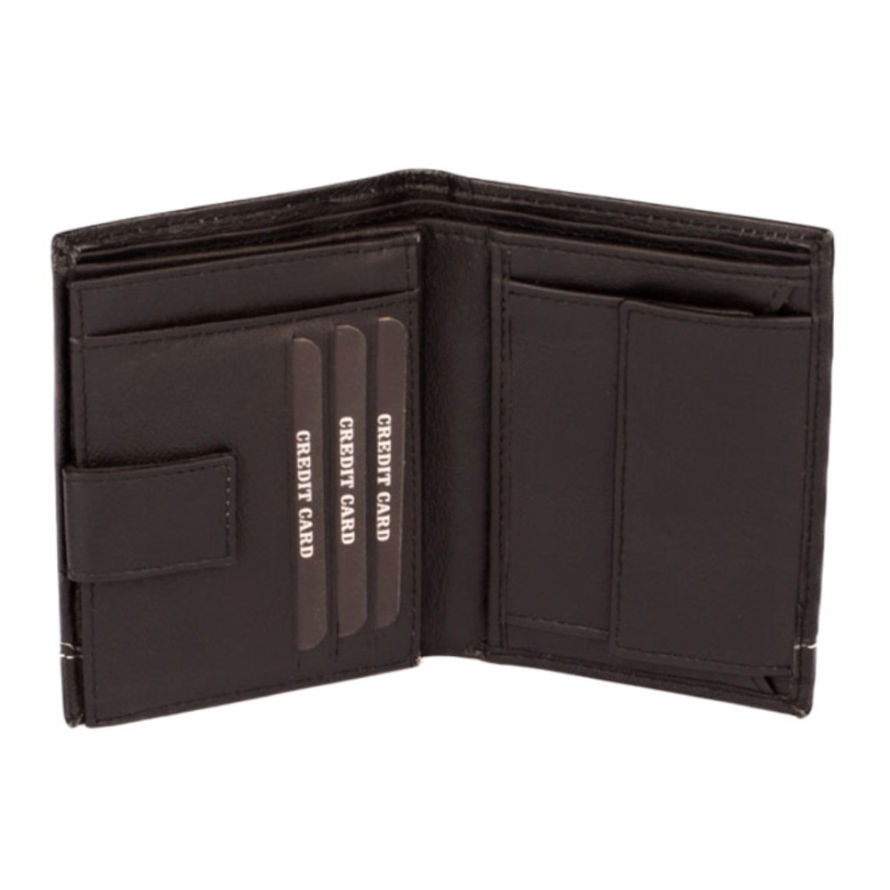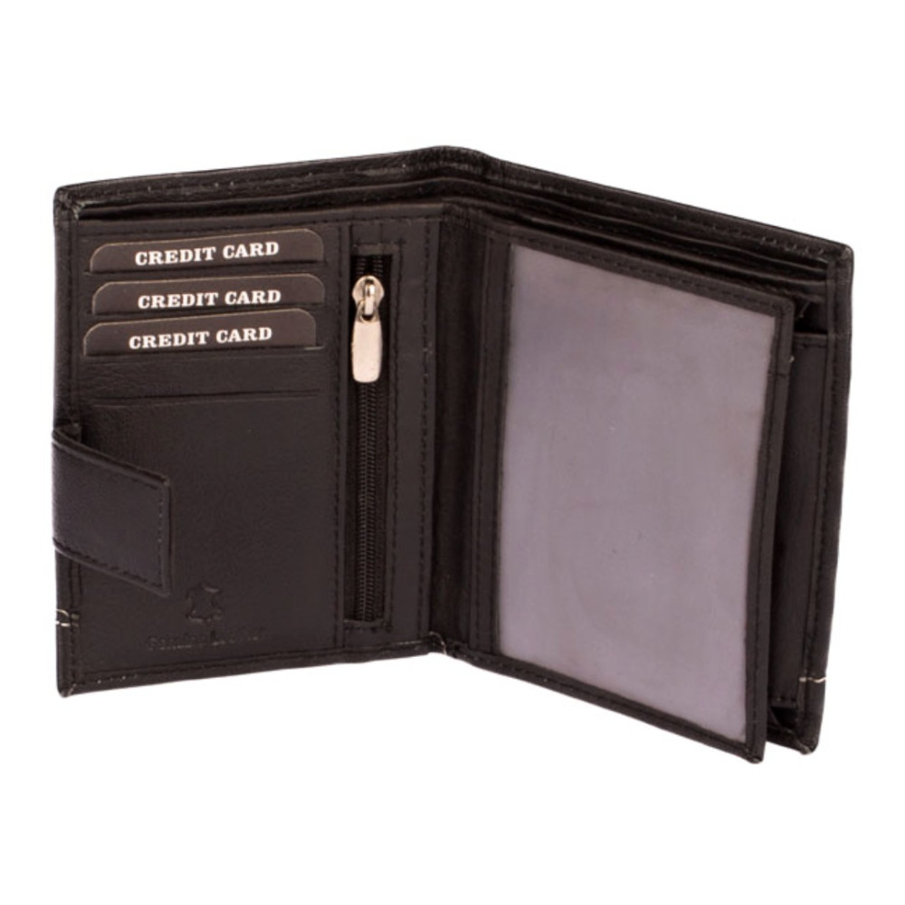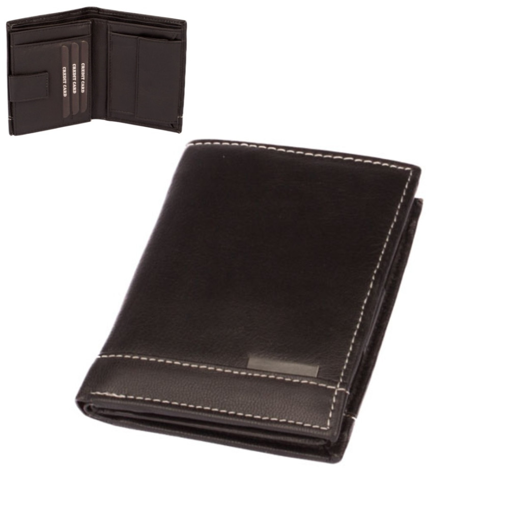 Pánská kožená peněženka černá černá s ozdobným prošíváním světlou nití. Po otevření peněženky čeká uvnitř klasické uspořádání. V pravé části je mincovník uzavíratelný klopou s pevným drukem. V levé části jsou kapsy na karty, jedna z nich je průhledná. Pod přezkou s pevným drukem je schovaná další malá kapsička na zip. Samozřejmostí jsou dvě velké kapsy na bankovky přes celou peněženku. Pánská kožená peněženka černá je vyrobená z pravé měkoučké kůže černé barvy a je značky Dariya Bags. Peněženka je dodávána bez dárkové krabičky.