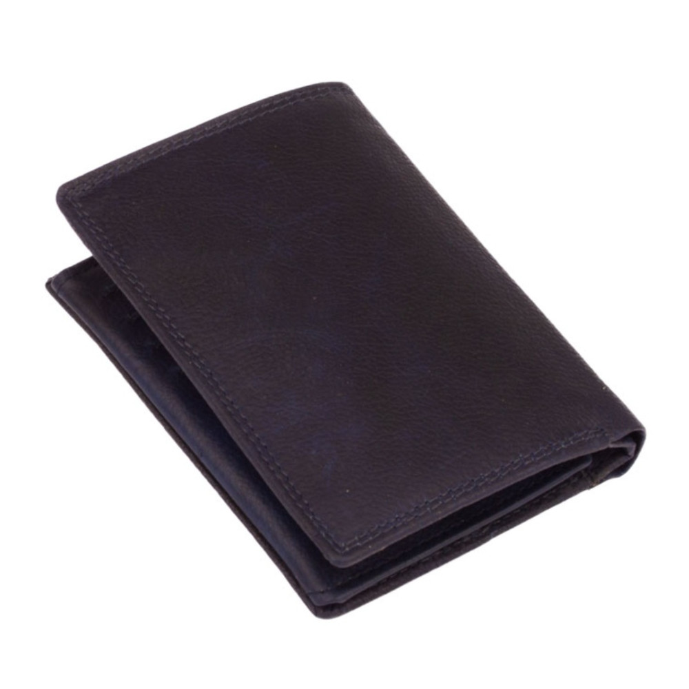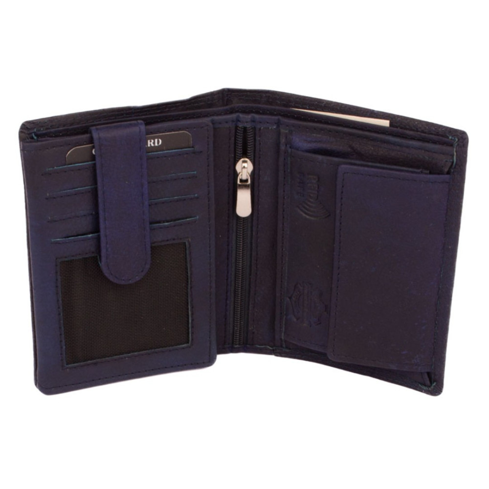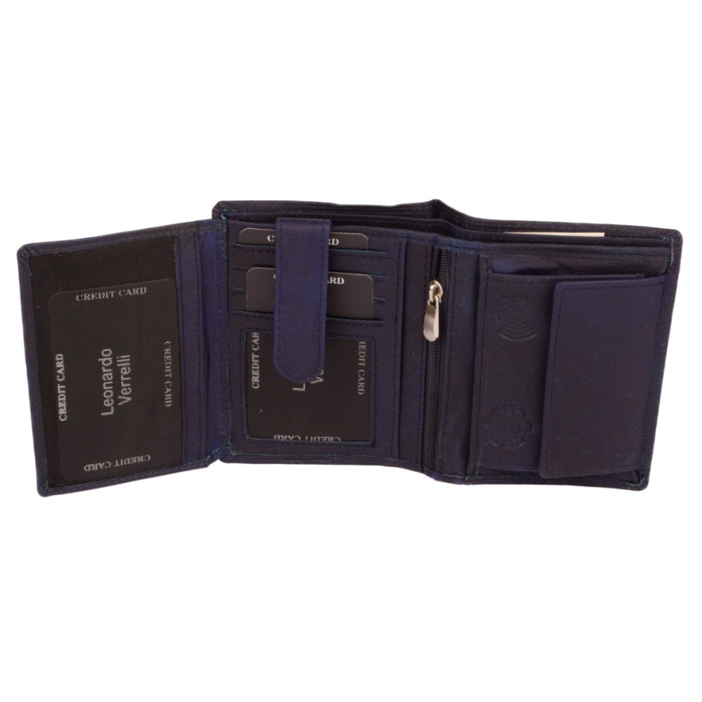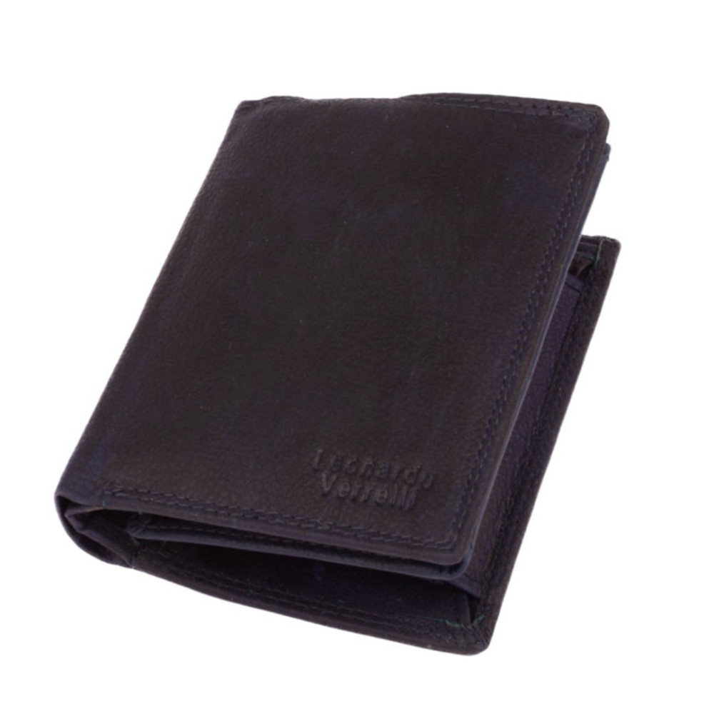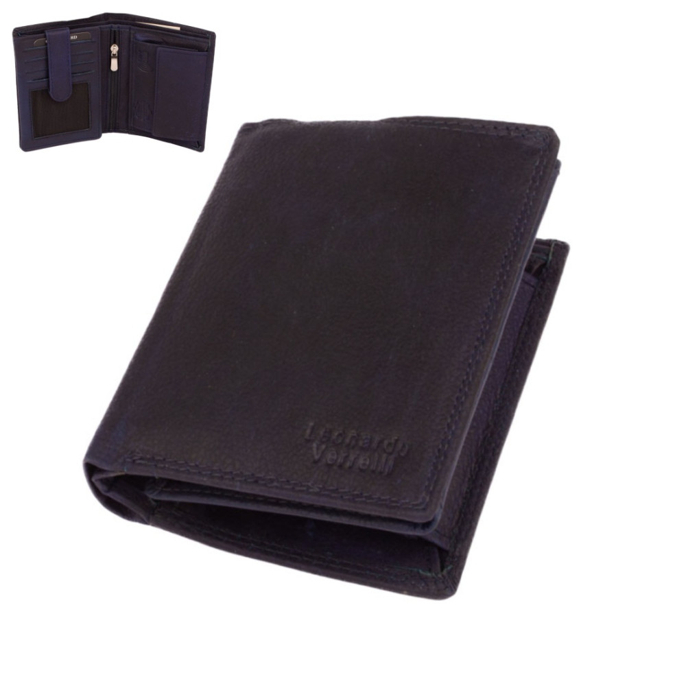 Pánská peněženka kožená z pravé kůže. I přes menší rozměr než klasická, má tato peněženka má dostatek kapes na vaše karty, doklady a bankovky. Po jejím otevření jsou přístupné kapsy na karty, jedna z nich je průhledná. Mincovník po pravé straně se uzavírá klopou s pevným drukem. V horní části peněženky jsou dvě velké kapsy na doklady. Do obou se české bankovky vejdou bez přeložení. Po otevření přezky uvnitř peněženky jsou přístupné zbývající kapsy na karty, některé jsou průhledné. Tajné věci ukryjete v několika vnitřních skrytých a tenkých kapsách. Pánská peněženka kožená je vyrobena z pravé kůže tmavě modré barvy, je značky Leonardo Verrelli. K peněžence je dodávána dárková krabička s logem výrobce. Peněženka je také vybavena RFID ochranou proti nechtěnému čtení karet.