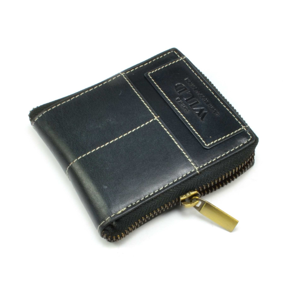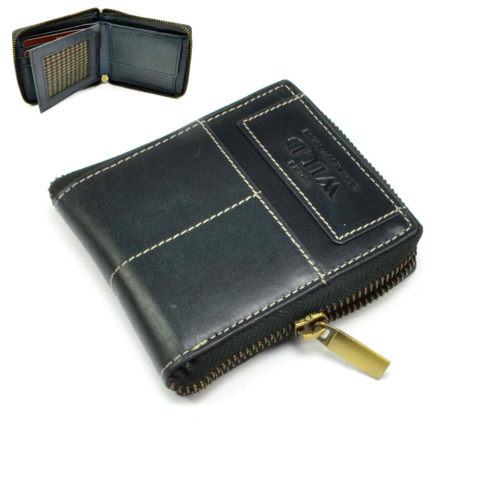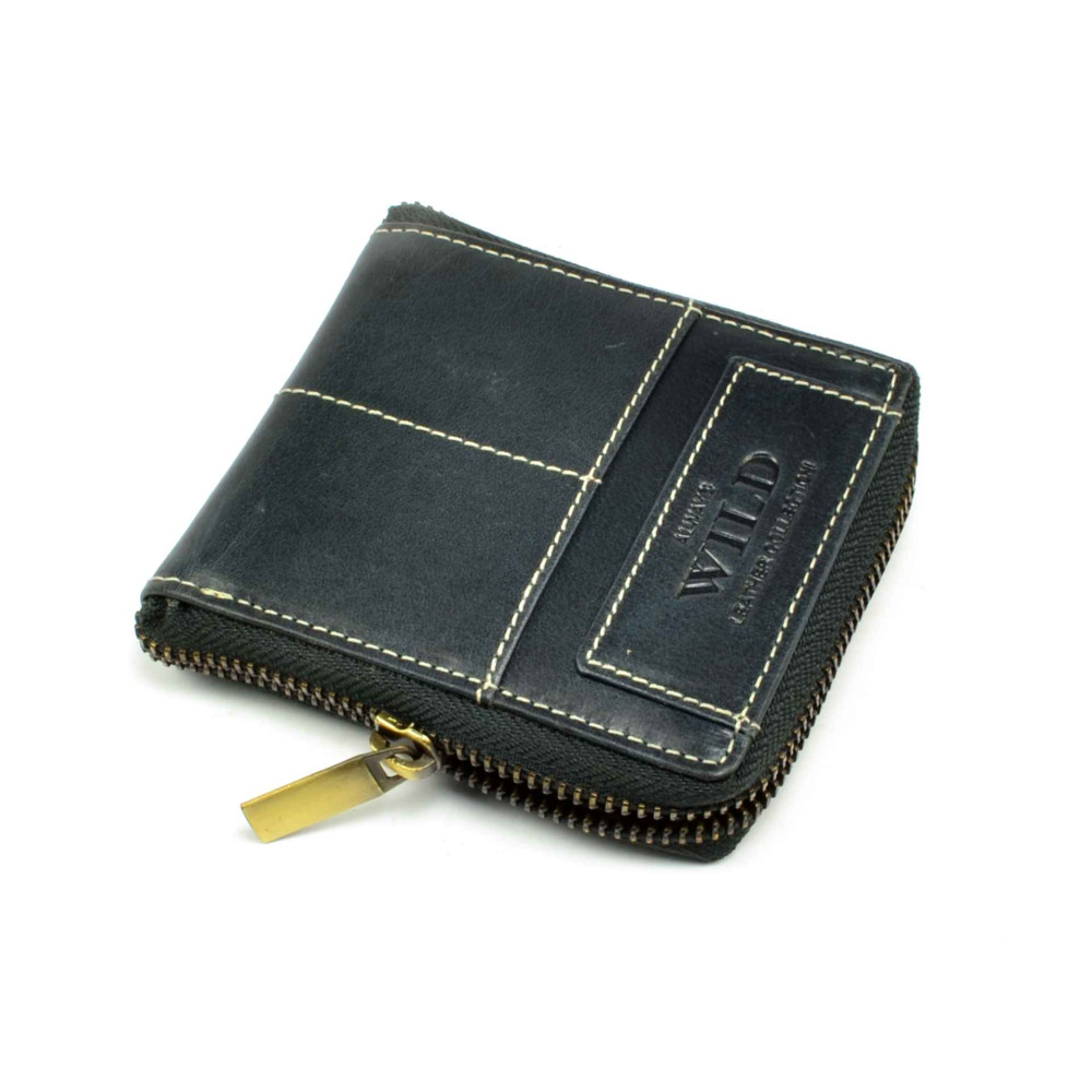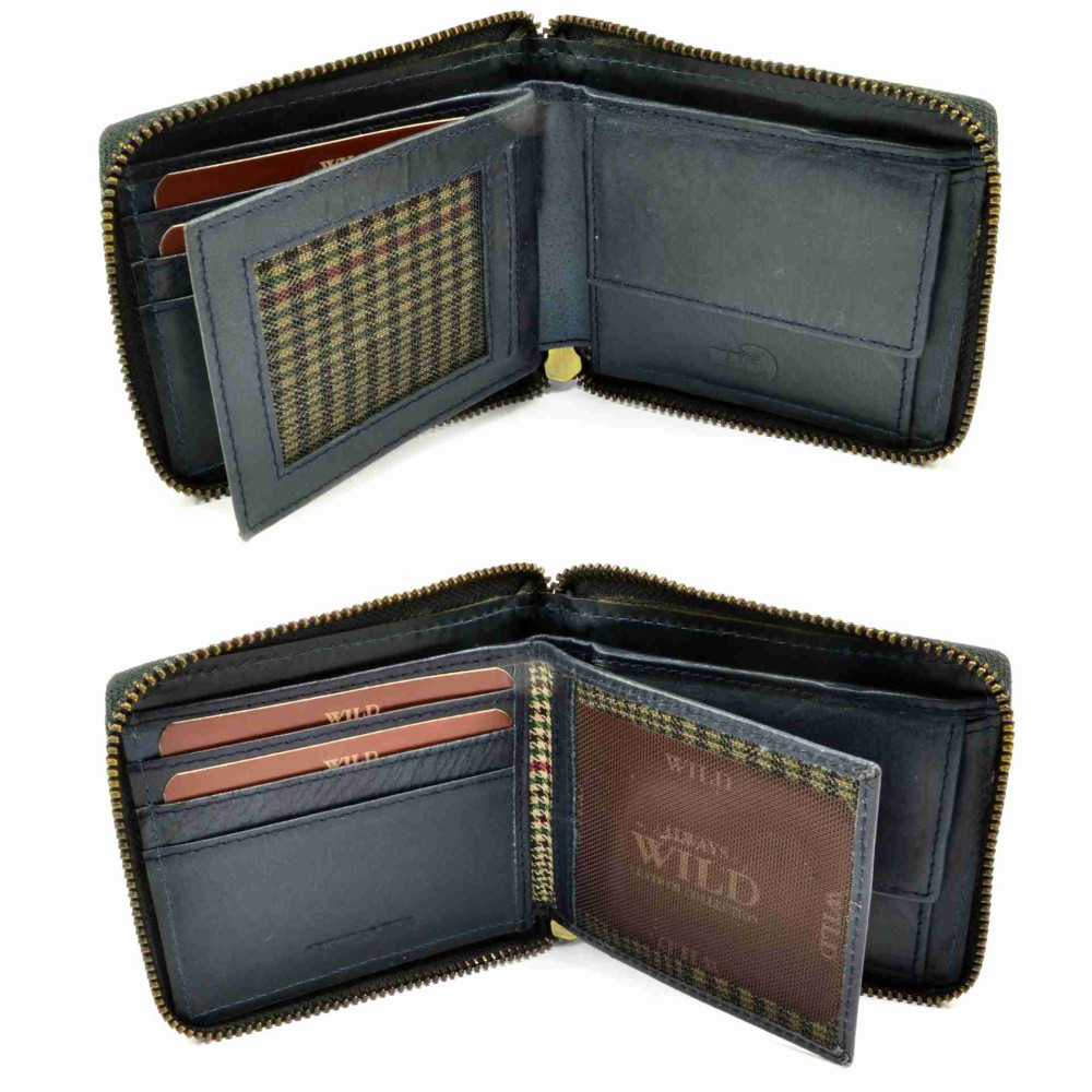 Peněženka pánská malá temně modré barvy se uzavírá pevným zipem s velkým jezdcem pro pohodlné otevírání. Peněženka je menších rozměrů, ale vejde se do ní vše potřebné. Má dostatek kapes na karty, některé jsou průhledné. Samozřejmostí je kapsa na bankovky a mincovník s klopou a pevným drukem. Peněženka je vyrobená z pravé kůže a je značky Always Wild. Peněženku dostanete v dárkové krabičce.
