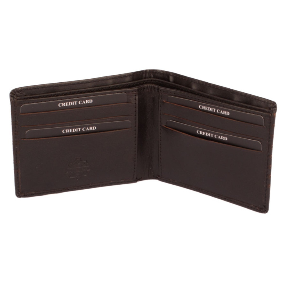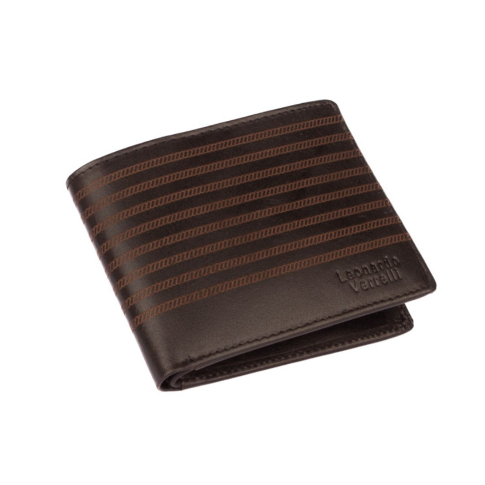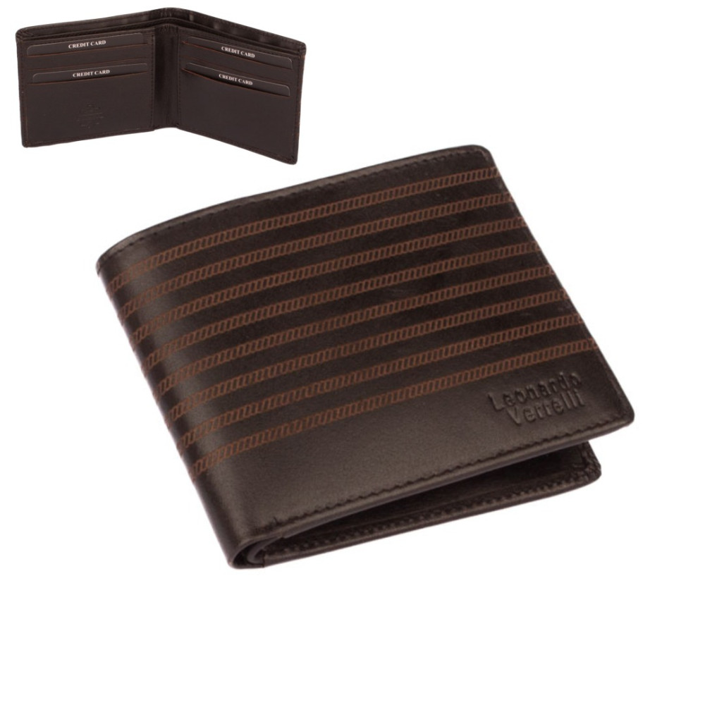 Peněženka kožená malá pánská z pravé kůže. Peněženka má kapsy na karty i bankovky. Po jejím otevření jsou přístupné kapsy na karty i bankovky. Mincovník není v této peněžence. V horní části peněženky jsou dvě velké kapsy na doklady. Do obou se české bankovky vejdou bez přeložení. Tajné věci ukryjete ve dvou vnitřních tenkých kapsách. Peněženka kožená malá pánská je vyrobena z pravé kůže černé s hnědými proužky barvy a je značky Leonardo Verrelli. Peněženka je dodávána v dárkové krabičce. Peněženka je také vybavena RFID ochranou proti nechtěnému čtení karet.