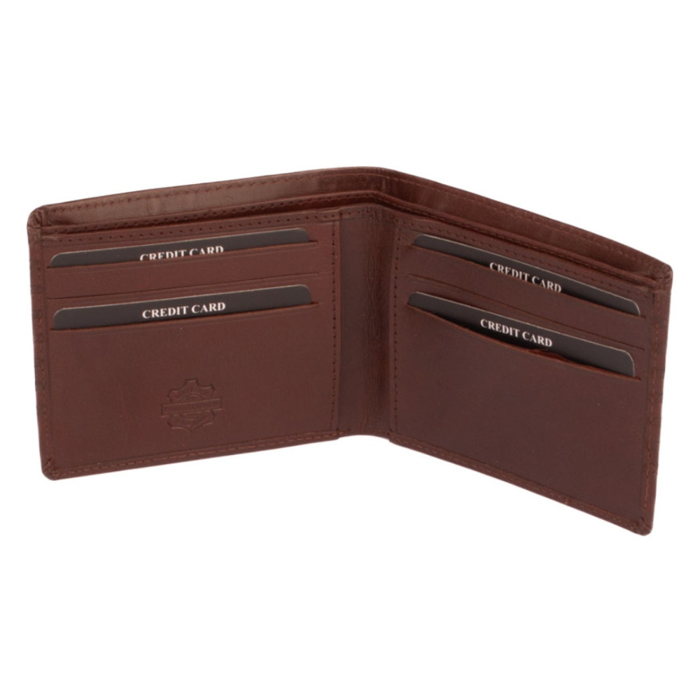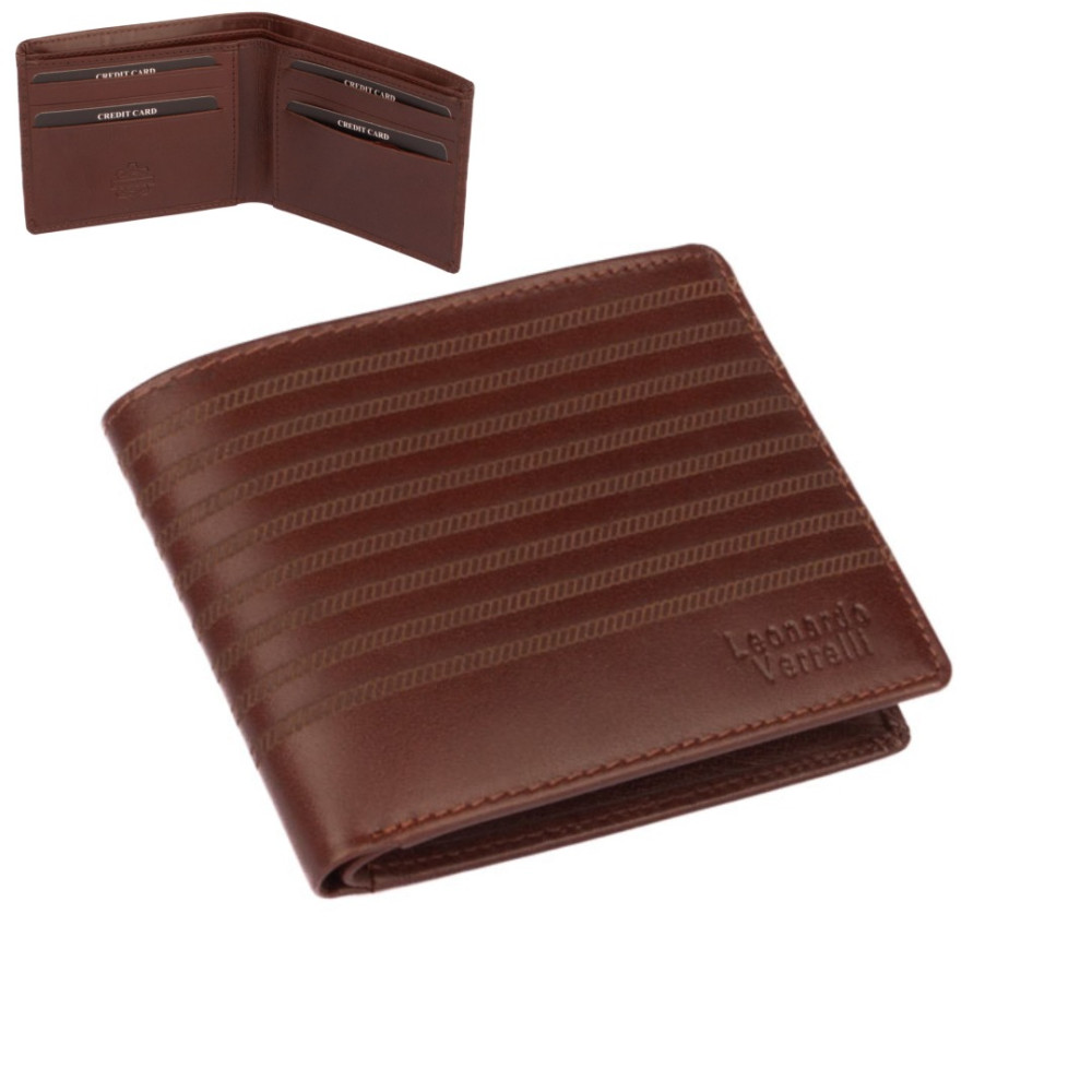 Peněženka kožená pánská hnědá z pravé kůže. Peněženka má kapsy na karty i bankovky. Po jejím otevření jsou přístupné kapsy na karty i bankovky. Mincovník není v této peněžence. V horní části peněženky jsou dvě velké kapsy na doklady. Do obou se české bankovky vejdou bez přeložení. Tajné věci ukryjete ve dvou vnitřních tenkých kapsách. Peněženka kožená pánská hnědá je vyrobena z pravé kůže hnědé barvy a je značky Leonardo Verrelli. Peněženka je dodávána v dárkové krabičce. Peněženka je také vybavena RFID ochranou proti nechtěnému čtení karet.