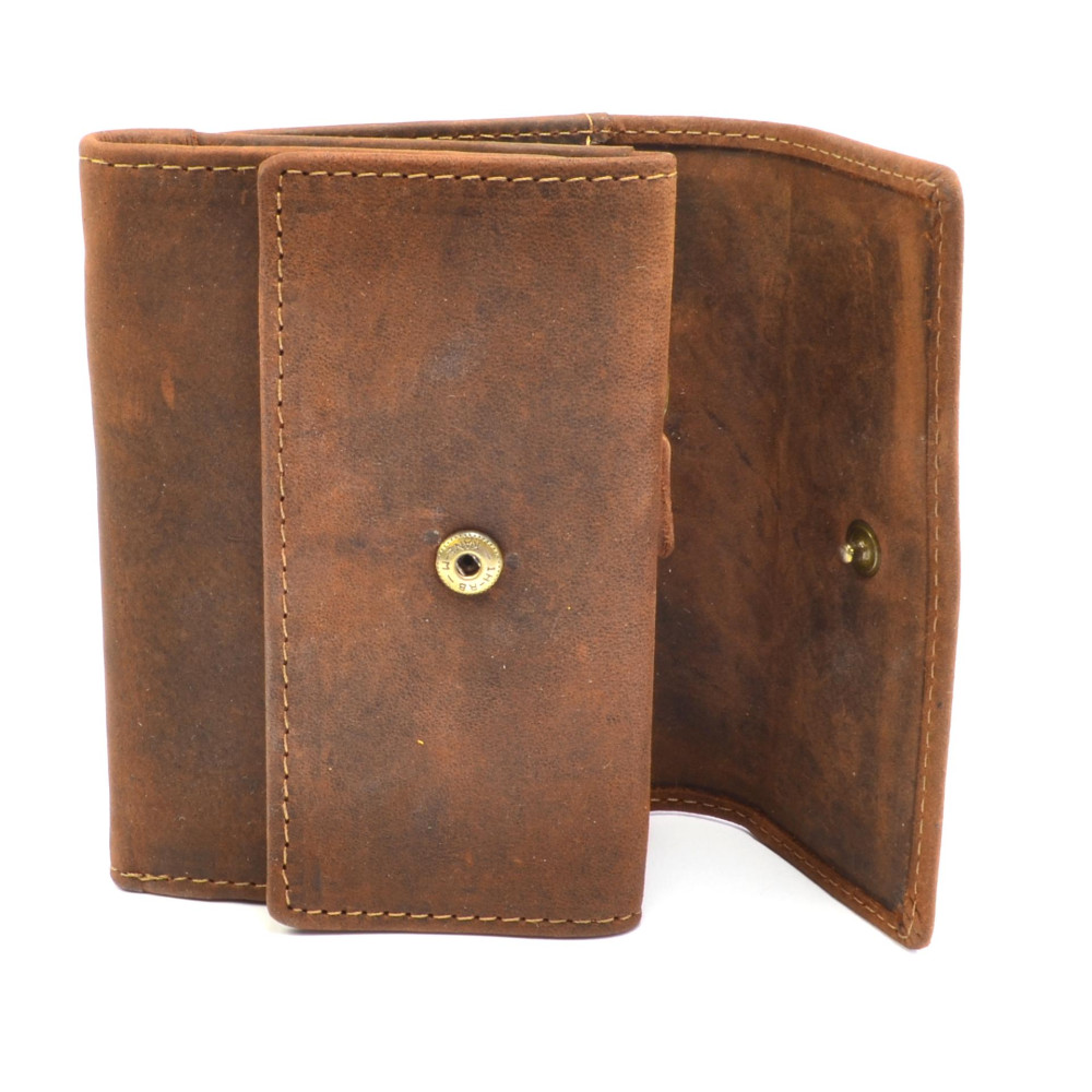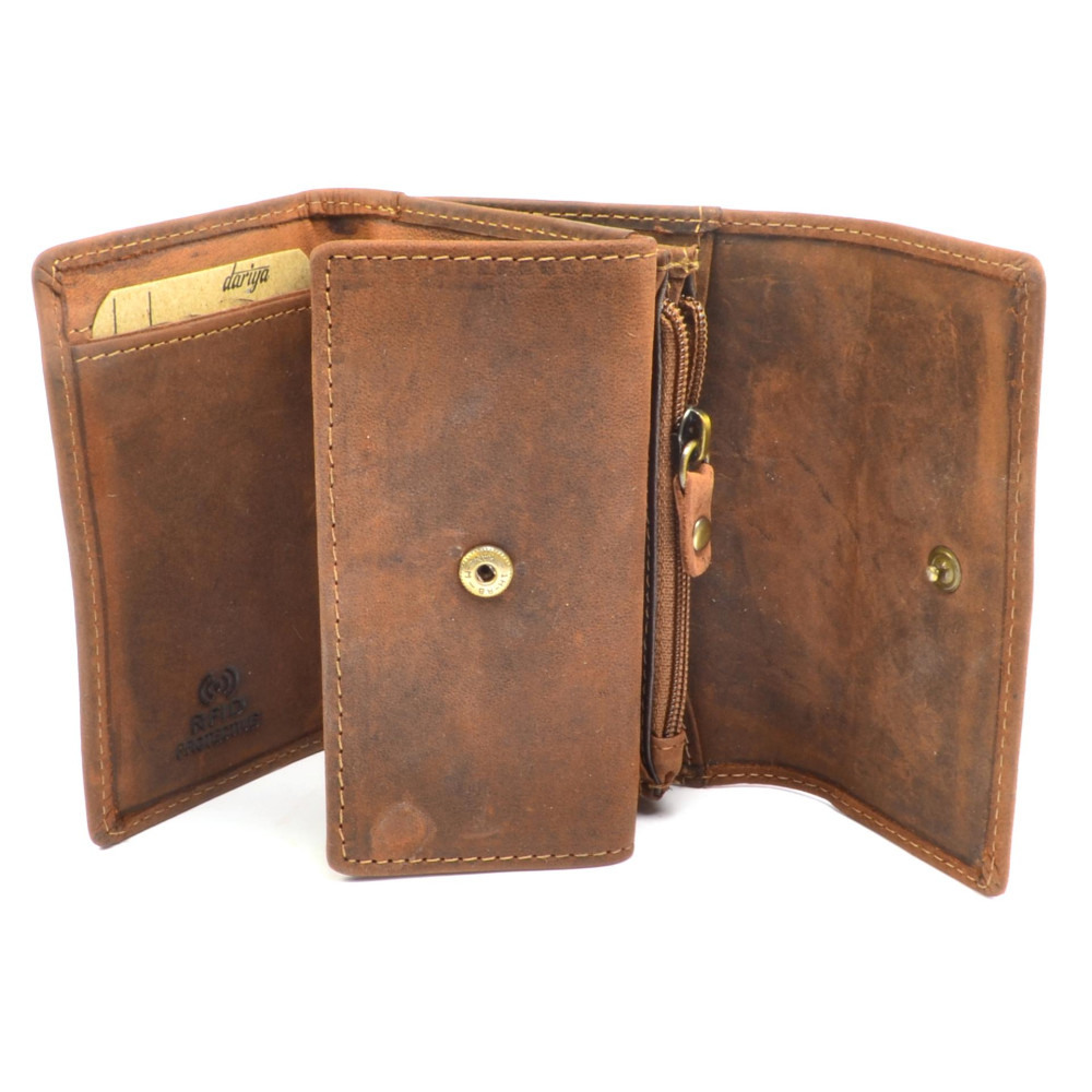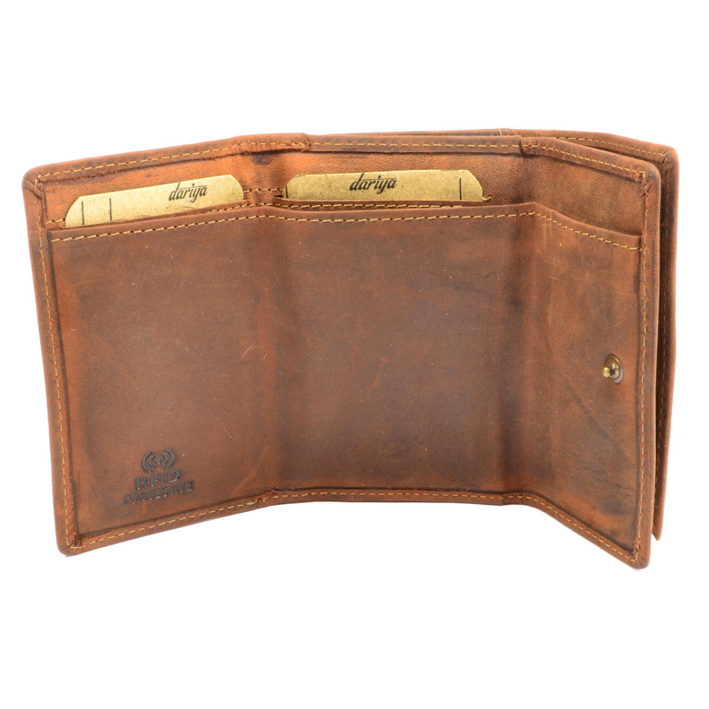 Peněženka malá pánská neobvyklého vzhledu z pravé kůže tmavě hnědé barvy. Peněženky malé pánské jsou ideální řešení pro ty co nenosí moc peněz, stačí jim pár kapes na karty, bankovky a mincovník. Mincovník má tři kapsičky, jednu z nich na zip. Peněženka malá je vyrobena z pravé kůže a je značky Dariya bags.