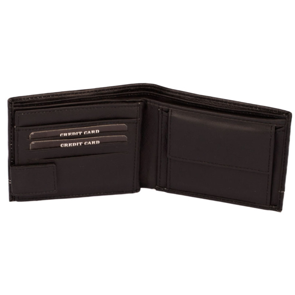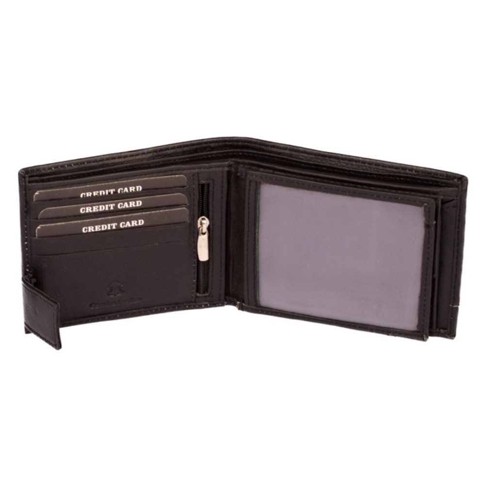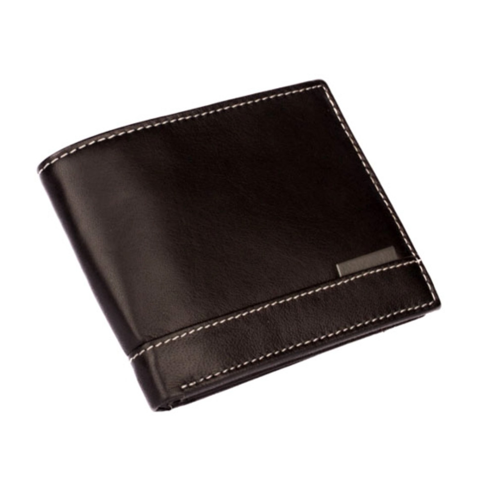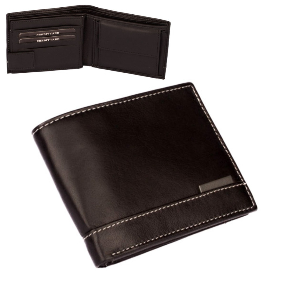 Pánská kožená peněženka černá s ozdobným prošíváním světlou nití. Po otevření peněženky čeká uvnitř klasické uspořádání. V pravé části je mincovník uzavíratelný klopou s pevným drukem. V levé části jsou kapsy na karty, jedna z nich je průhledná. Pod přezkou s pevným drukem je schovaná další malá kapsička na zip. Samozřejmostí jsou dvě velké kapsy na bankovky přes celou peněženku. Pánská kožená peněženka je vyrobená z pravé měkoučké kůže černé barvy a je značky Dariya Bags. Peněženka je dodávána bez dárkové krabičky.