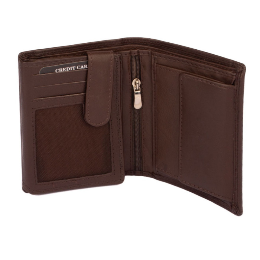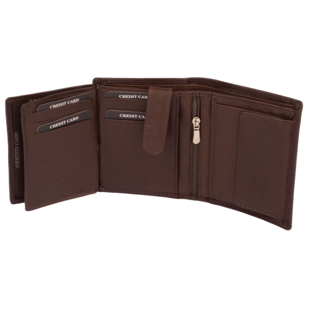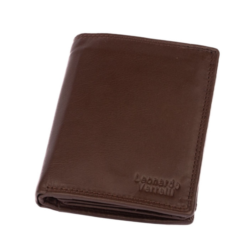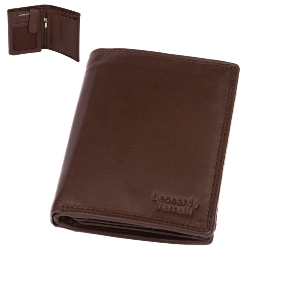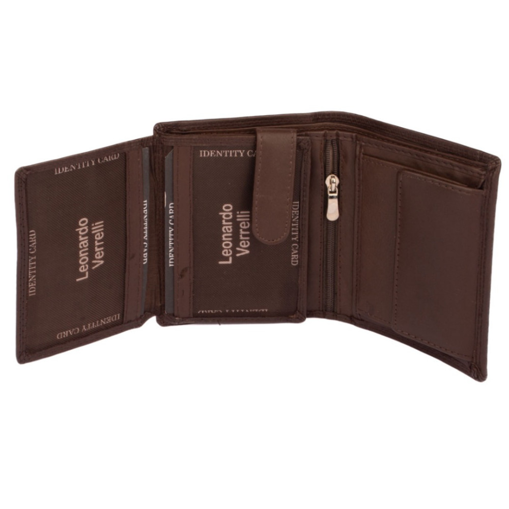 Peněženka pánská kožená hnědá z pravé kůže. I přes menší rozměr než klasická, má tato peněženka má dostatek kapes na vaše karty, doklady a bankovky. Po jejím otevření jsou přístupné kapsy na karty, jedna z nich je průhledná. Mincovník po pravé straně se uzavírá klopou s pevným drukem. V horní části peněženky jsou dvě velké kapsy na doklady. Do obou se české bankovky vejdou bez přeložení. Po otevření přezky uvnitř peněženky jsou přístupné zbývající kapsy na karty, některé jsou průhledné. Tajné věci ukryjete v několika vnitřních skrytých a tenkých kapsách. Peněženka pánská kožená hnědá je vyrobena z pravé kůže hnědé barvy, je značky Leonardo Verrelli. Peněženka je také vybavena RFID ochranou proti nechtěnému čtení karet.