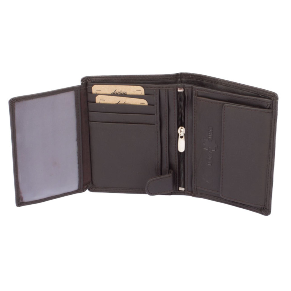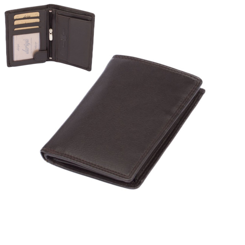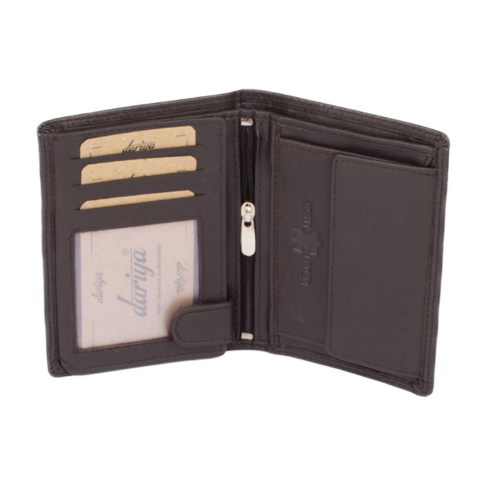 Pořádná pánská kožená tmavě hnědá peněženka z pořádné kůže v šedo hnědé barvě. Po otevření peněženky jsou přístupné kapsy na karty, jedna z nich je průhledná a mincovník, který uzavřete klopou s pevným drukem. Dvě velké kapsy na bankovky pojmou všechnu vaši hotovost. Odepnutím vnitřní přezky v peněžence a otevřením klopy se ukáží další kapsy, jedna z nich je průhledná. Tajné věci pohodlně schováte do skrytých kapes. Peněženka je značky Dariya Bags. Peněženka je dodávána bez dárkové krabičky.