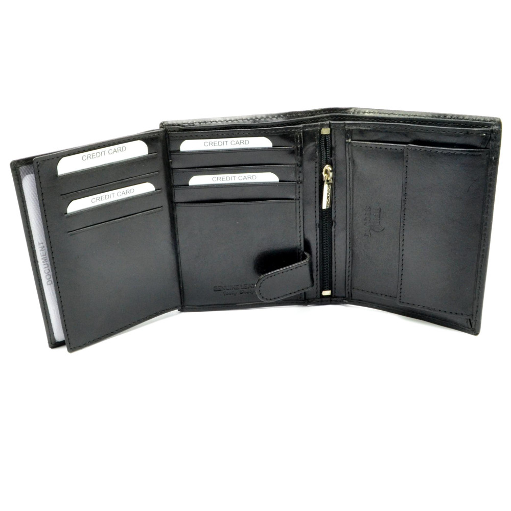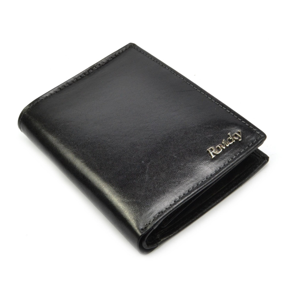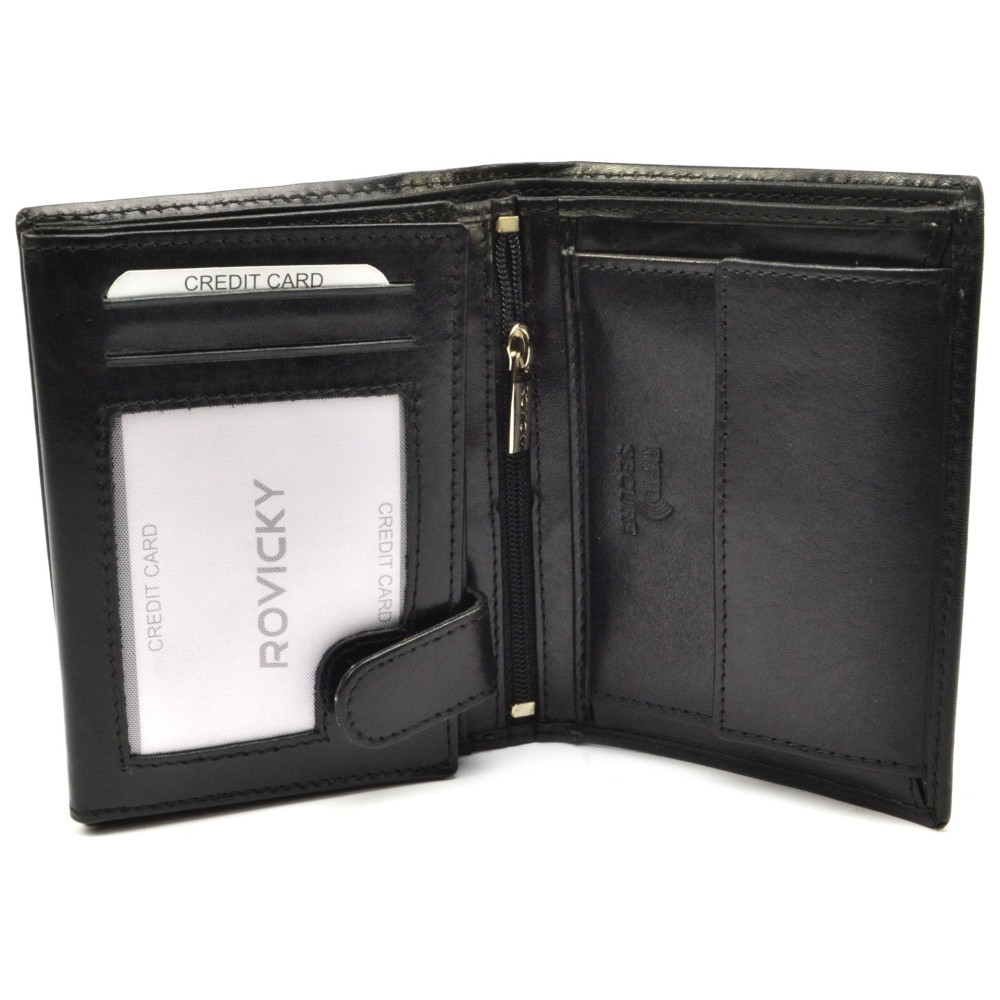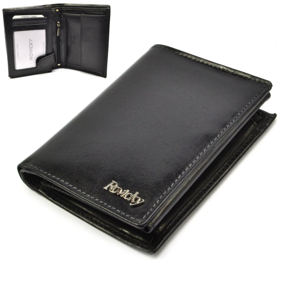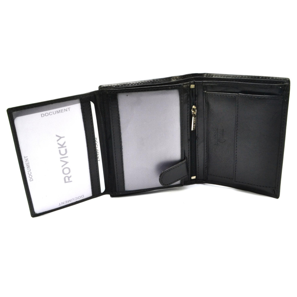 Velká pánská kožená peněženka je vyrobena z vysoce kvalitní jemné kůže. Uvnitř velké peněženky pánské kožené je dostatek kapes na platební a jiné karty. Samozřejmostí jsou velké kapsy na bankovky a mincovník s klopou. Peněženka je vyrobena z pravé kůže černé barvy a je značky Rovicky.