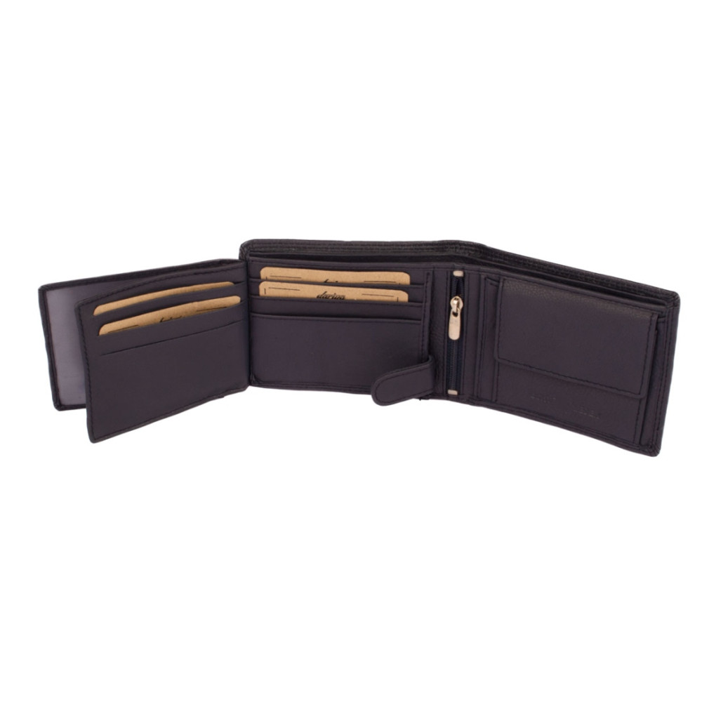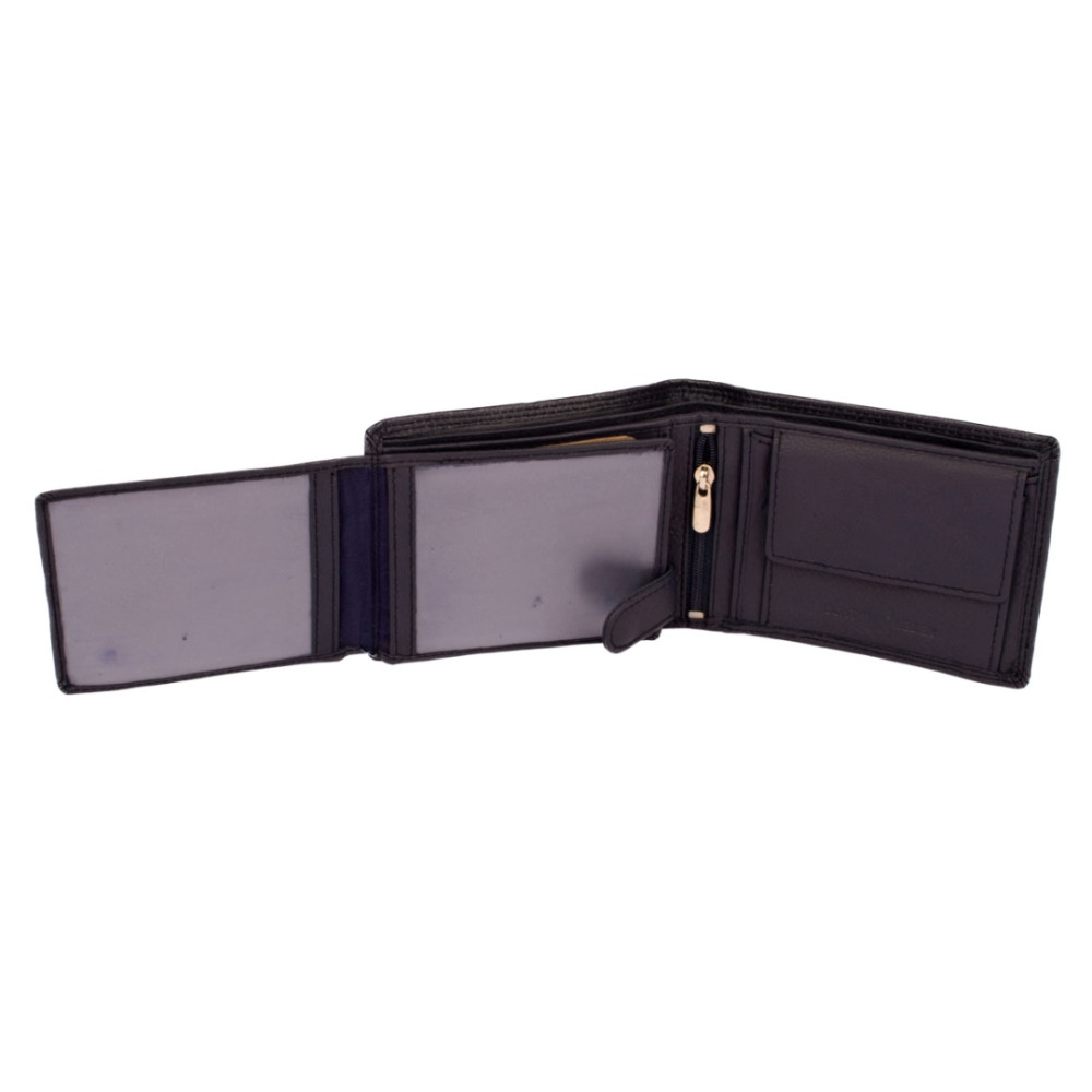 Kožená pánská peněženka tmavá do které se vejdou i nejen vaše peníze, karty ale i doklady. Po otevření peněženky máte ihned přístupné kapsy na karty, jednu z nich průhlednou. Po pravé straně je kapsa na vaše mince, aby necinkaly v kapse. Mincovník se uzavírá klopou s pevným drukem. Nad kapsami jsou dvě velké kapsy na bankovky. Vejdou se všechny české, bez přehnutí.