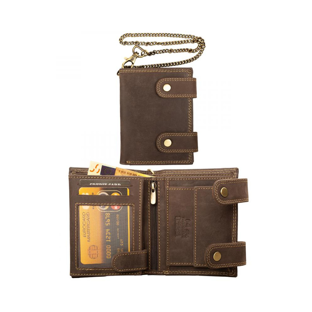 Pánská peněženka kožená s motivem zmačkané kůže se uzavírá přezkami s pevnými druky. Po otevření peněženky jsou přístupné kapsy na karty, mincovník a kapsy na bankovky. Otevřením další přezky s drukem je přístupná další část peněženky, ve které jsou průhledné kapsy na doklady a kapsy na karty. Peněženka je vyrobená z pravé kůže hnědé barvy a je značky Dariya bags. Pro pohodlné nošení využijete určitě řetěz.
