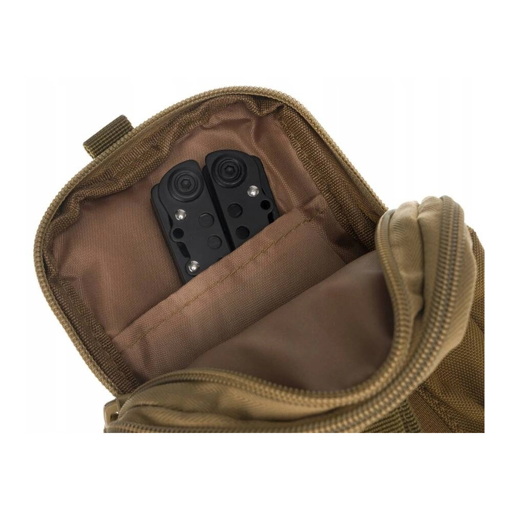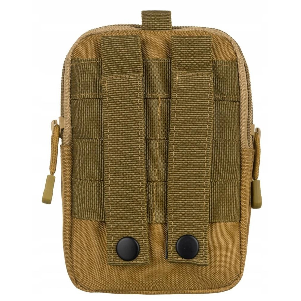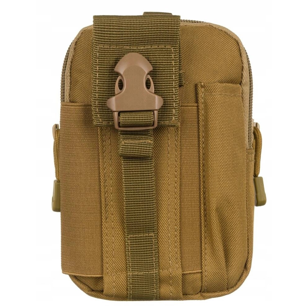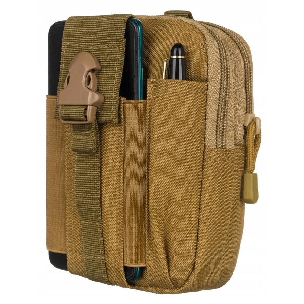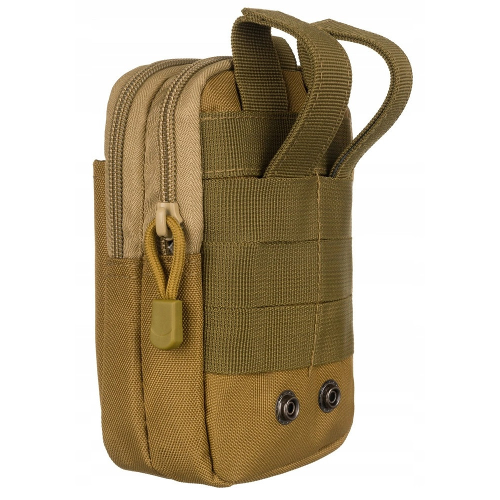 Textilní pouzdro na doklady a mobilní telefon je vyrobeno ve světle hnědé barvy. K zavěšení na opasek slouží poutka na zadní straně pouzdra. Pouzdro má dvě velké kapsy které se uzavírají zipem. Na přední straně pouzdra je druhá kapsa na mobilní telefon a propisku. Pouzdro je značky Inny.