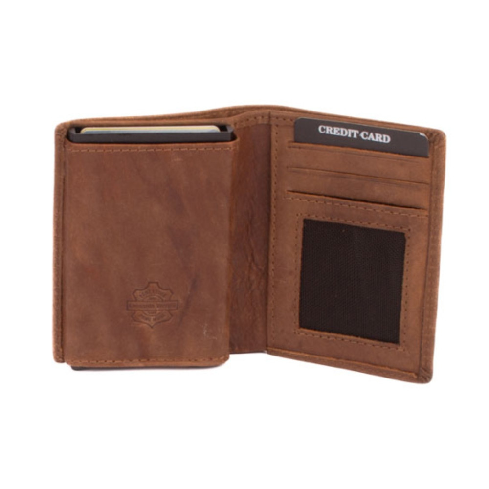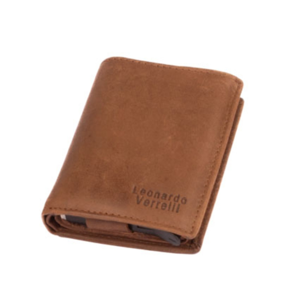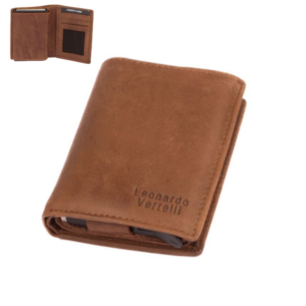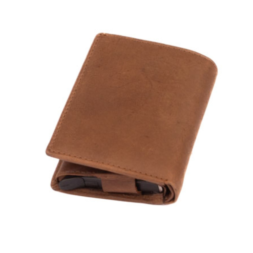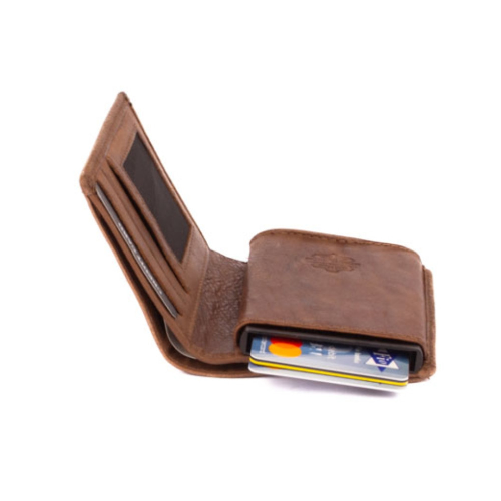 Hnědé kožené luxusní pouzdro na karty s vysouvacím mechanismem v koženém obalu. Po otevření pouzdra je na levé straně v kožené kapse hliníkový obal, který slouží k uložení karet. Karty nastrkáte do hliníkového obalu a zatlačíte dovnitř. Pro jejich vysunutí zmáčknete páčku na dolní straně pouzdra. Karty všechny vyjedou ale tak, že každá se povysune o kousek dál něž ta předchozí. Pohodlně z pouzdra na karty vyndáte jen tu jednu kartu, kterou potřebujete. Tajné věci můžete schovat do dvou tenkých kapes uvnitř pouzdra. Na pravé straně uvnitř pouzdra jsou další kapsy na karty, jedna průhledná. Nad nimi je kapsa na bankovky. České bankovky do hodnoty 200 Kč se vejdou bez přehnutí. Hnědé kožené luxusní pouzdro na karty je vyrobené z pravé kůže světle hnědé barvy a je dodáváno v dárkové krabičce. Pouzdro má ochranu karet proti čtení technologií RFID. Pouzdro lze využít i jako malou peněženku.