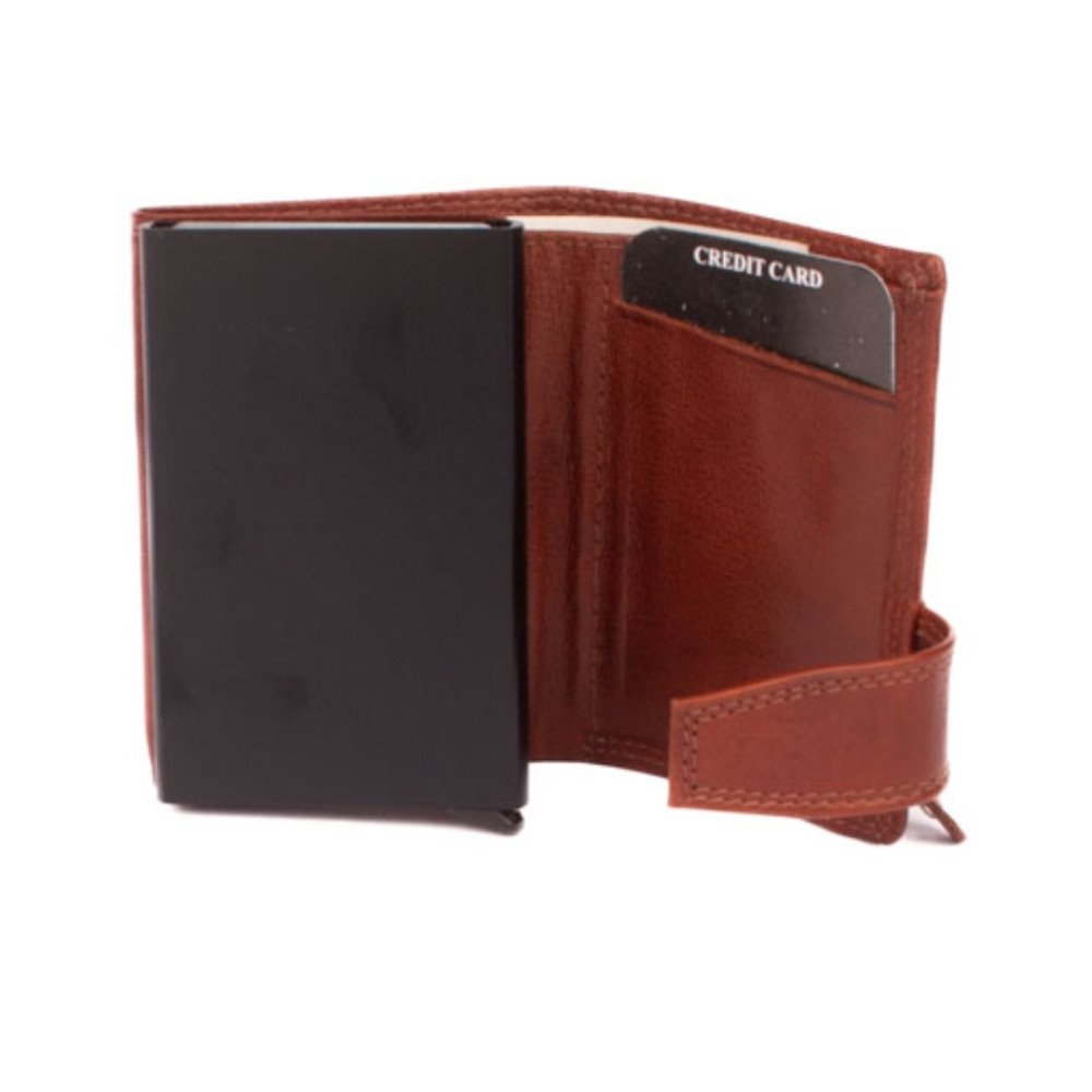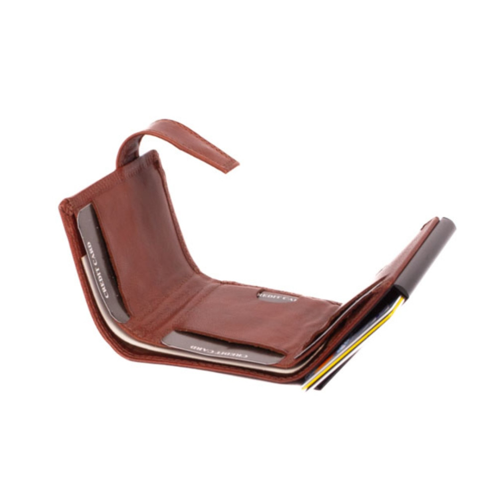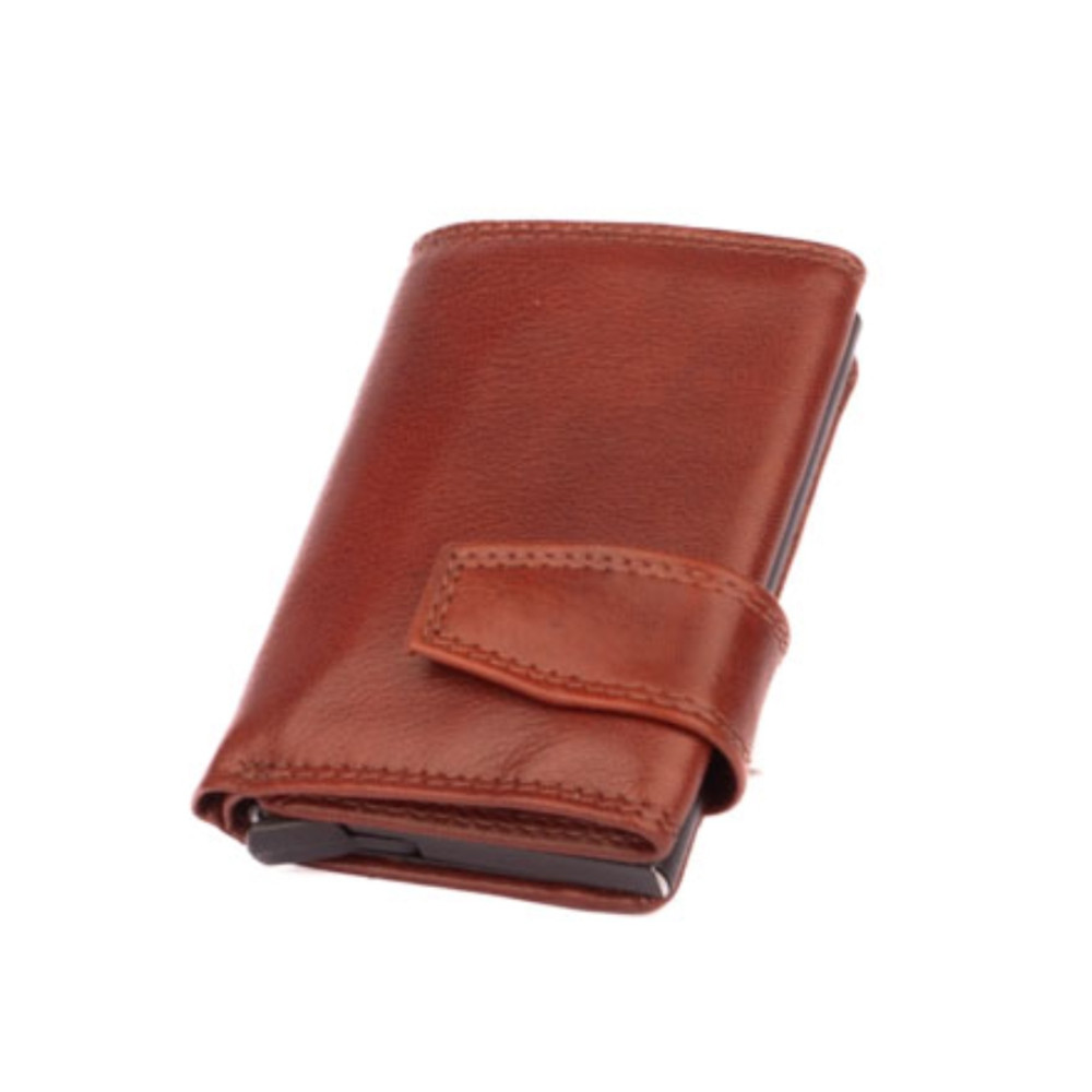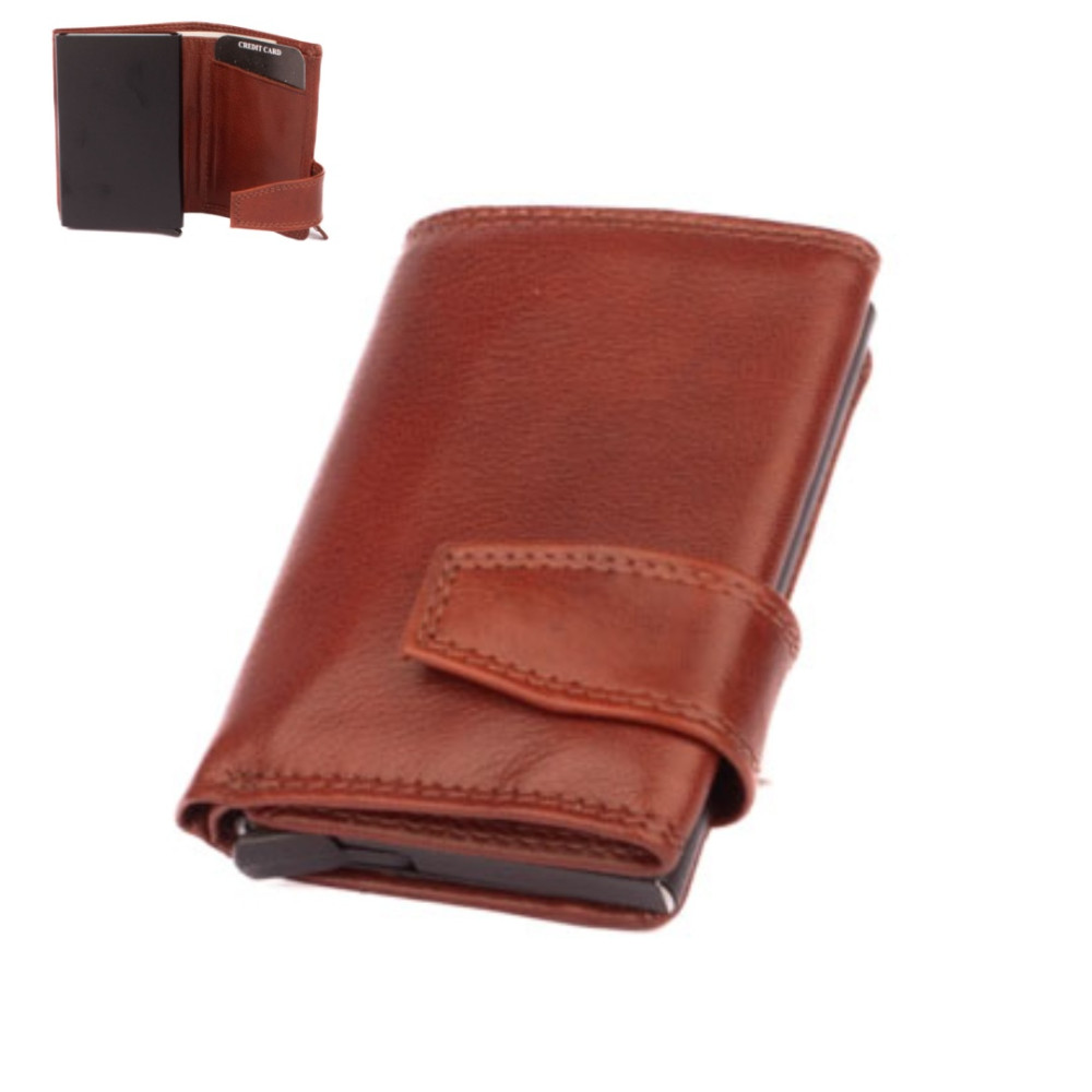 Hnědé pouzdro na karty s vysouvacím mechanismem v koženém obalu. Pouzdro se uzavírá přezkou s pevným drukem. Po otevření pouzdra je na levé straně v klopě hliníkový obal, který slouží k uložení karet. Karty nastrkáte do hliníkového obalu a zatlačíte dovnitř. Pro jejich vysunutí zmáčknete páčku na dolní straně pouzdra. Karty všechny vyjedou ale tak, že každá se povysune o kousek dál něž ta předchozí. Pohodlně z pouzdra na karty vyndáte jen tu jednu kartu, kterou potřebujete. Uvnitř pouzdra jsou další kapsy na karty. Nad nimi je kapsa na bankovky. Všechny české bankovky se vejdou bez přehnutí. Z venku pouzdra na zadní straně je mincovník uzavíráním na zip. Hnědé pouzdro na karty je vyrobené z pravé kůže hnědé barvy a je dodáváno bez dárkové krabičky. Pouzdro má ochranu karet proti čtení technologií RFID. Pouzdro lze využít i jako malou peněženku.