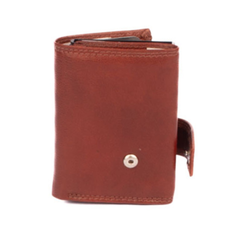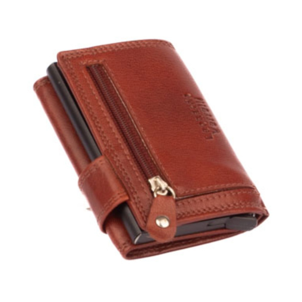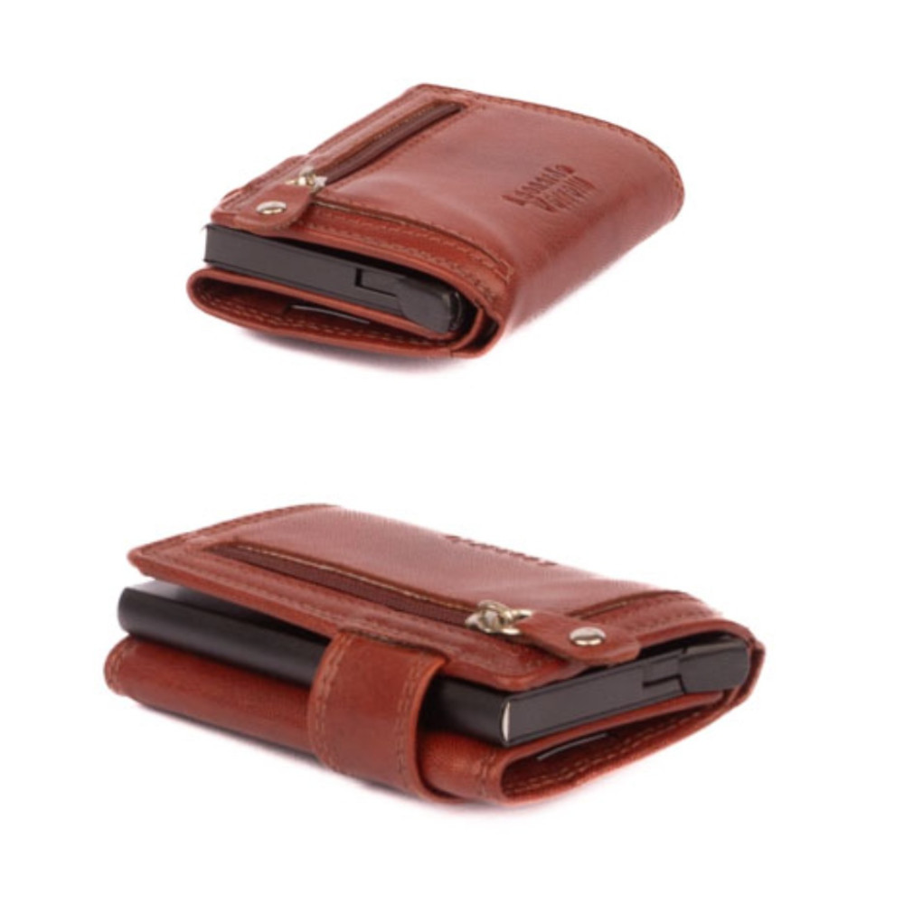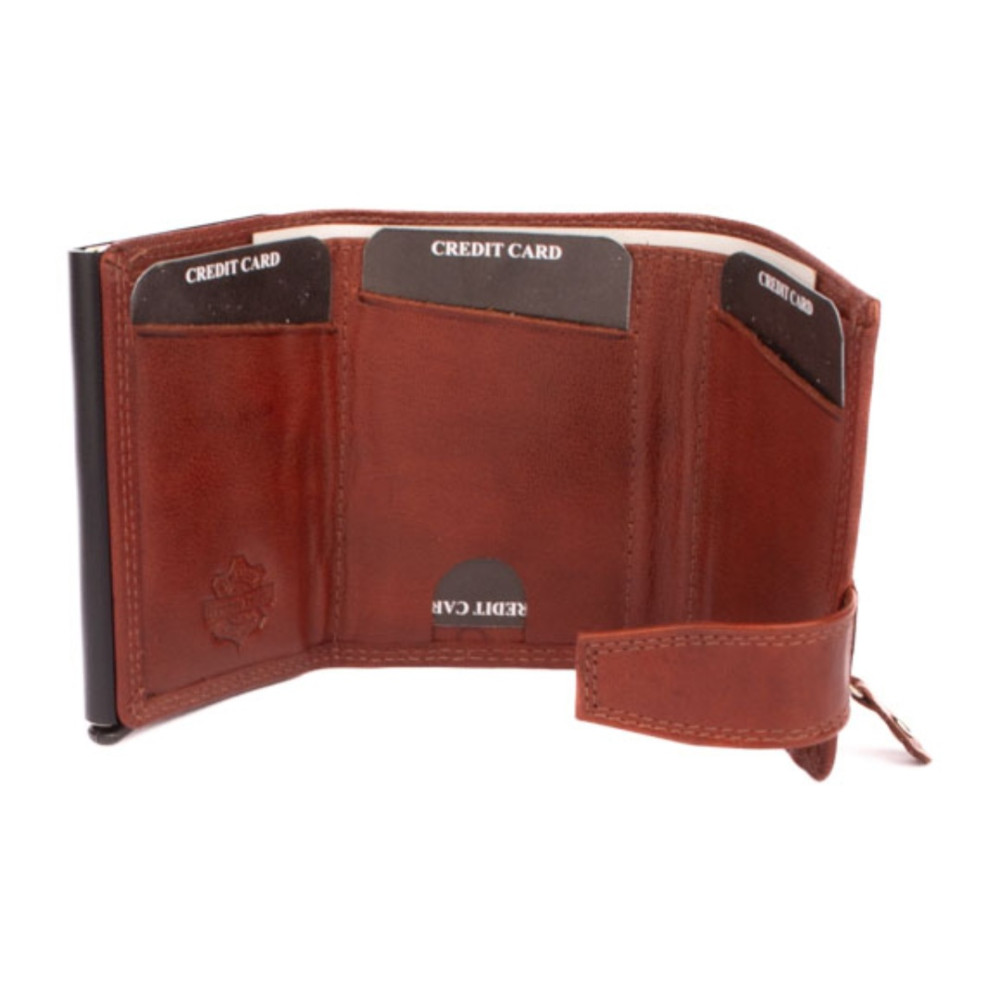 Hnědé pouzdro na karty s vysouvacím mechanismem v koženém obalu. Pouzdro se uzavírá přezkou s pevným drukem. Po otevření pouzdra je na levé straně v klopě hliníkový obal, který slouží k uložení karet. Karty nastrkáte do hliníkového obalu a zatlačíte dovnitř. Pro jejich vysunutí zmáčknete páčku na dolní straně pouzdra. Karty všechny vyjedou ale tak, že každá se povysune o kousek dál něž ta předchozí. Pohodlně z pouzdra na karty vyndáte jen tu jednu kartu, kterou potřebujete. Uvnitř pouzdra jsou další kapsy na karty. Nad nimi je kapsa na bankovky. Všechny české bankovky se vejdou bez přehnutí. Z venku pouzdra na zadní straně je mincovník uzavíráním na zip. Hnědé pouzdro na karty je vyrobené z pravé kůže hnědé barvy a je dodáváno bez dárkové krabičky. Pouzdro má ochranu karet proti čtení technologií RFID. Pouzdro lze využít i jako malou peněženku.
