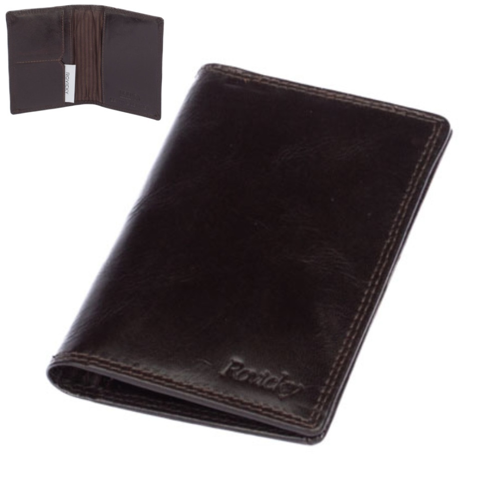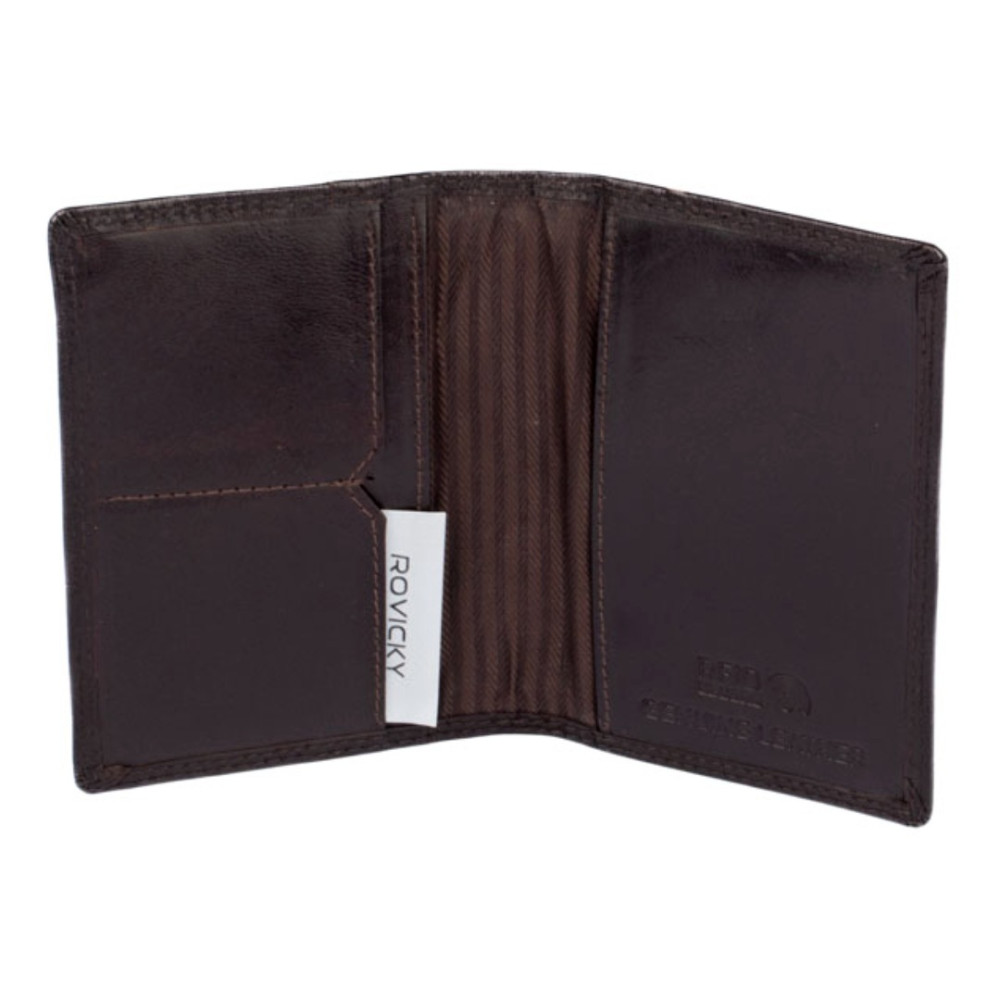 Praktické pouzdro na karty z kůže tmavě hnědé barvy. Pouzdro má jednu velkou kapsu pro uložení bankovek. Na boční straně pouzdra jsou dvě kapsy na karty, za nimi je ještě jedna tenká kapsa. Pouzdro je značky Rovicky a je dodáváno v dárkové krabičce.