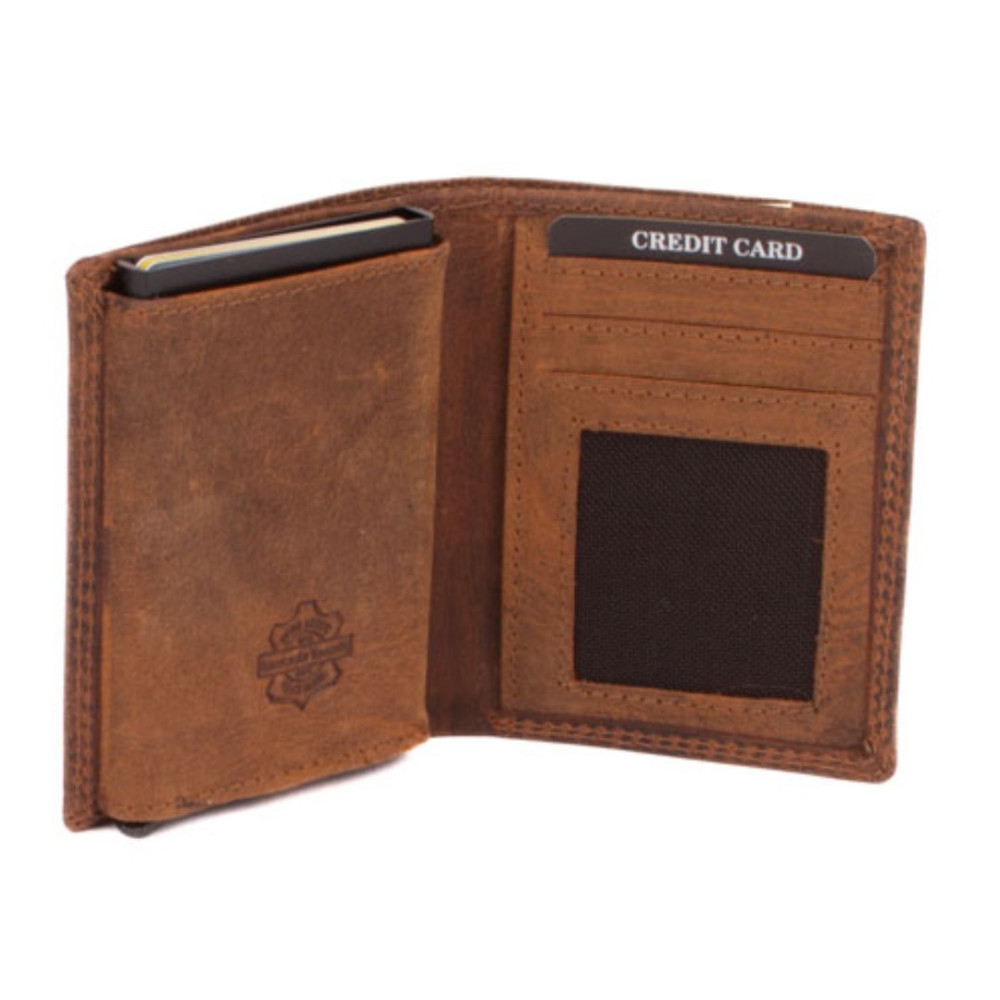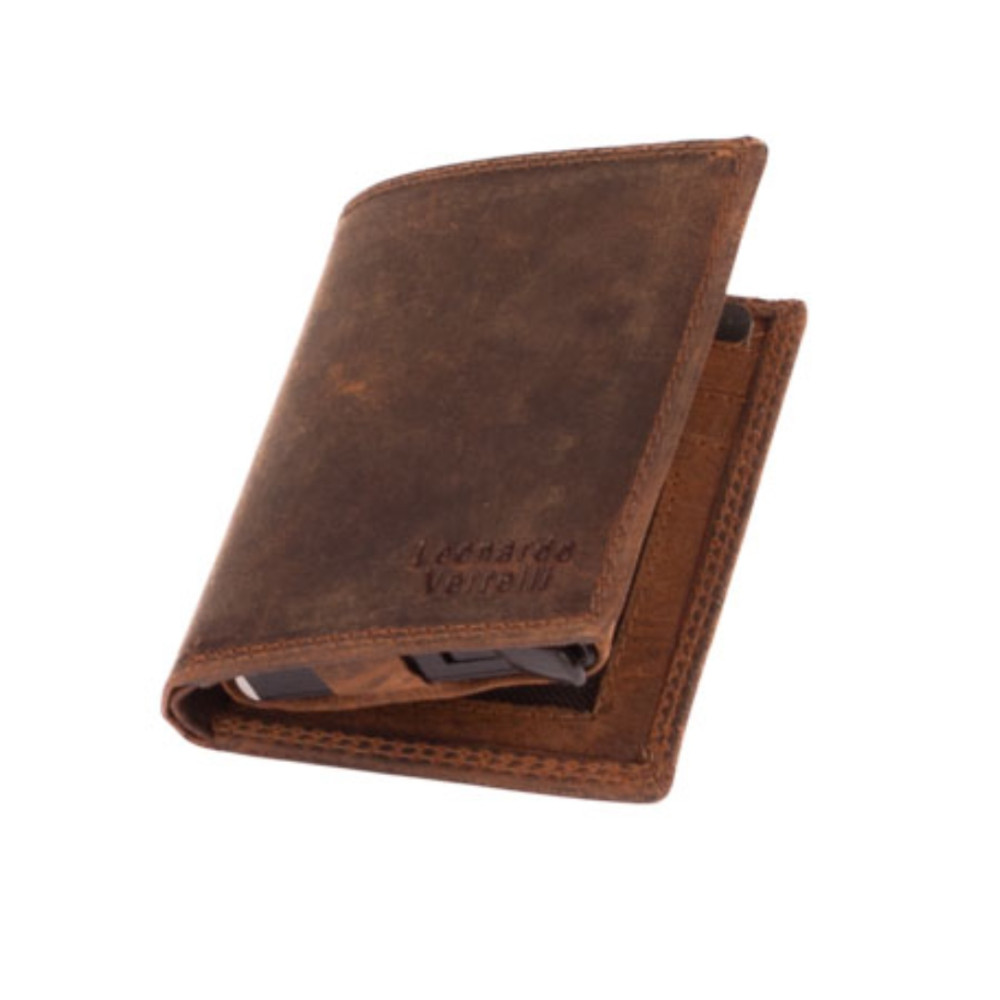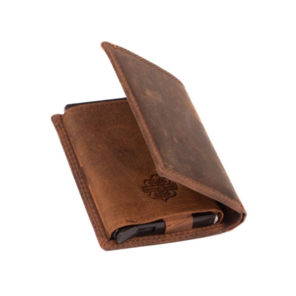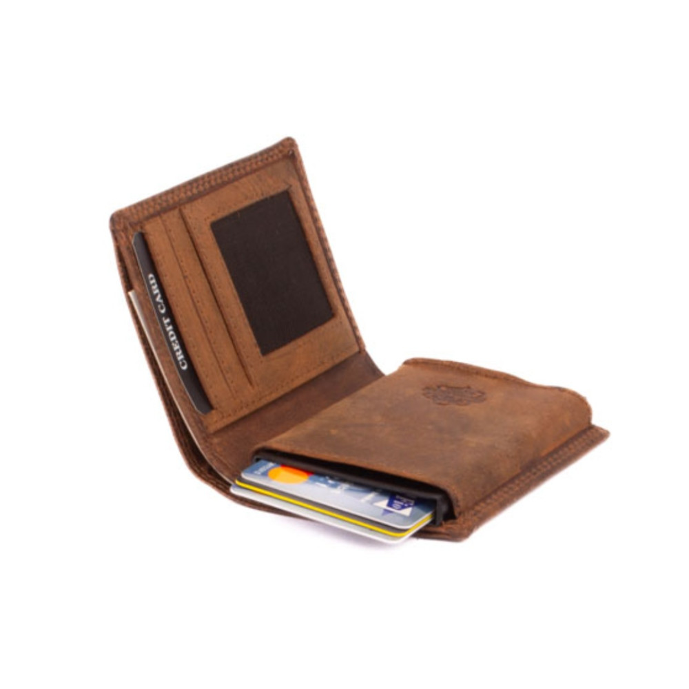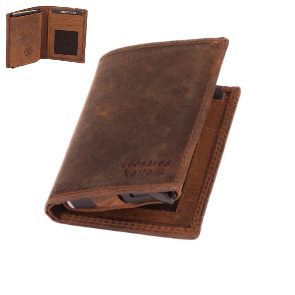 Luxusní kožené velké pouzdro na karty s vysouvacím mechanismem v koženém obalu. Po otevření pouzdra je na levé straně v kožené kapse hliníkový obal, který slouží k uložení karet. Karty nastrkáte do hliníkového obalu a zatlačíte dovnitř. Pro jejich vysunutí zmáčknete páčku na dolní straně pouzdra. Karty všechny vyjedou ale tak, že každá se povysune o kousek dál něž ta předchozí. Pohodlně z pouzdra na karty vyndáte jen tu jednu kartu, kterou potřebujete. Tajné věci můžete schovat do dvou tenkých kapes uvnitř pouzdra. Na pravé straně uvnitř pouzdra jsou další kapsy na karty, jedna průhledná. Nad nimi je kapsa na bankovky. České bankovky do hodnoty 200 Kč se vejdou bez přehnutí. Luxusní kožené velké pouzdro na karty je vyrobené z pravé kůže hnědé barvy a je dodáváno bez dárkové krabičky. Pouzdro má ochranu karet proti čtení technologií RFID. Pouzdro lze využít i jako malou peněženku.