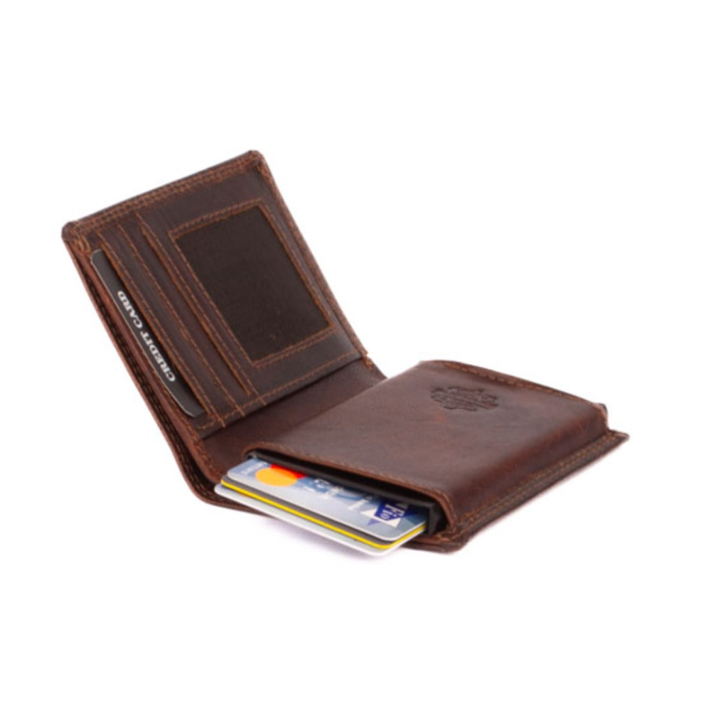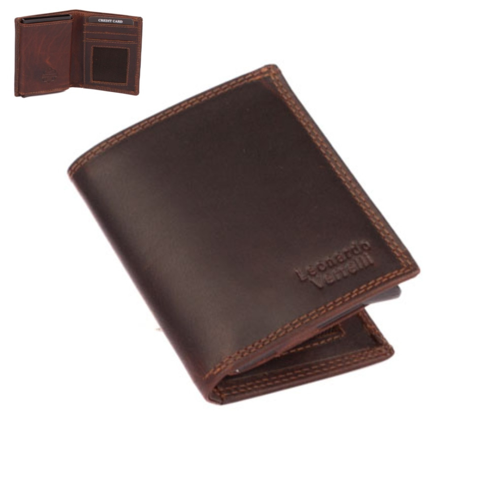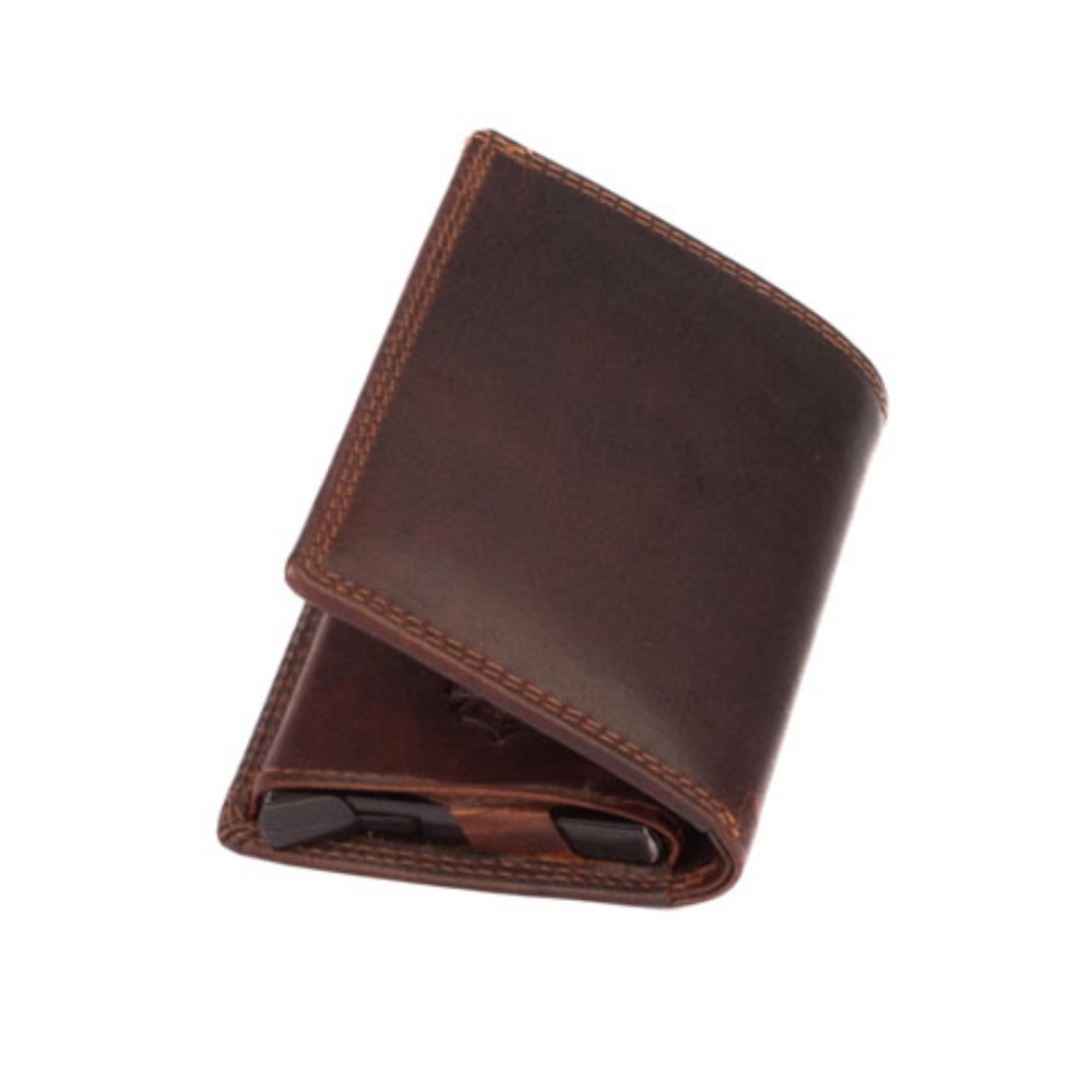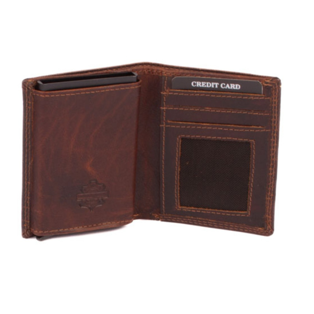 Pouzdro na karty kovové s vysouvacím mechanismem v koženém obalu. Po otevření pouzdra je na levé straně v kožené kapse hliníkový obal, který slouží k uložení karet. Karty nastrkáte do hliníkového obalu a zatlačíte dovnitř. Pro jejich vysunutí zmáčknete páčku na dolní straně pouzdra. Karty všechny vyjedou ale tak, že každá se povysune o kousek dál něž ta předchozí. Pohodlně z pouzdra na karty vyndáte jen tu jednu kartu, kterou potřebujete. Tajné věci můžete schovat do dvou tenkých kapes uvnitř pouzdra. Na pravé straně uvnitř pouzdra jsou další kapsy na karty, jedna průhledná. Nad nimi je kapsa na bankovky. České bankovky do hodnoty 200 Kč se vejdou bez přehnutí. Pouzdro na karty kovové je vyrobené z pravé kůže hnědé barvy a je dodáváno bez dárkové krabičky. Pouzdro má ochranu karet proti čtení technologií RFID. Pouzdro lze využít i jako malou peněženku.