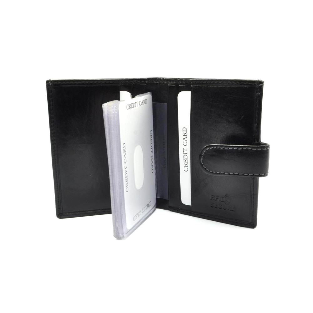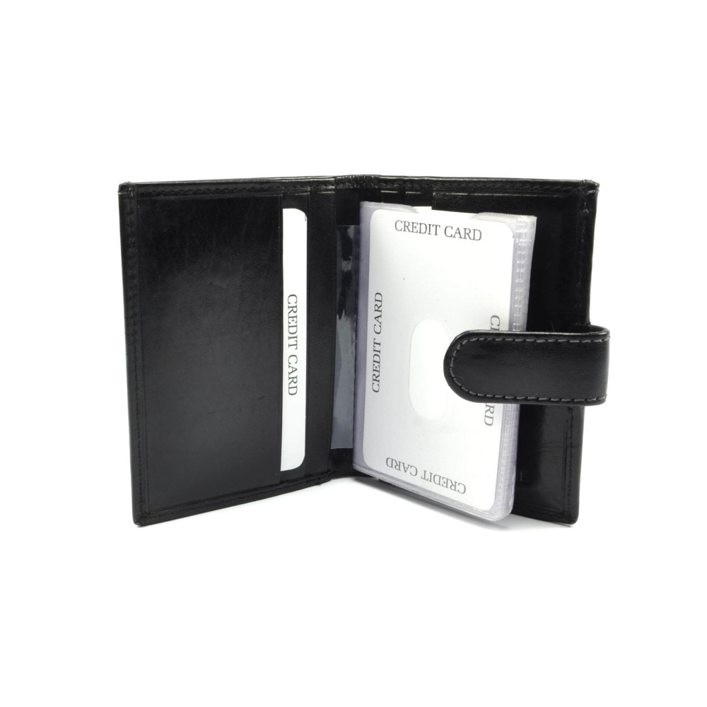 Černé pouzdro na karty luxusní bez loga z pravé kůže. Chcete obyčejné ale praktické pouzdro na karty a bankovky? Pak toto je správná volba. Pouzdro má dostatek kapes na karty z průhledného plastu i několik kožených kapes na boku pouzdra. V pouzdře je i kapsa na bankovky. Navíc pouzdro není zdobeno žádným logem výrobce. Pouzdro má černou barvu a je vyrobené z pravé kůže.