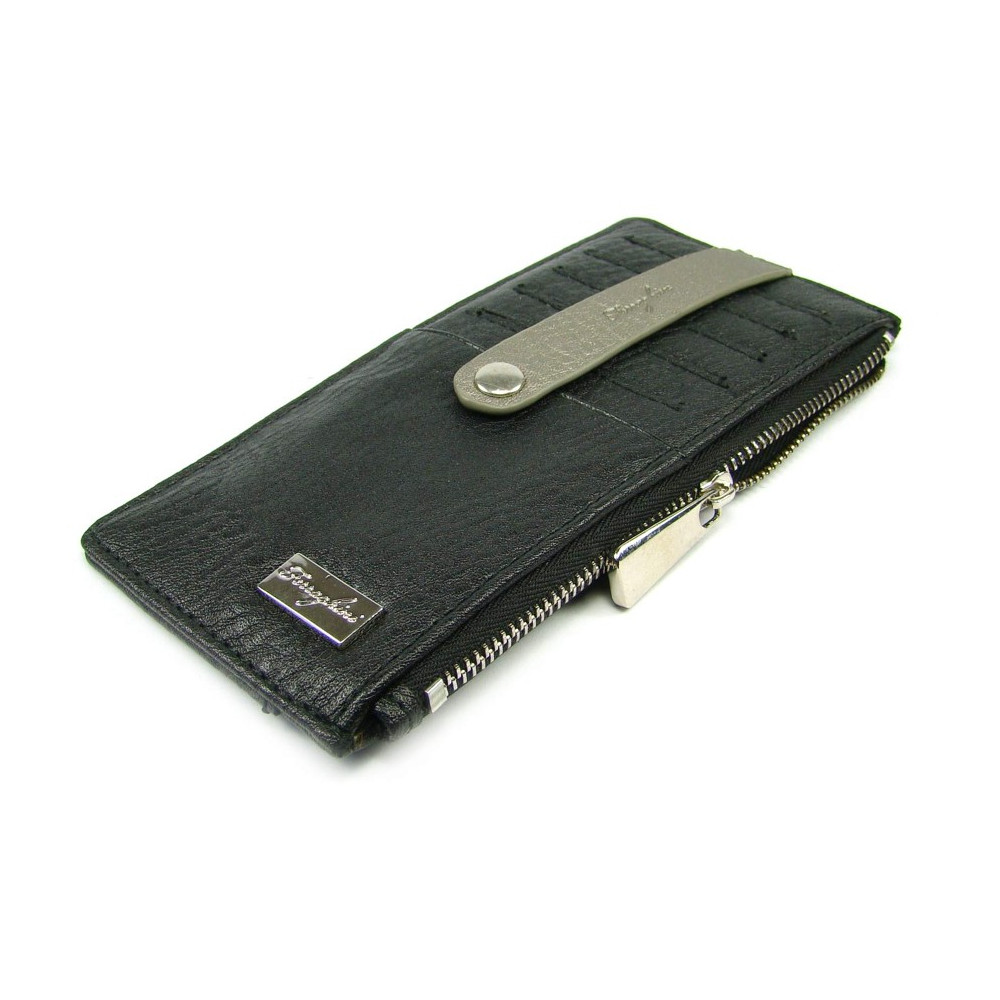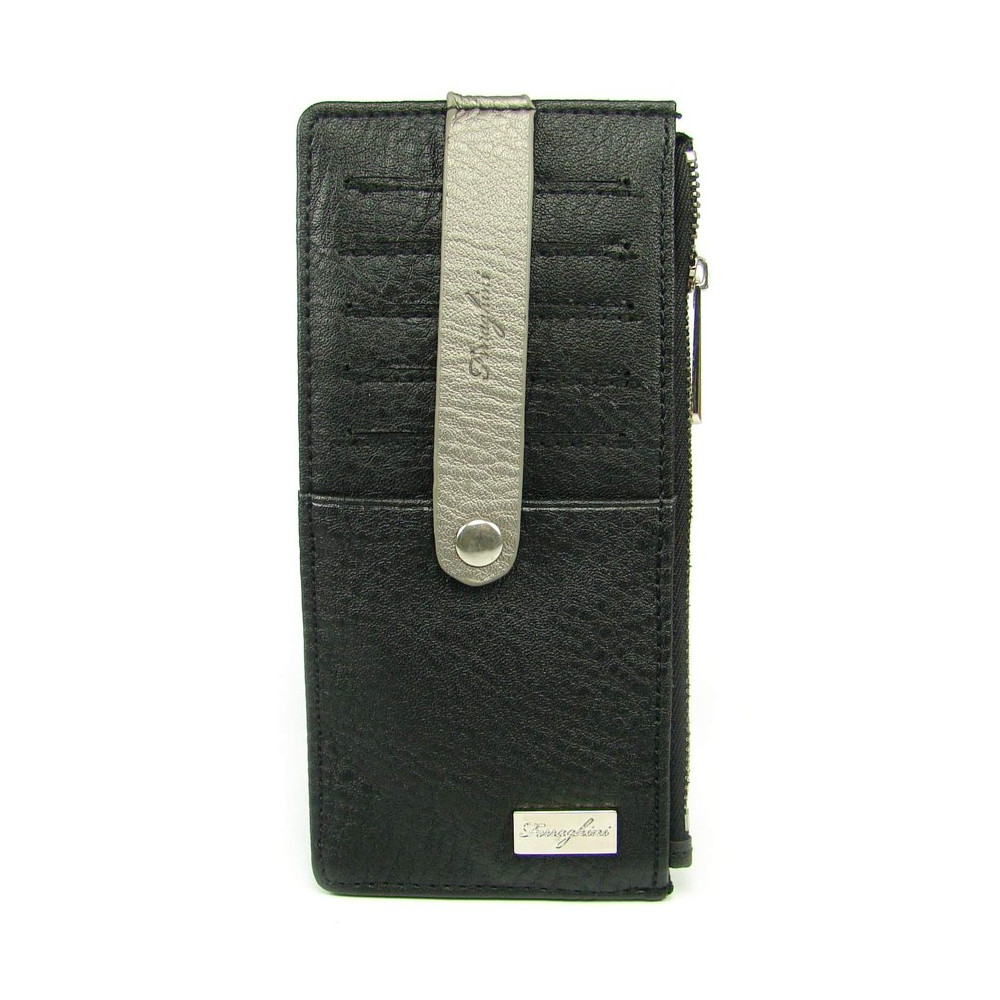 Pouzdro na karty velké z umělé kůže uzavíratelné přezkou šedé barvy. Pouzdro má další velkou kapsu na zadní straně. V pouzdře je velká kapsa uzavíratelná masivním zipem.